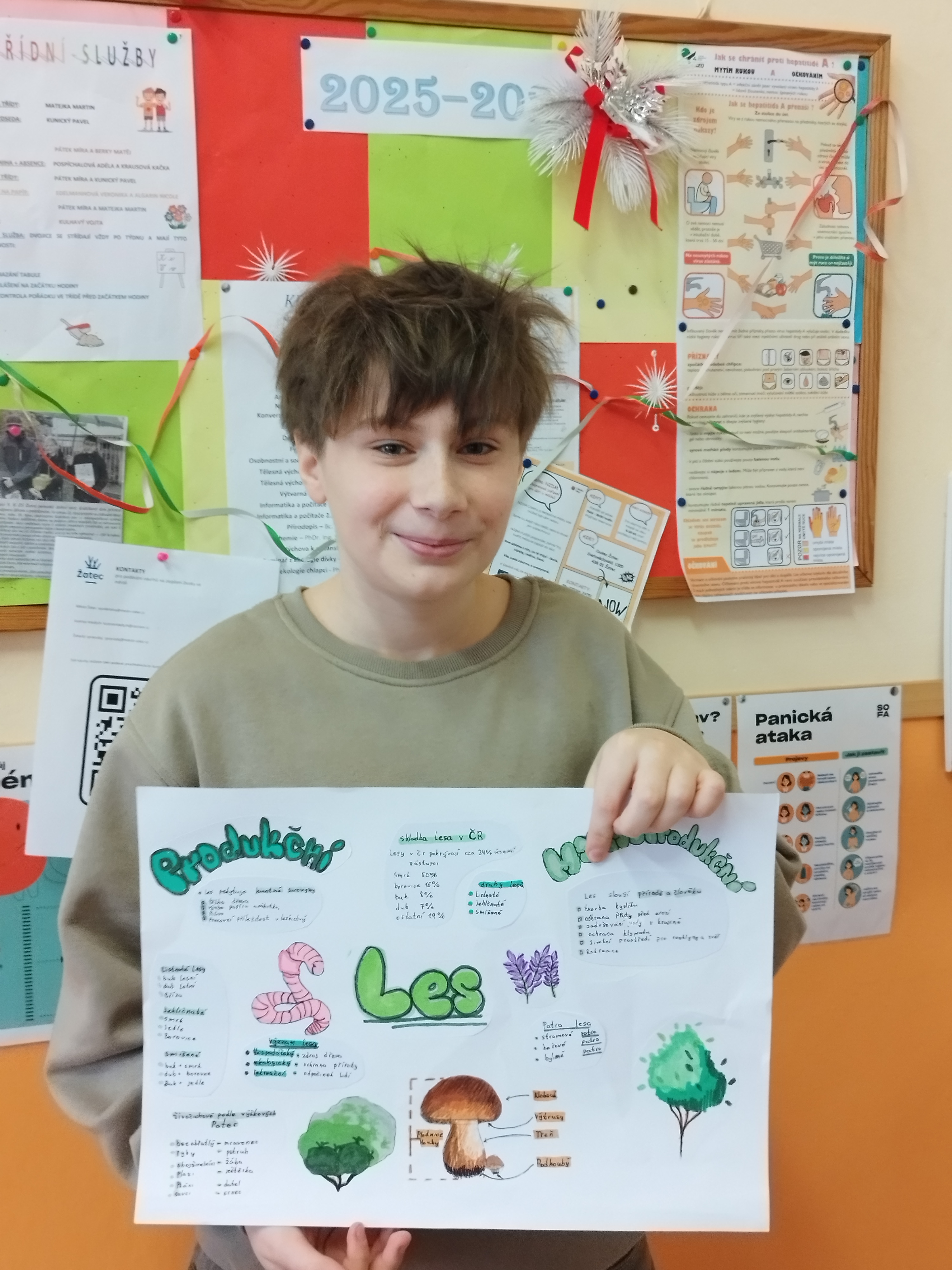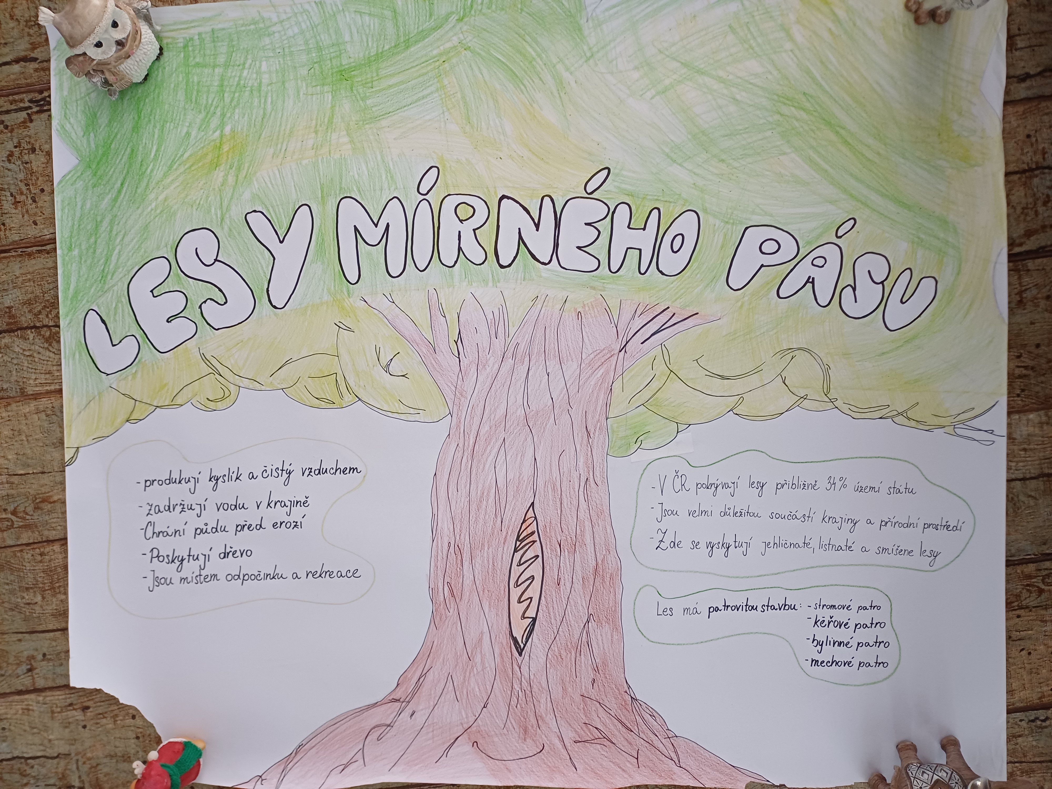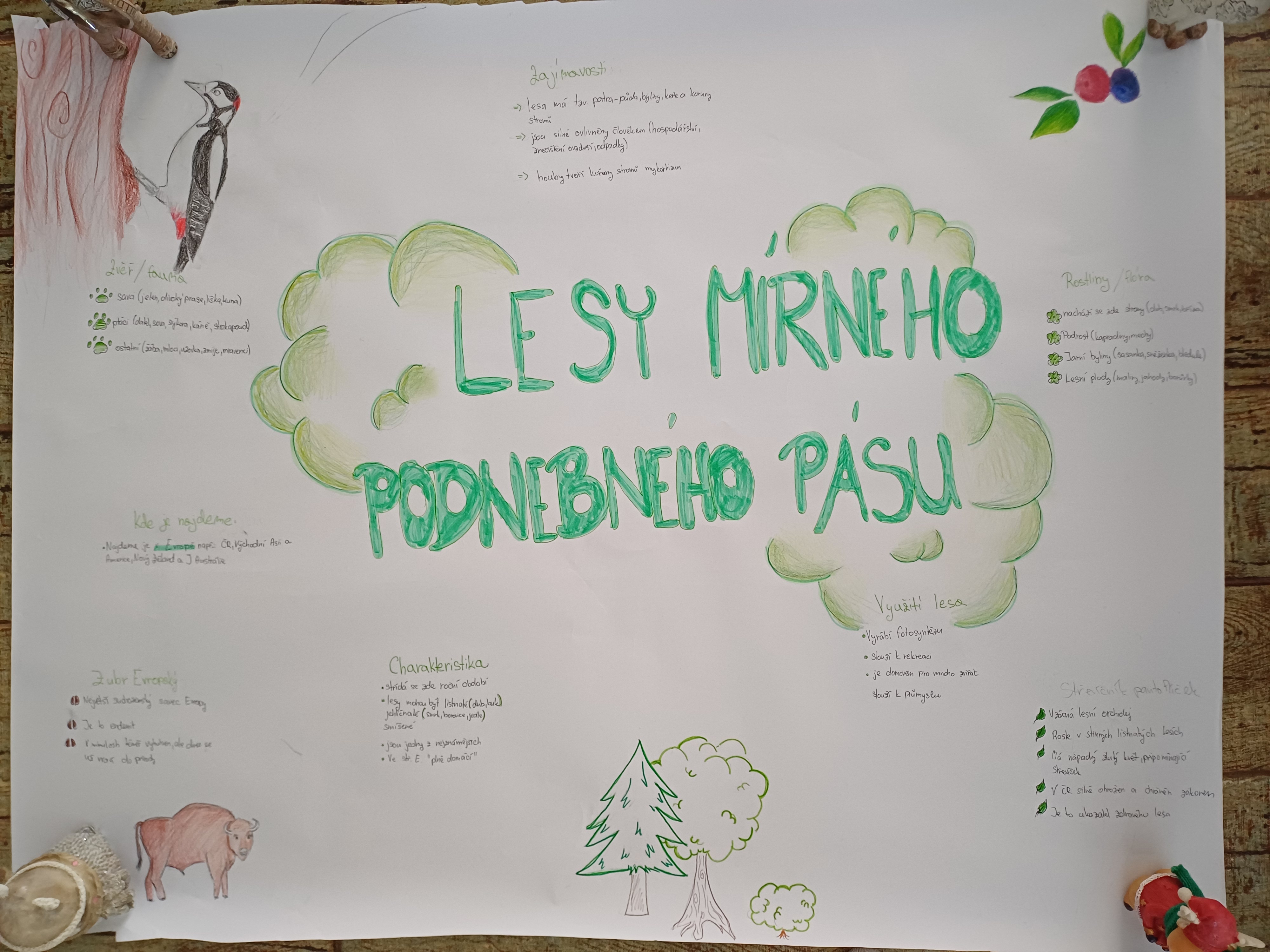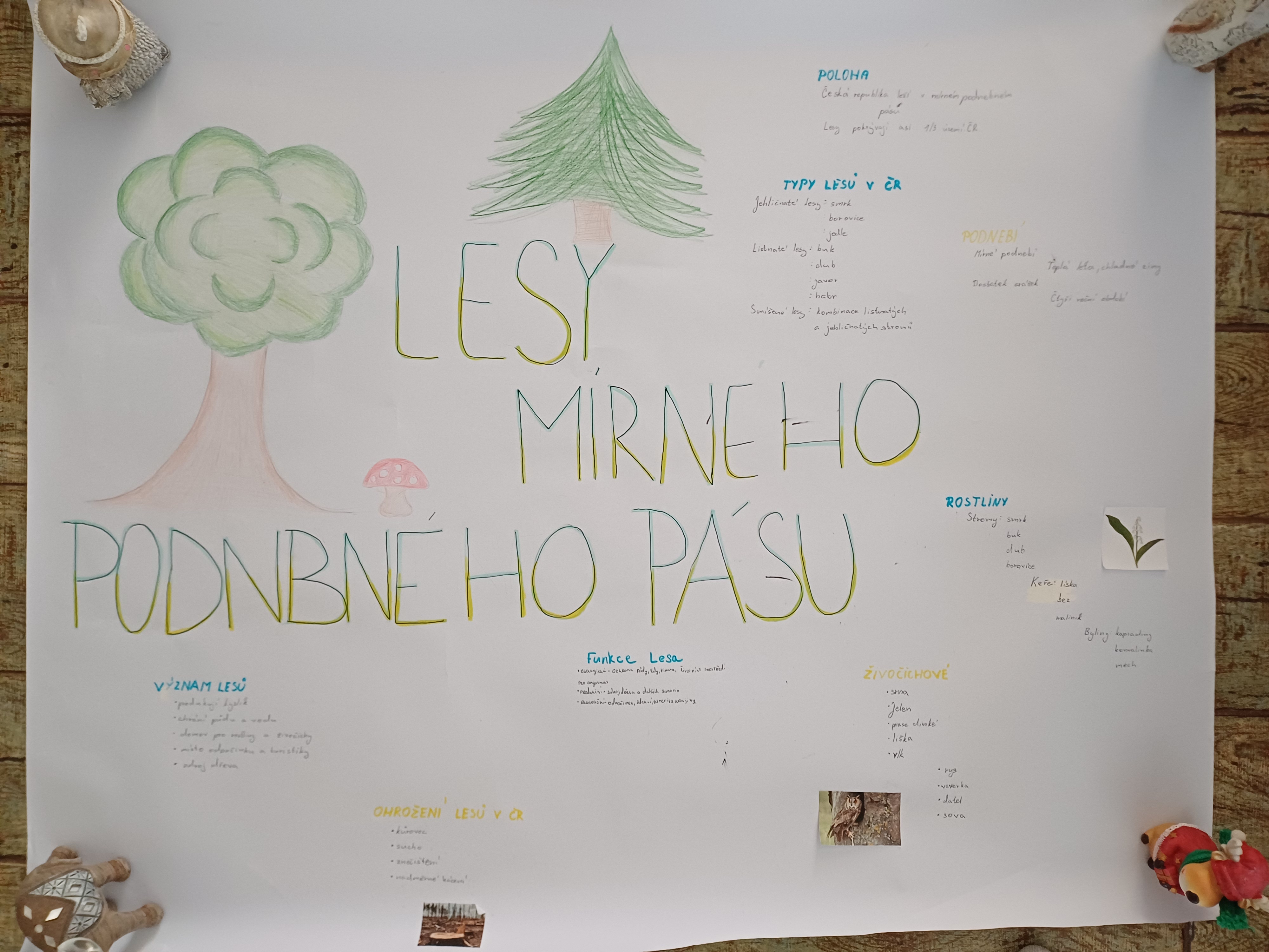 V zeměpise charakterizovali lesy mírného podnebného pásu, resp. typickou vegetaci, stromy, zvířata, geografické rozšíření, vliv klimatu a dopad člověka. Dále řešili problematiku přizpůsobení různých typů lesa daným oblastem, a to na základě teplot, srážek a nadmořské výšky.