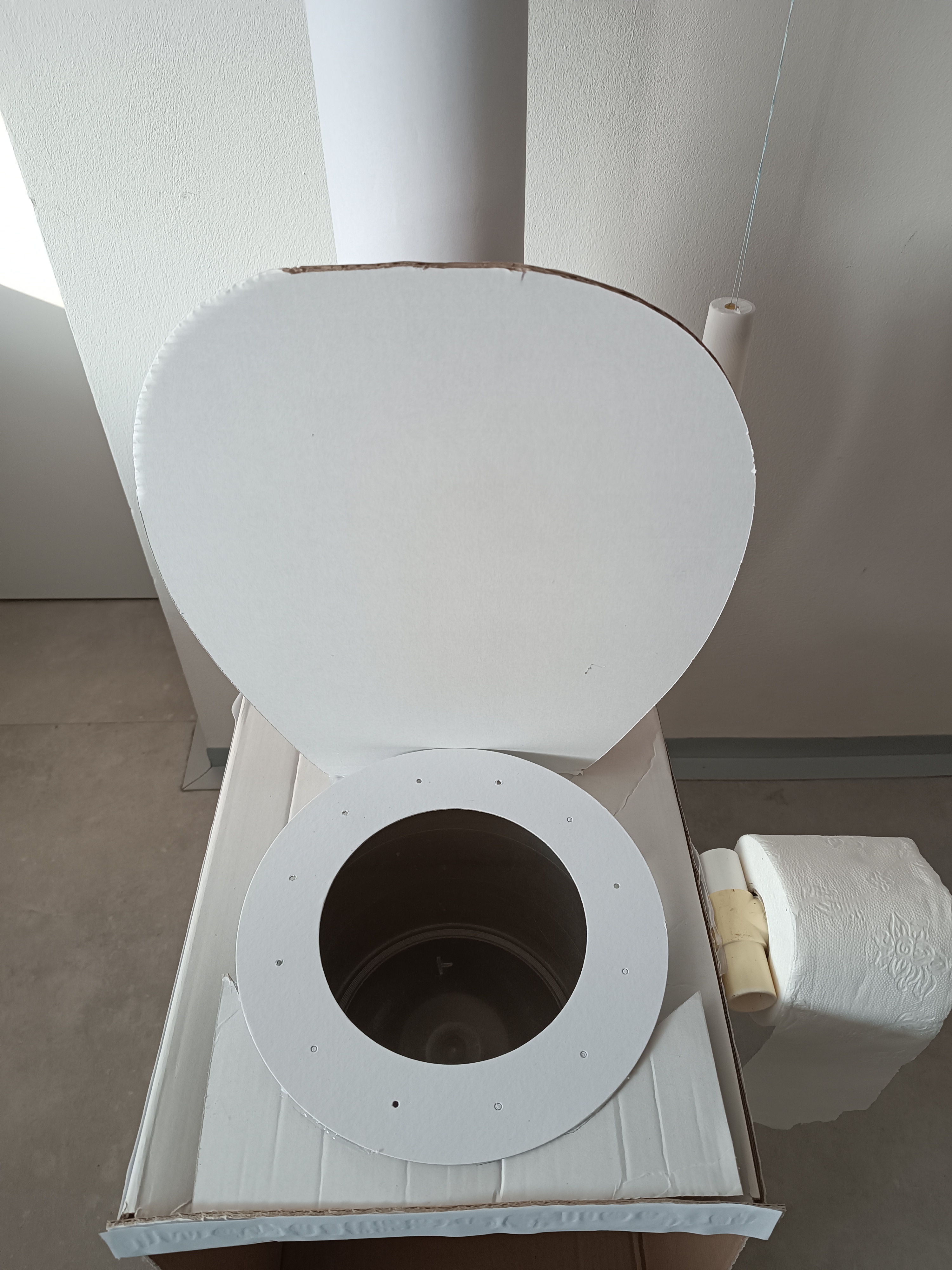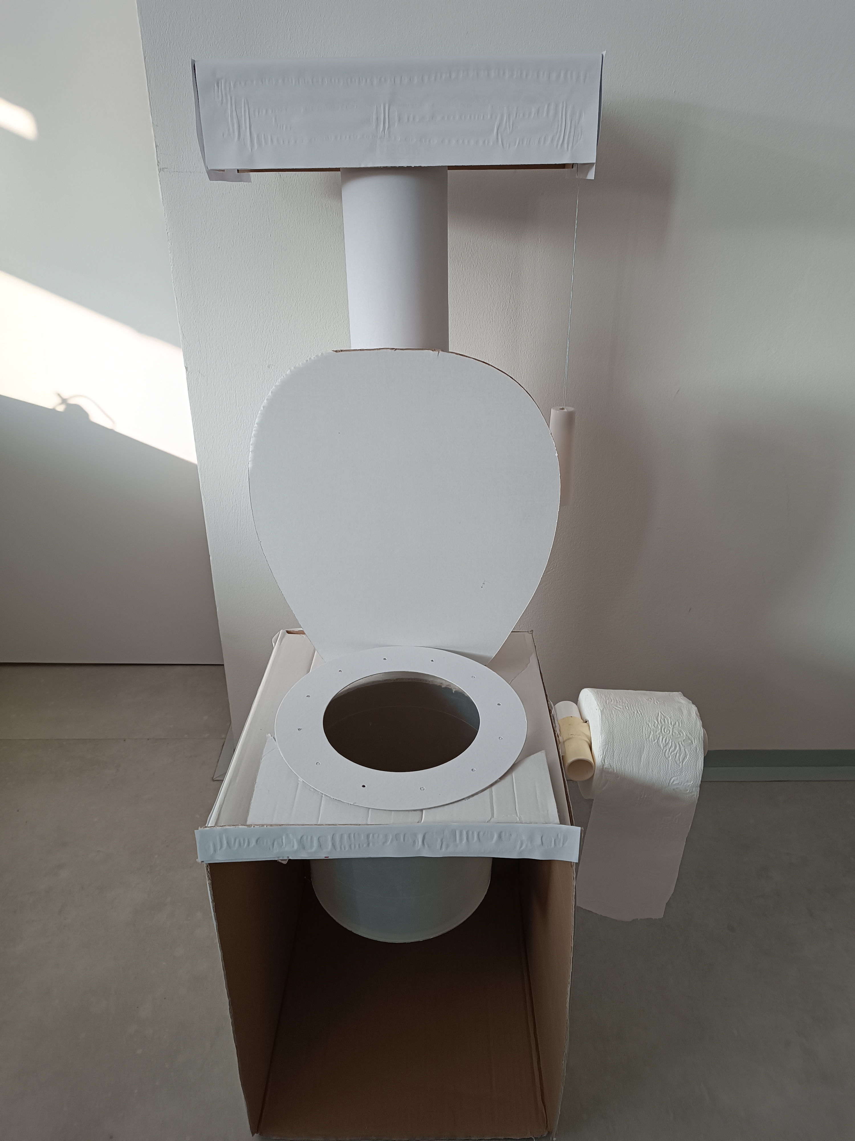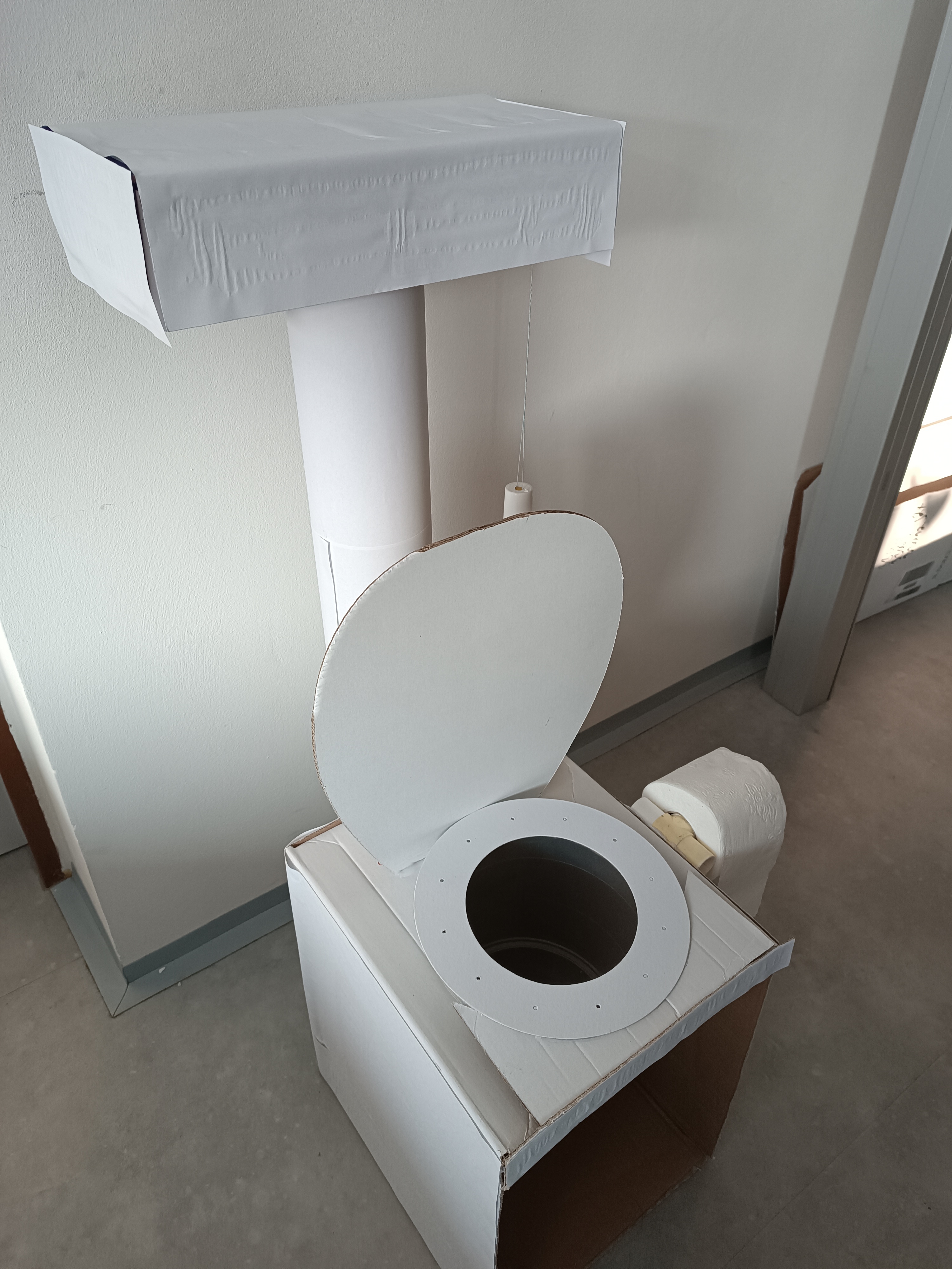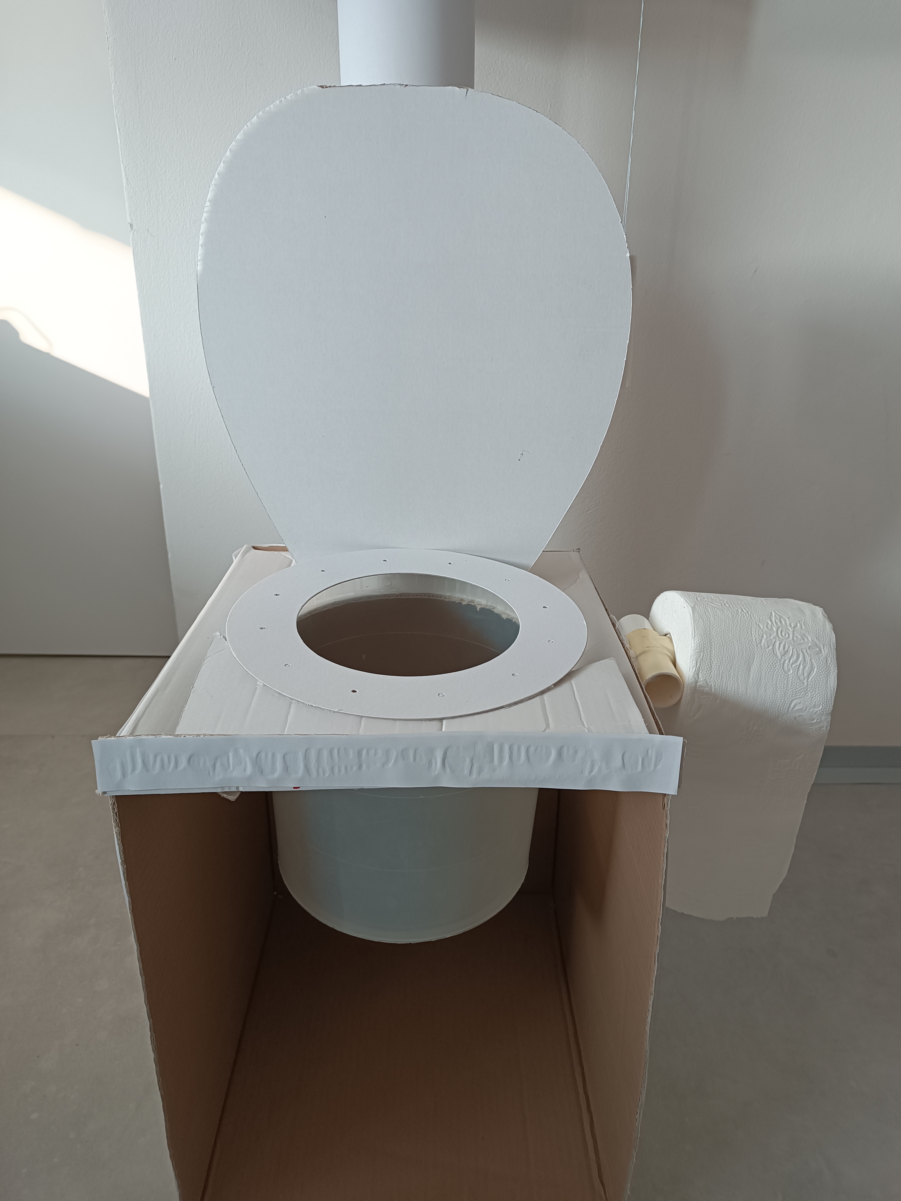 První část pomůcky k novému úkolu. Nechtěli jsme s Družínky jako osvětu k tomu co do záchodu patří a nepatří použít například plakát,ale chtěli jsme něco názorného. Proto jsme z kartonových krabic, kartonové role a plastových částí vyrobili záchod, který pak následně doplníme tím,co splachovat můžeme a co naopak nemůžeme.