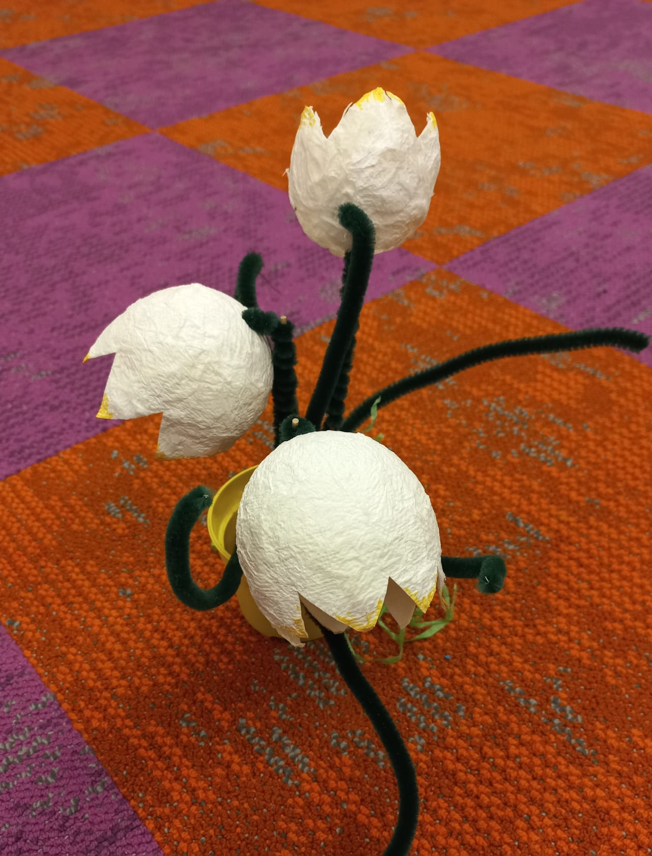 Postup: na nafouknuté balónky jsme pomocí lepidla nalepili v několika vrstvách papírové utěrky. Poté nechali uschnout. Po zaschnutí vystřihli tvar květu, přidali chluatý drátek jako stonek a zasadili do květináče.