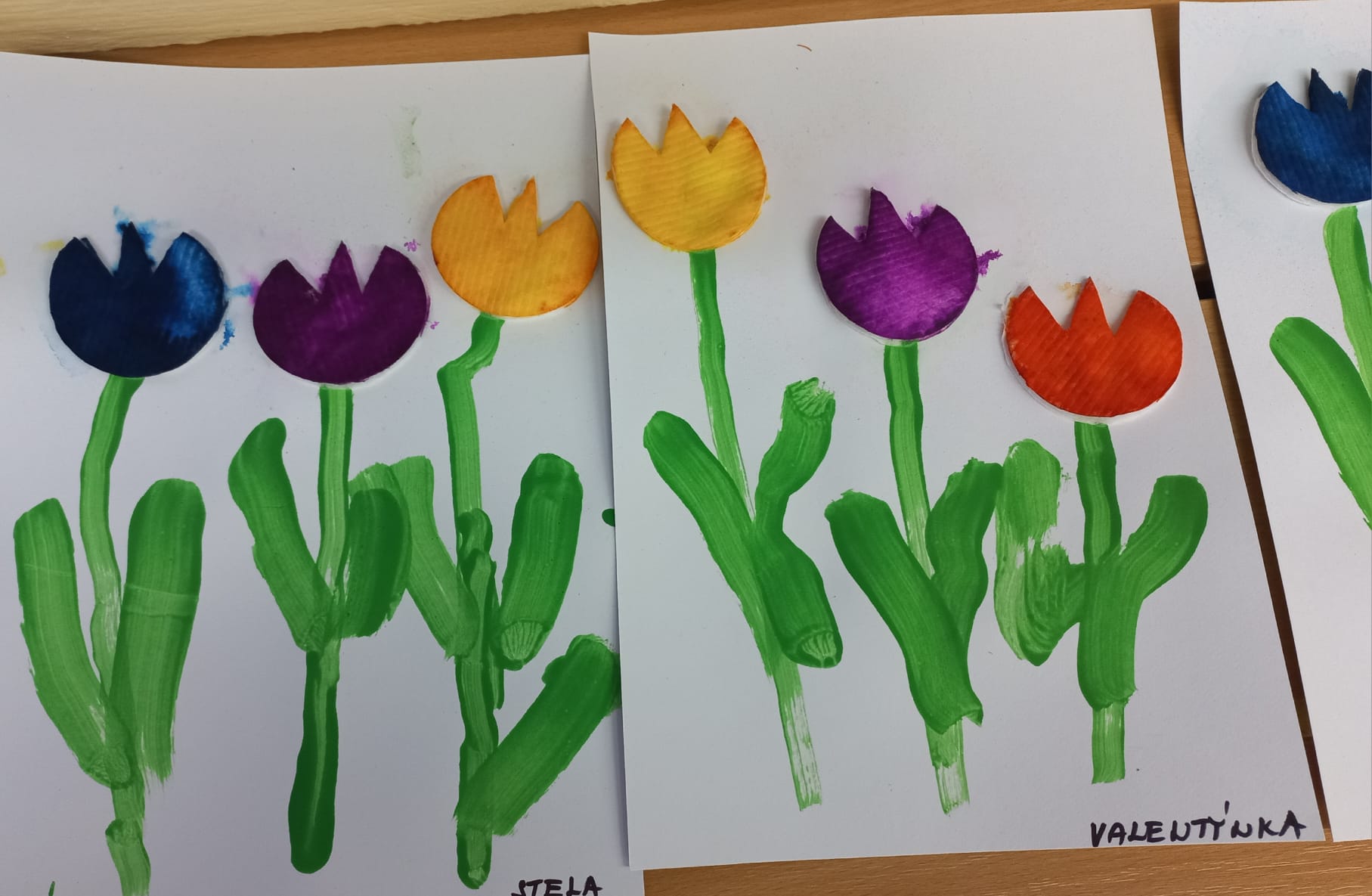 Tulipány jsou symbolem jara a nám tulipány zdobí naší školku. Materiál: vatové tampony, barvy, lepidlo, čtvrtky.