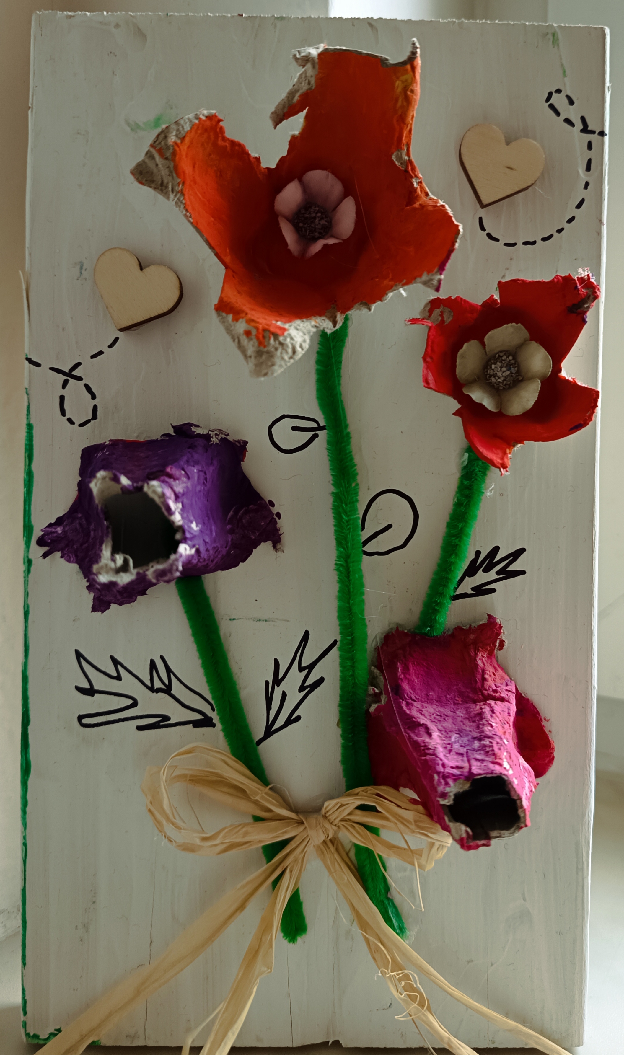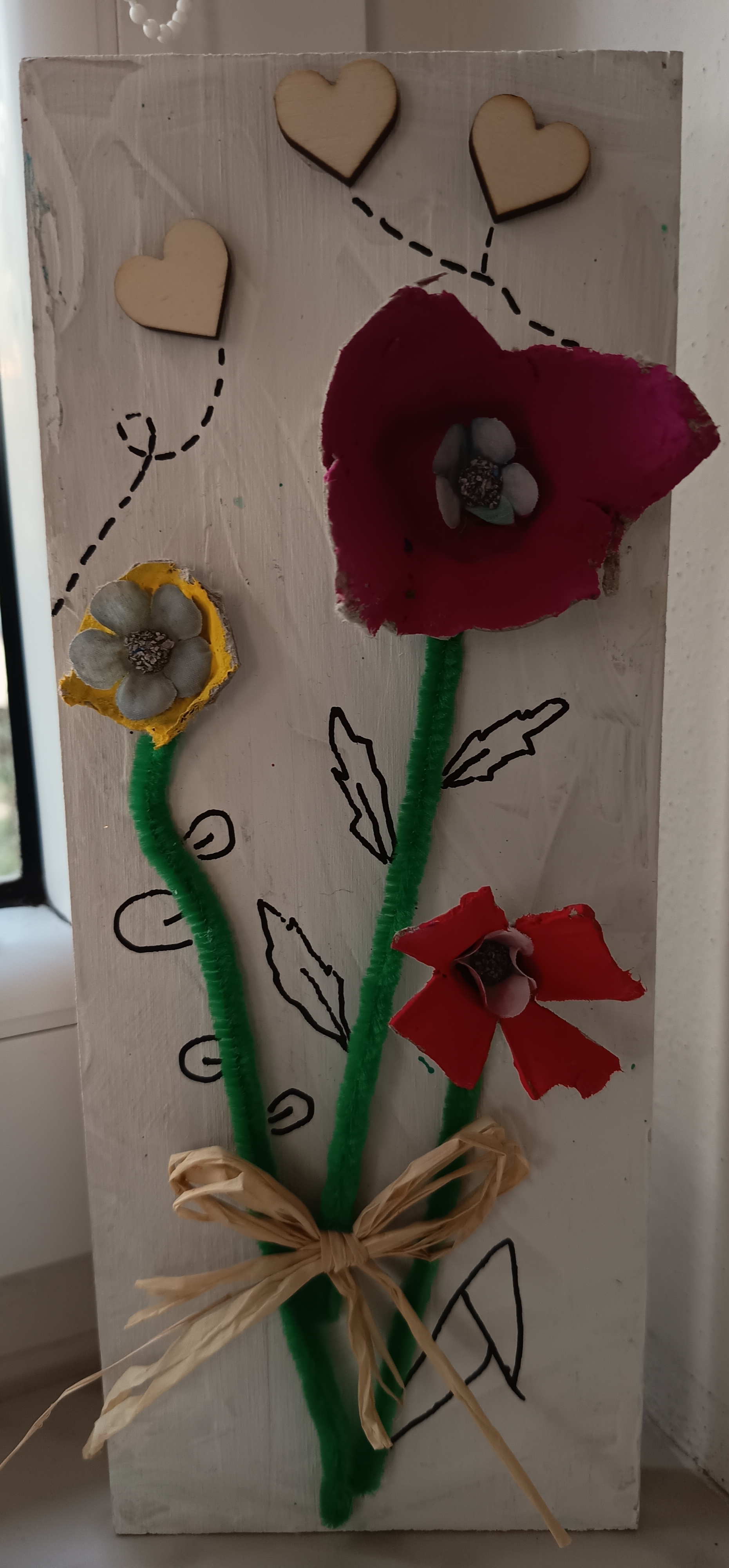 Žáci si ze složek od vajíček vystřihli jednotlivé části, které dotvarovali do podoby květů. Ty následně nabarvili temperami podle vlastní fantazie. Po zaschnutí květy nalepili na dřevěnou desku a doplnili dalšími detaily (např. stonky, listy). Hotové práce posloužily jako jarní dekorace, v květnu tento výrobek obdrží maminky u příležitosti svátku matek.
