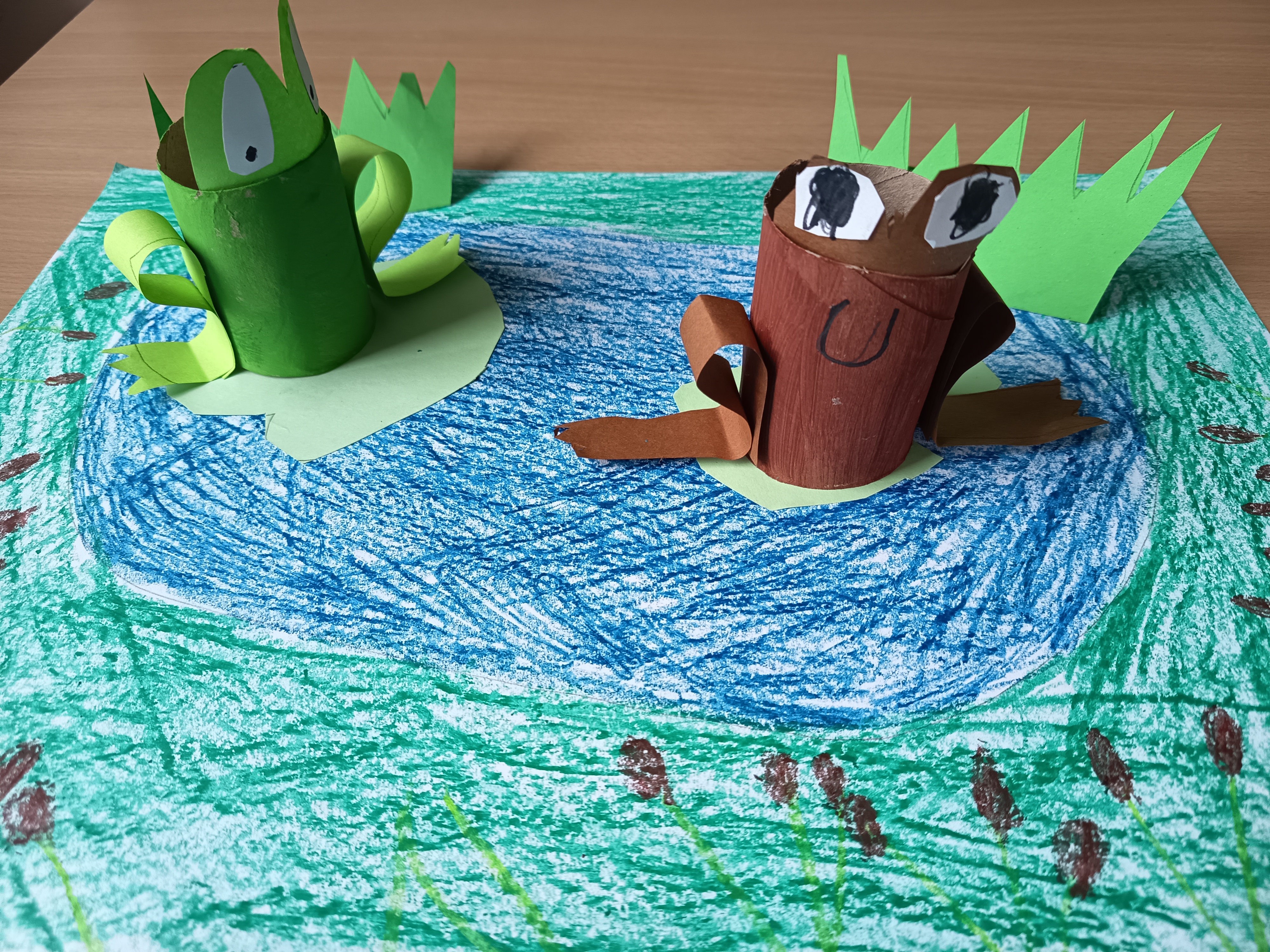 Cílem aktivity bylo podporovat tvořivost, představivost a jemnou motoriku žáků při práci s recyklovaným materiálem a rozvíjet jejich vztah k přírodě. Postup: Žáci využili ruličky od toaletního papíru, které podle potřeby upravili (zkrátili, ohnuli). Poté je nabarvili a dotvořili do podoby žabiček a dalších zvířátek žijících u vody. Pomocí papíru a dalších pomůcek přidali detaily, jako jsou oči, nohy nebo dekorace. Hotové výrobky byly součástí společné tematické výzdoby.