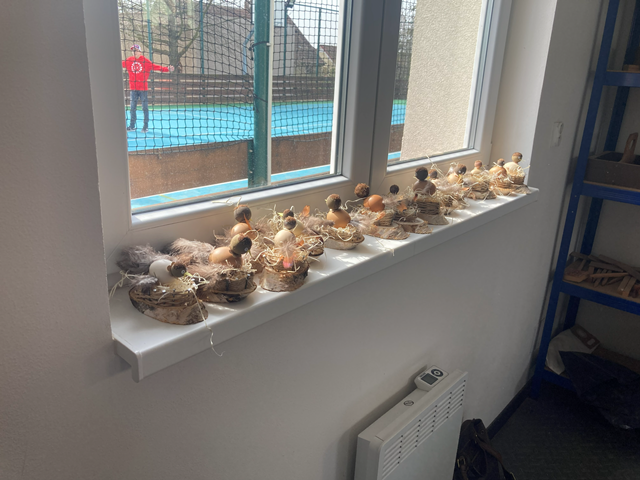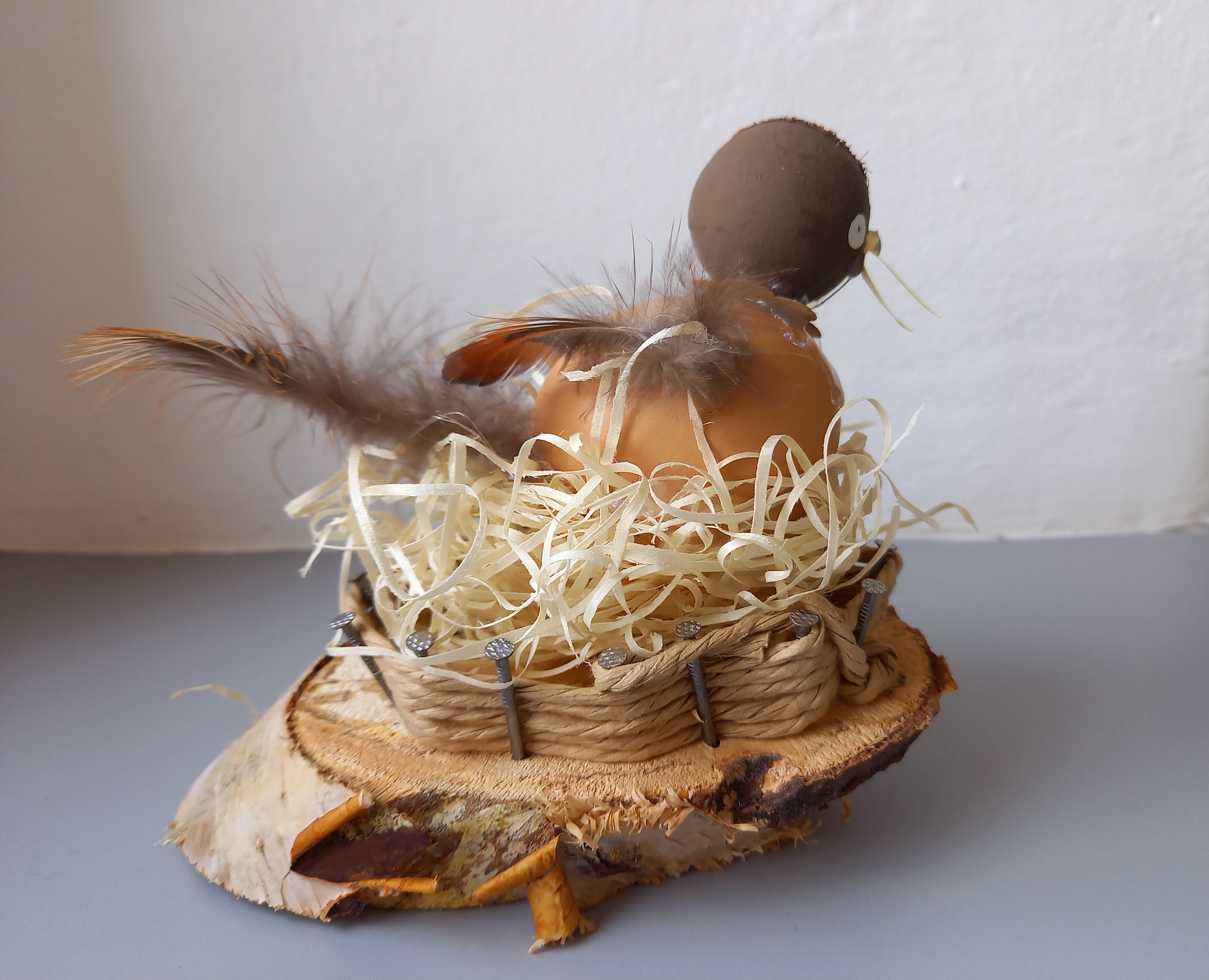 Ručně vyrobená dekorace z přírodních a běžně dostupných materiálů. Ptáček je vytvořen z vaječné skořápky a hlavy z lehkého materiálu, usazený v hnízdě z lýka a hoblin. Celek je připevněn na dřevěném podkladu. Cílem práce je vyrobit ptáčka z přírodních materiálů a naučit se pracovat pečlivě a bezpečně.