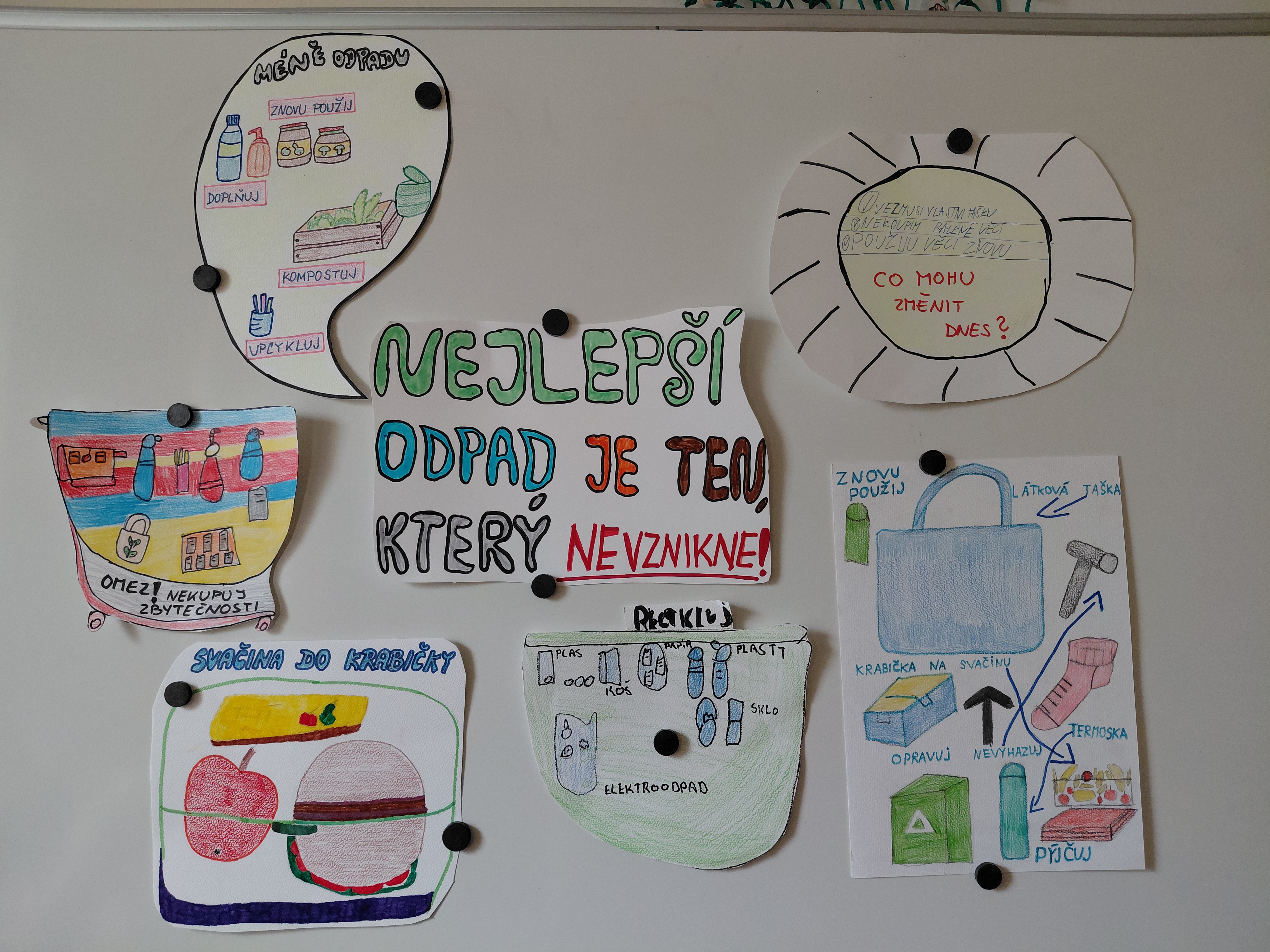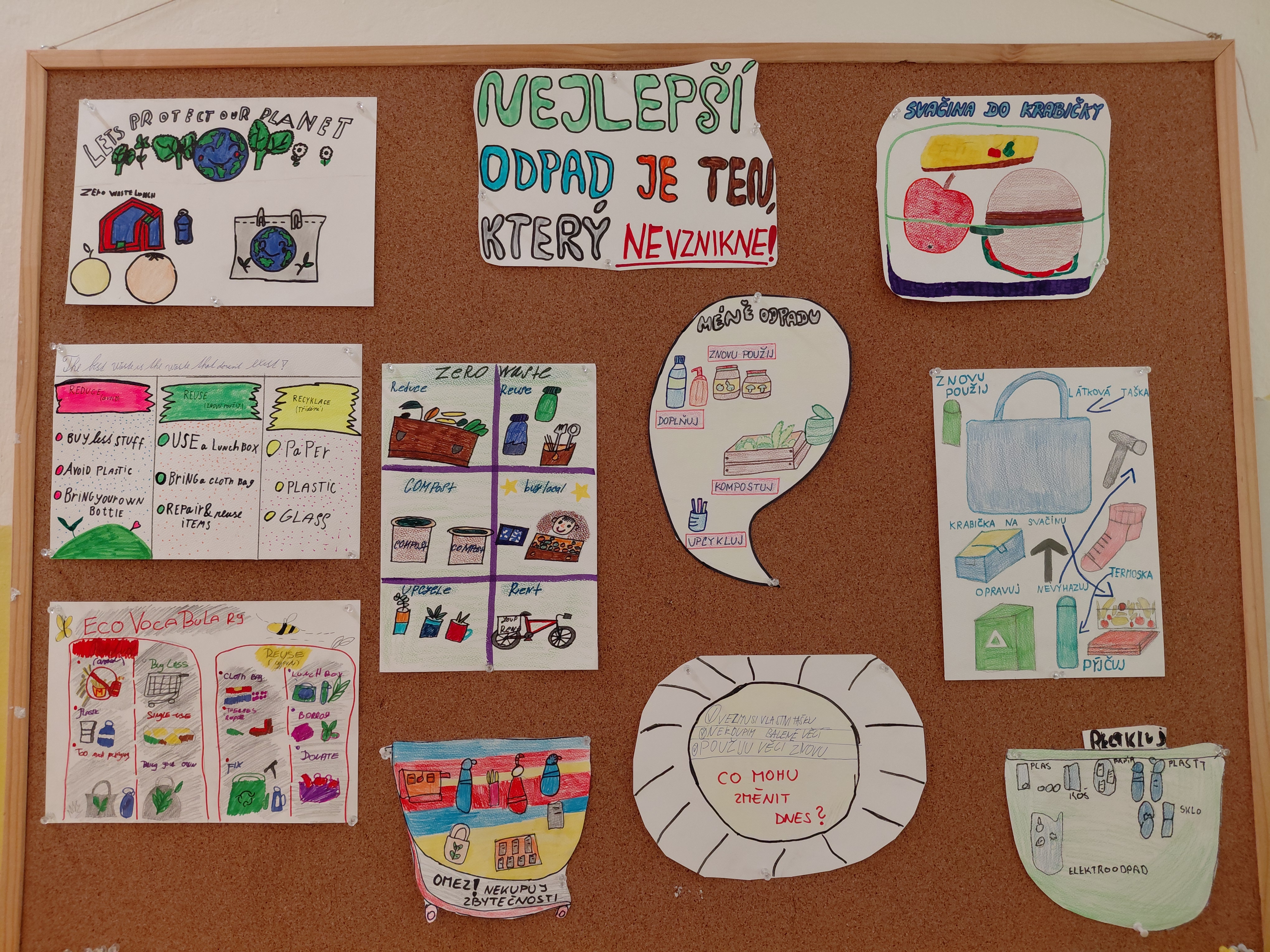Naši nejstarší žáci 9. ročníků se pustili do tvorby projektu na téma, jak můžeme snížit vznik odpadu. Aby téma bylo zajímavější, tak jsme se rozhodli vytvořit anglicko-český projekt. Žáci vyhledávali informace na internetu, tvořili ilustrace dle své fantazie a hlavně se zamysleli nad svým vlastním chováním. Projekt nám zdobí přízemí školy a každý žák či pedagog se může u nástěnky zastavit a dozvědět se něco nového. Také rodiče se mohou o tomto tématu dozvědět více na našich webových stránkách školy.