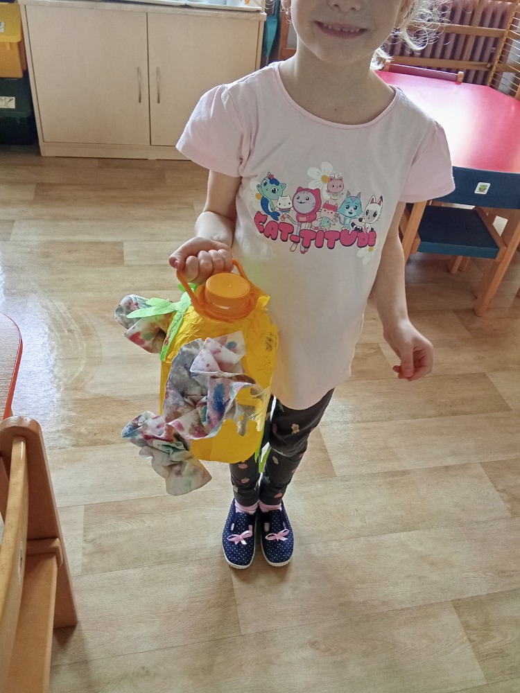 S dětmi jsme si při projektovém dni týkajícím se plánovaného otevření "nové školní zahrady" vyrobily "svatojánské lampy" - využily jsme plastové lahve od sirupů, které nám paní kuchařka schovala (lze využít i průhledné kanystry od čehokoliv). Na zbytky hedvábného papíru děti nakreslily různý hmyz, který žije na louce (pomohly nám digitální technologie i encyklopedie), s pomocí pedagogů bylo vystřiženo a polepeno na plastové lahve. Staré papírové ubrousky, upotřebené již několikrát, děti pipetou pokapaly vodovými barvami. Rozstřihaly na menší kousky a vytvářely různé "fantastické" květy. Květy jsme následně tavnou pistolí (s pomocí dospělého) nalepily na lahev. Vše děti na závěr potřpytily třpytkami z rozbitých vánočních ozdob. Do lampiček jsme umístily vánoční světýlka, která nám zde zůstala od Vánoc. Svatojánské lampy navodí při otevírání zahrady tu správnou atmosféru a děti si je užijí také "na čarodějnice".