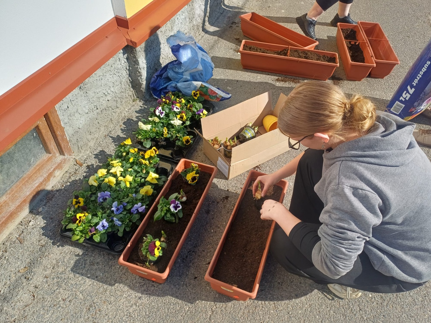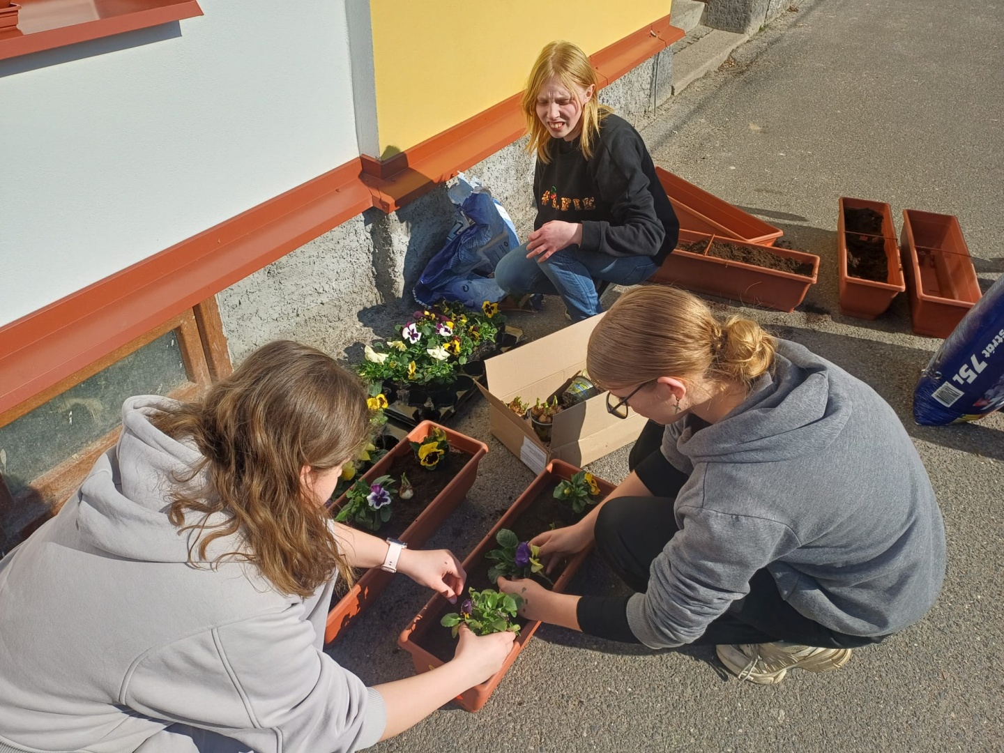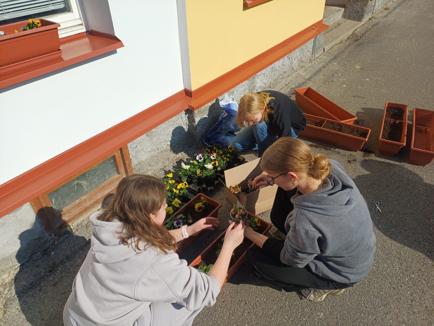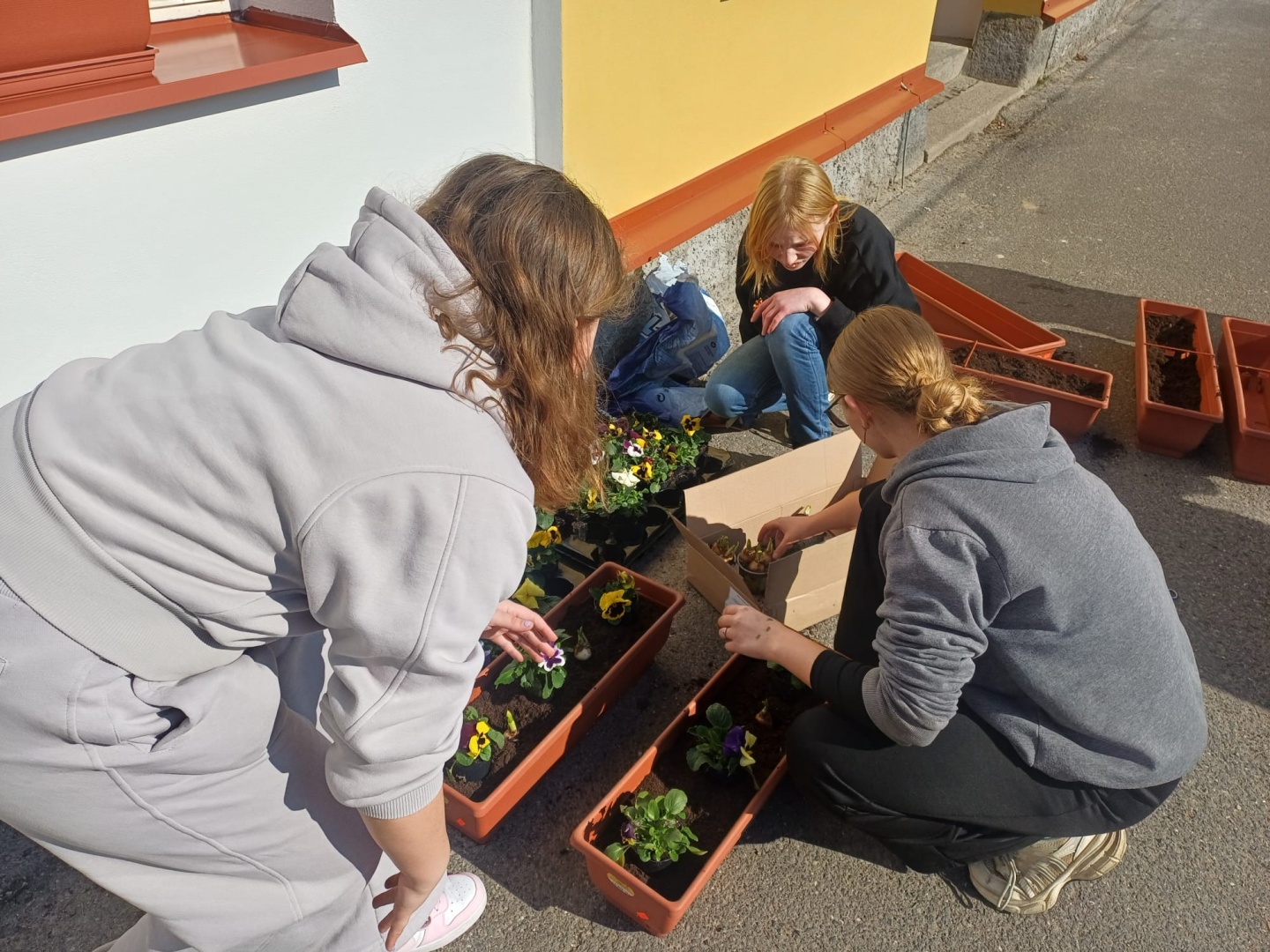 Až do letošního března byla okna naší školy holá. Dětem se nelíbila a tak přišly s návrhem, že by na parapetech mohly být truhlíky s květinami. Od návrhu nebylo daleko k realizaci - v místní prodejně společně s učitelkou děti vybraly truhlíky (než se zaplatily, odnesly je děti ke škole, zda barevně ladí s parapety), nakoupily zeminu, cibule narcisů a různobarevné macešky. Během polední přestávky se dívky pustily do sázení. A dnes? Květináče nádherně zdobí přední stranu školy, kolemjdoucí je obdivují a děti jsou náležitě pyšné na svoji práci. Samozřejmostí je, že se střídají v jejich zalévání a další péči.