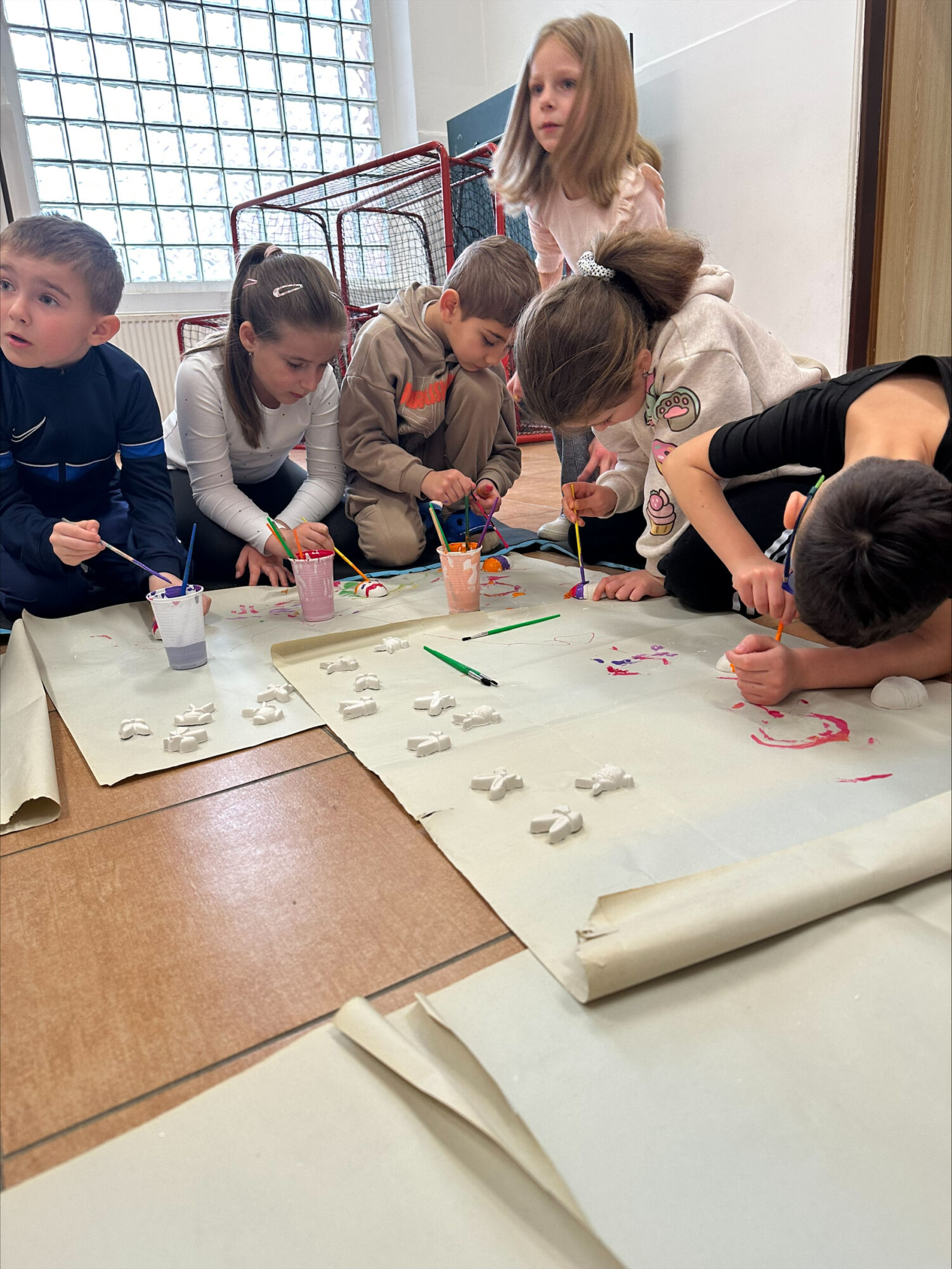 Školní parlament připravil pro žáky 1. a 2. tříd velikonoční stezku zaměřenou na spolupráci, komunikaci a vzájemnou pomoc. Děti na jednotlivých stanovištích plnily pestré týmové úkoly – překonávaly „rozbahněnou louku“ pomocí podložek, skládaly slova z písmen, společně kreslily pomocí provázků nebo si procvičily paměť při zapamatování a řazení obrázků. Součástí programu byla také tvořivá dílna se sádrovými výrobky.