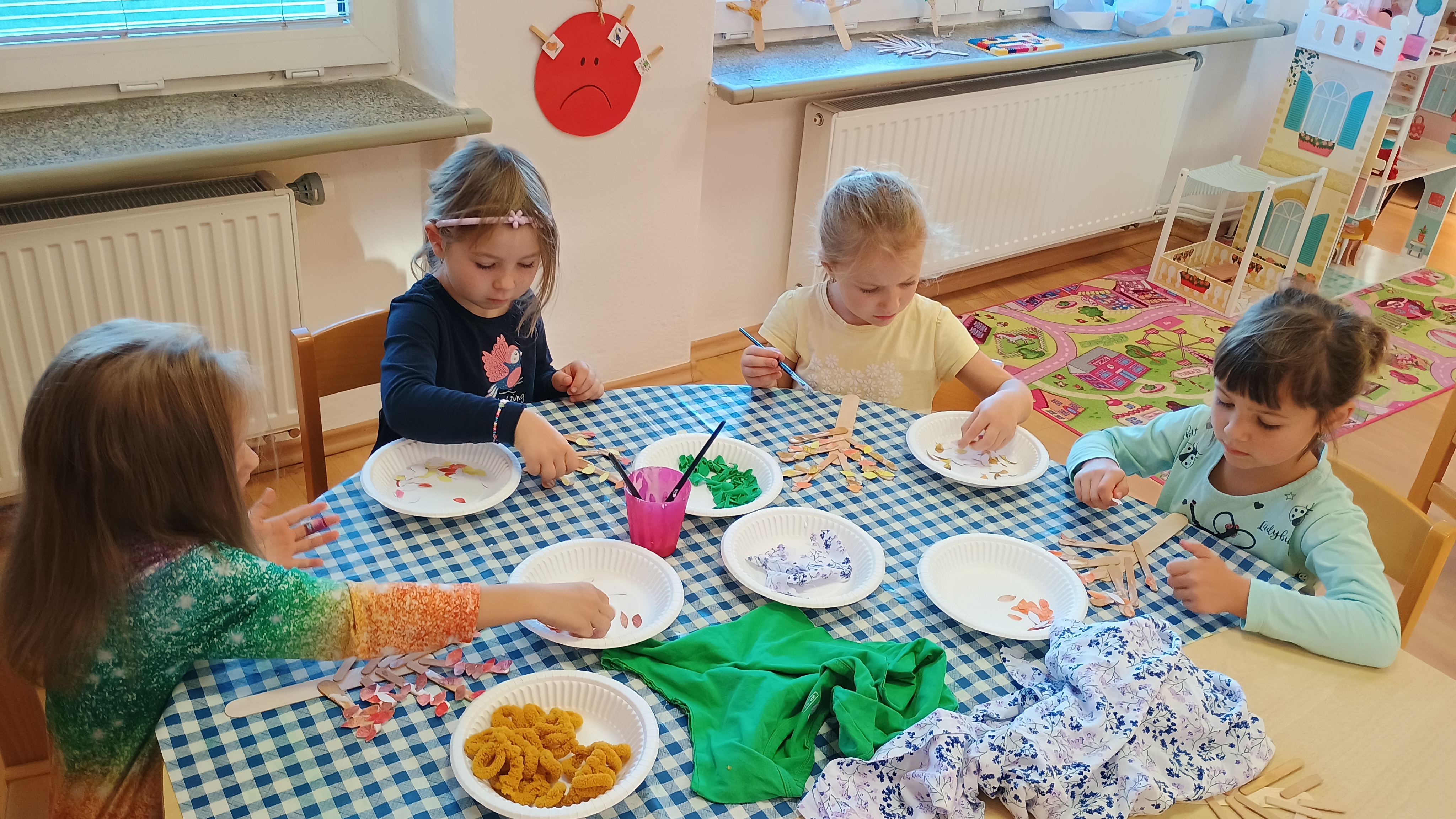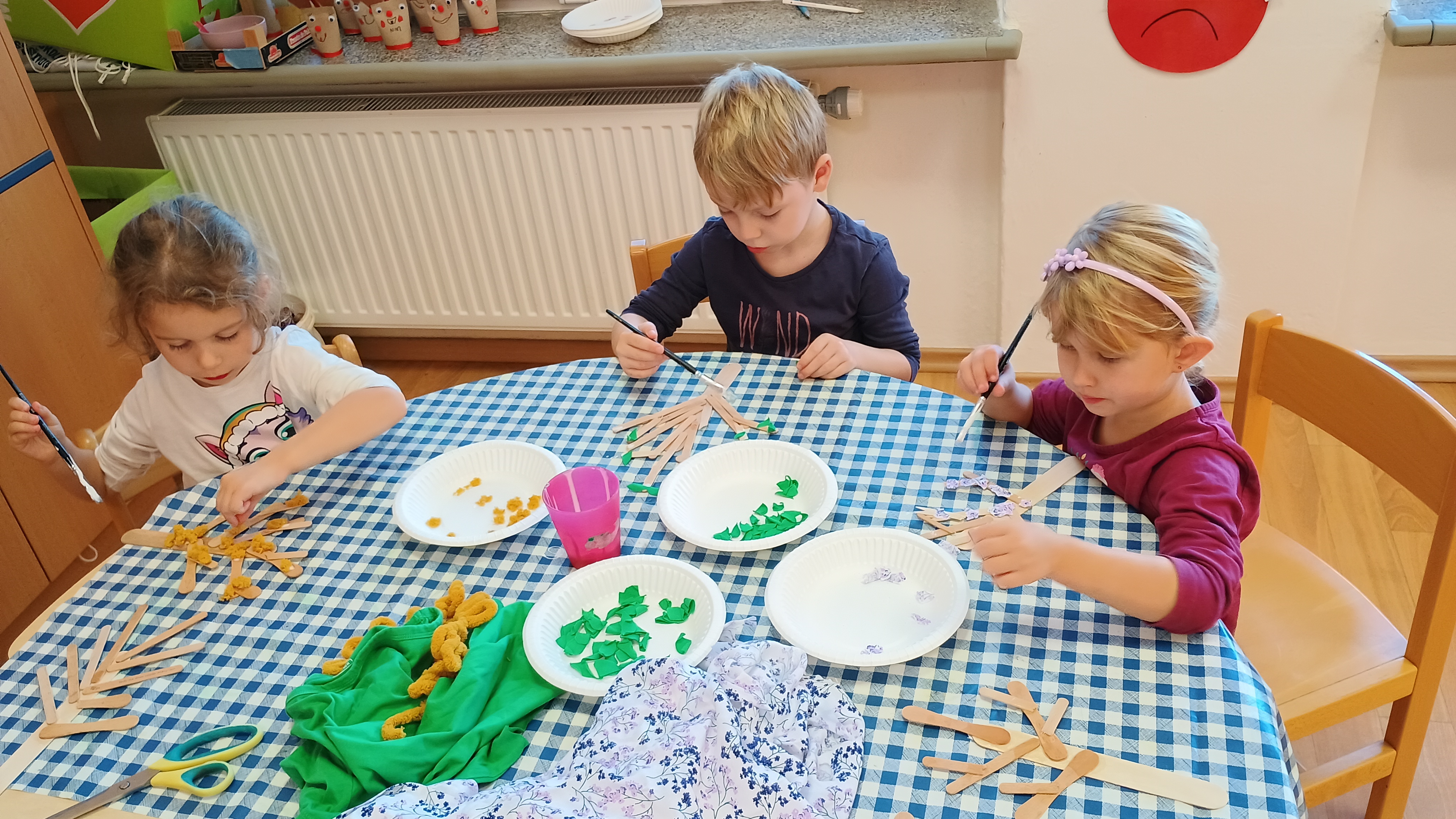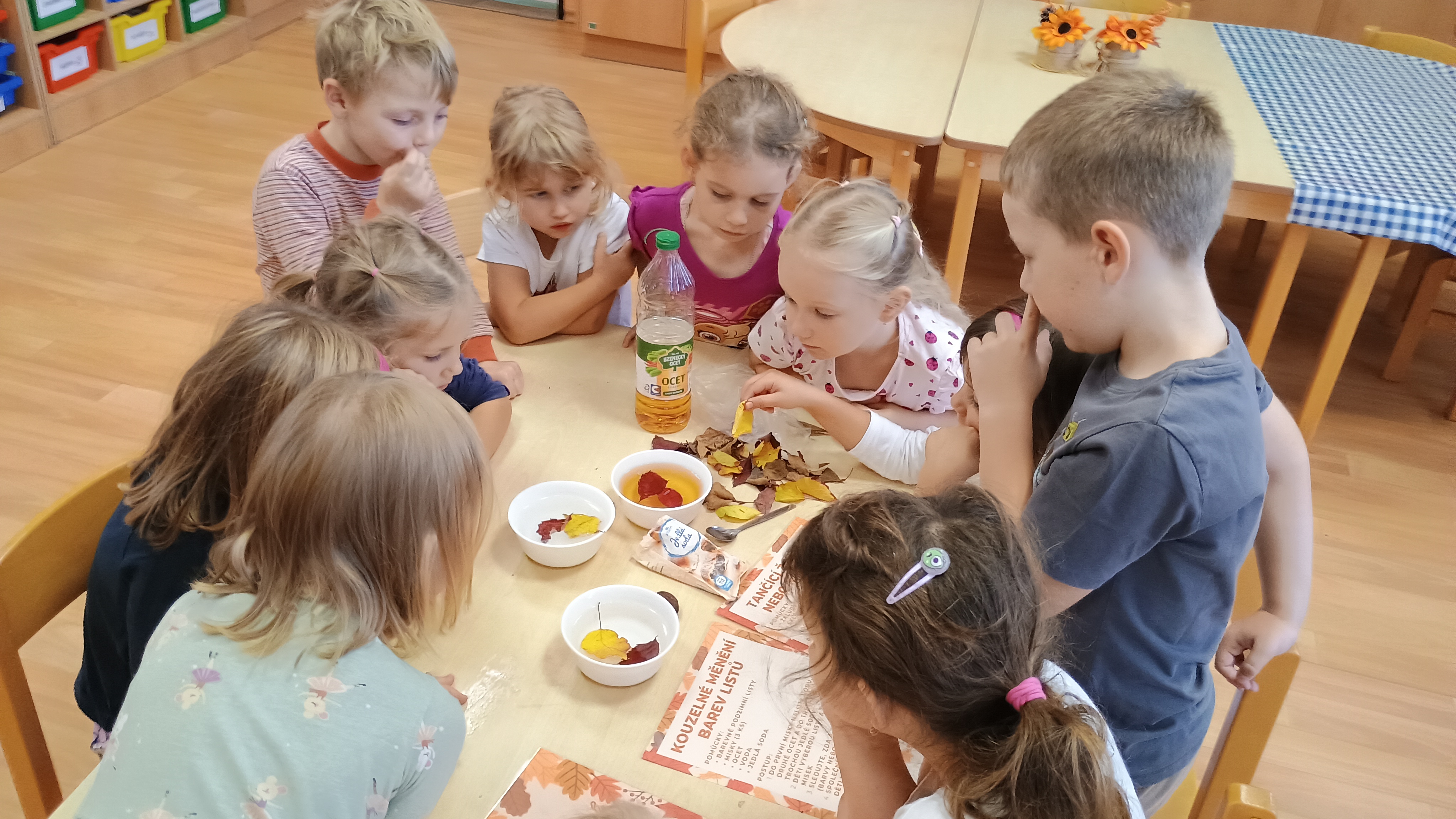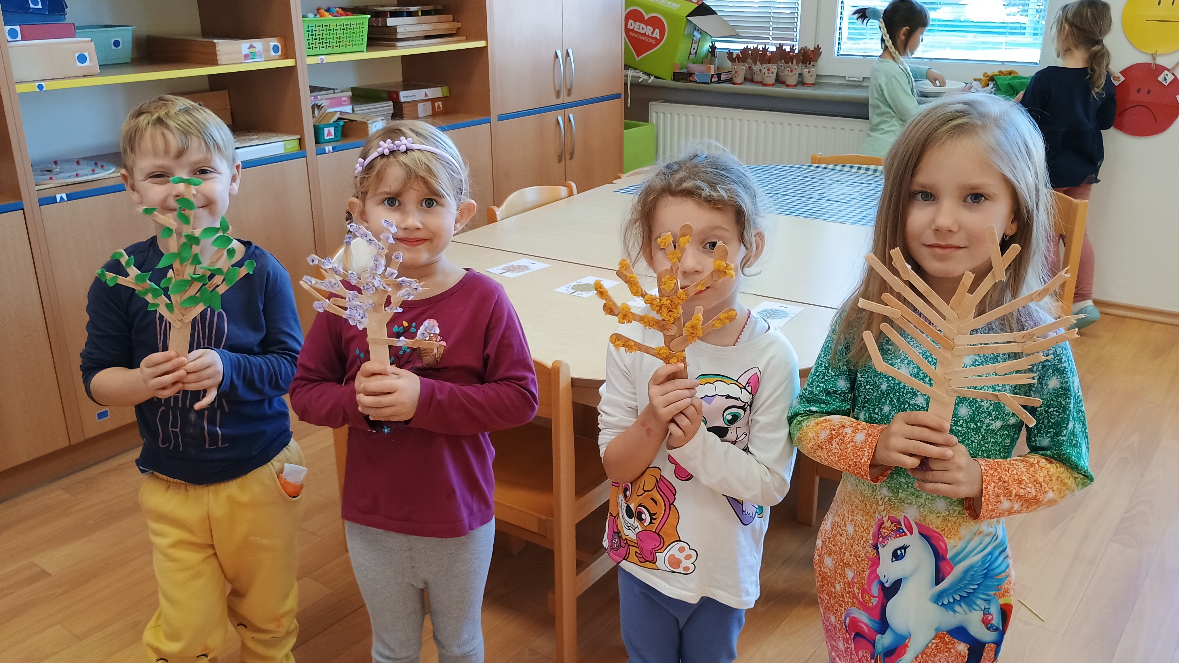 V rámci oslav Dne stromů jsme si dětmi povídali o stromech, jak jsou důležité pro planetu Zemi, pro nás lidi a co vše ze dřeva se vyrábí. V minulém školním roce jsme s dětmi sbírali špejle od nanuků a nyní jsme je využili ke kreativní činnosti, a to k výrobě stromů. Současně jsme využili k výrobě listů další materiál, a to látky, které jsme vybrali na loňské recyklo akci „Pošli to dál“. Děti si vybraly vhodné barvy látek tak, aby mohly znázornit stromy v každém ročním období. Protože počasí přálo, vydali jsme se na delší vycházku k lesu. Pozorovali jsme, jak se stromy během roku mění. Cestou jsme sbírali barevné listy, které jsme následně ve školce využili k podzimnímu pokusu „Tančící listy“. Věříme, že cíl této akce, aby si dětí více vážily přírody a aby daly věcem ještě šanci na nový život, byl naplněn.