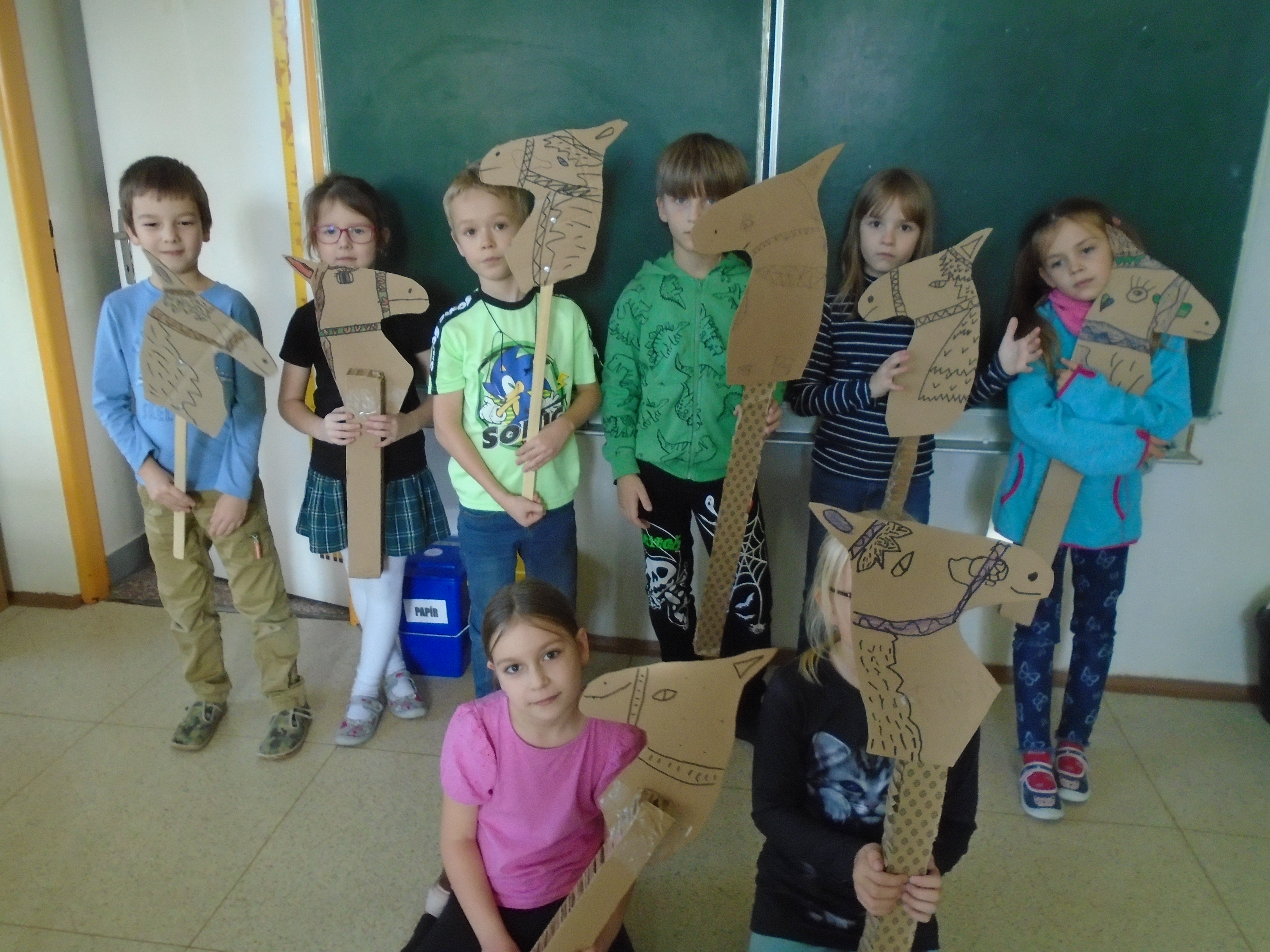 Ve školní družině jsme si vyrobili z kartonových krabic hlavy koníků, které si děti pomalovaly a připevnili jsme je na různé paličky. V tělocvičně jsme uspořádali závody v běhu a přeskocích přes překážky. Vysvětlili jsme si, co je parkur a hobby horsing. Pro děti to byla názorná ukázka, jak využít karton, než skončí v kontejneru. Tuto aktivitu jsme měli v rámci projektového dne ke svatém Martinovi.