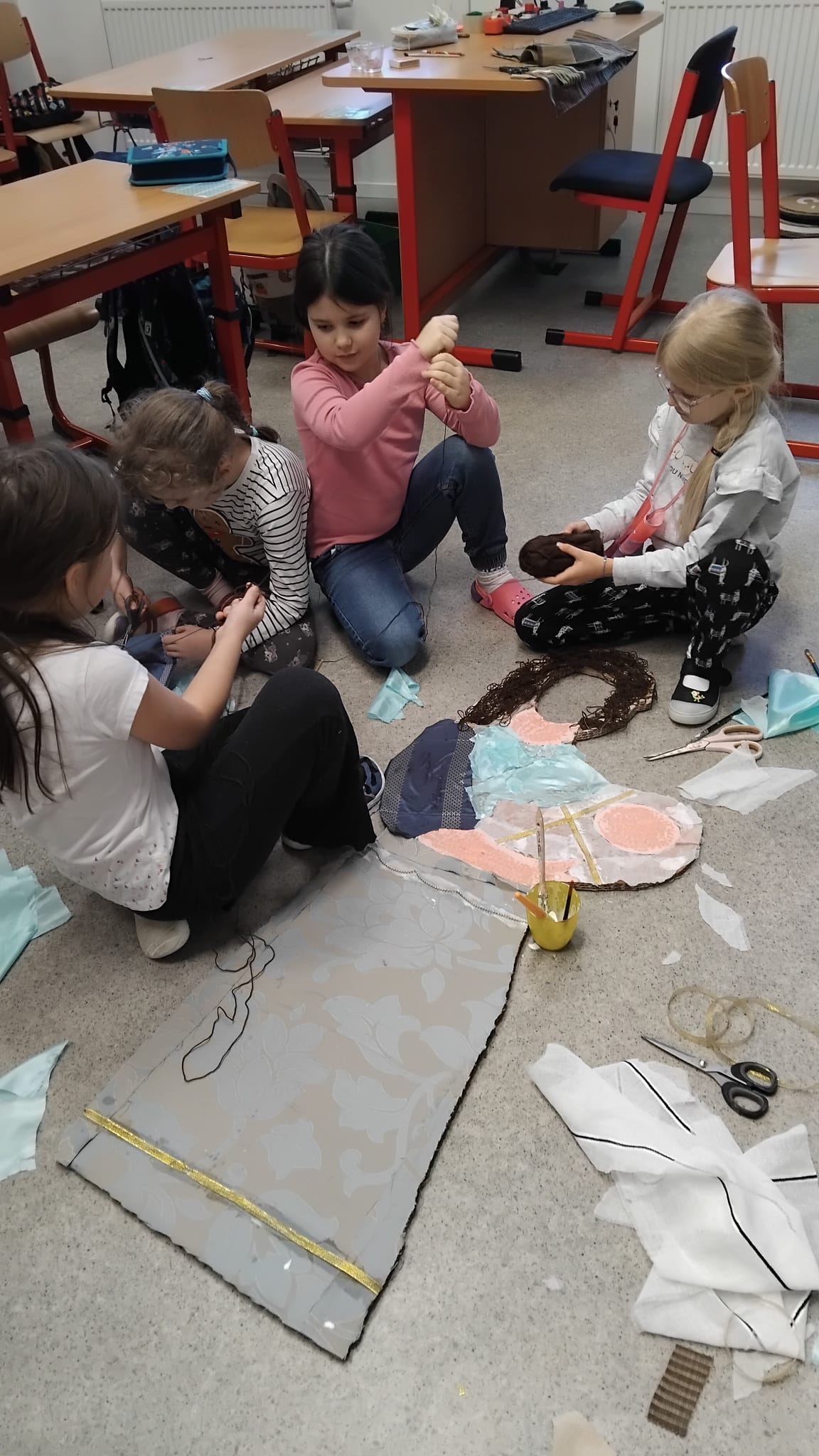 2) příprava nástěnky: děti své obrázky vystřihly a nalepily na podklad - hvězdnou oblohu tvoří starý kus látky