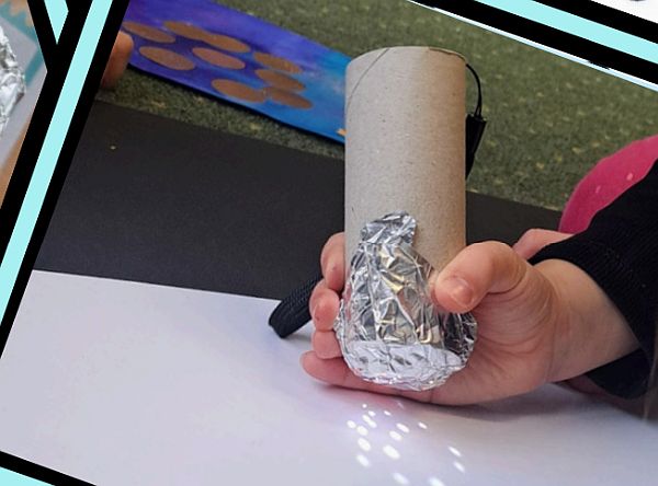 Děti se seznámily s hvězdnou oblohou a vyrobily si přístroj na promítání souhvězdí na podložku. Využily odpadového materiálu - dřevěných odštěpků, papírových ruliček.