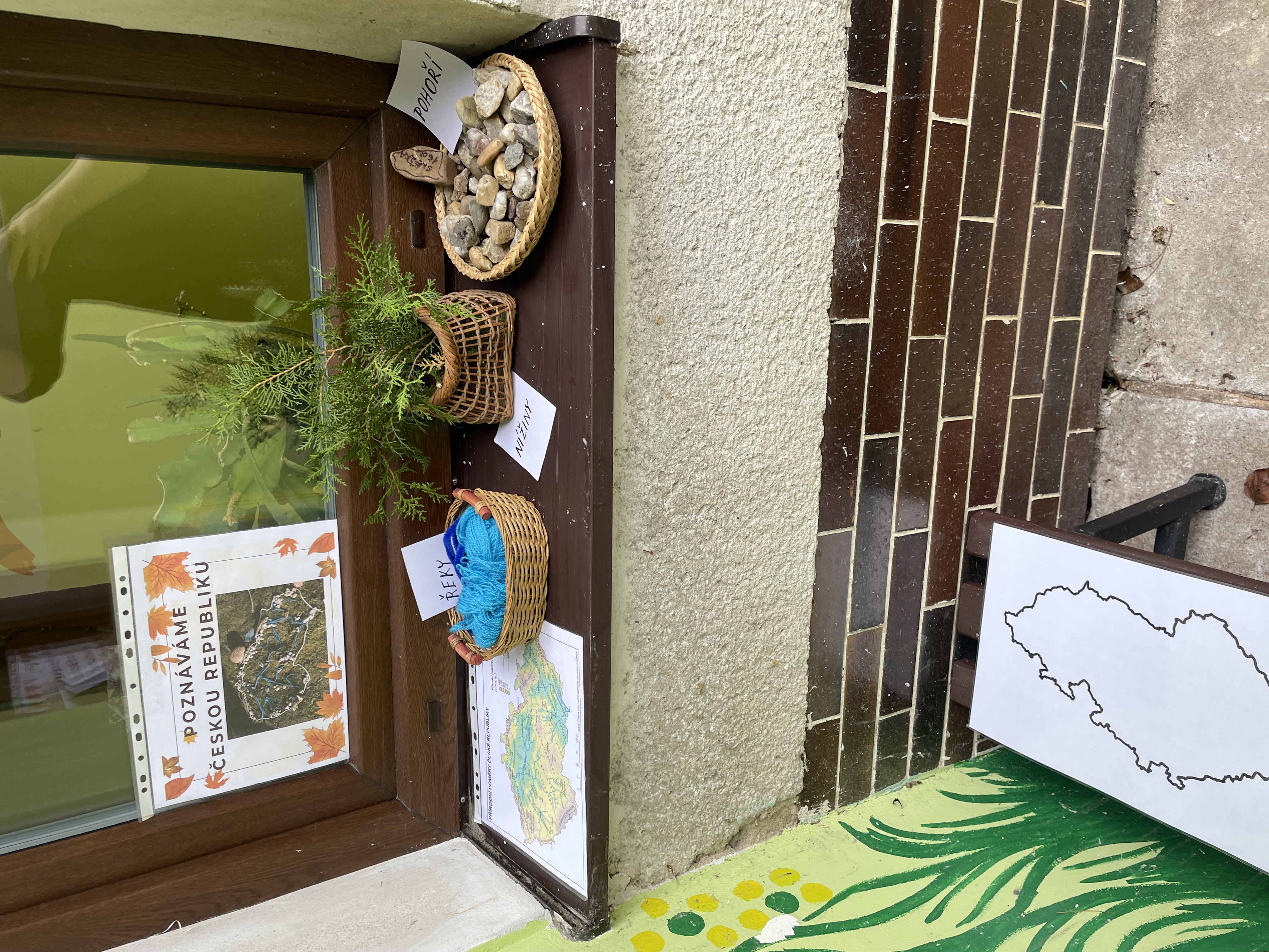 Cílem aktivity je zvýšit citlivost a vnímavost dětí k přírodě, aby byli motivováni ji chránit. Každého čtvrt roku na jedno z oken školy dáváme didaktické pomůcky z přírodních materiálů, na kterých si děti mohou procvičit naučené vědomosti z českého jazyka, matematiky. Inspirujeme se na stránce "učíme venku". Na podzim jsme počítali s kaštany, tvořili jsme mapu ČR z přírodních materiálů (nížiny ze zelených větviček a listí, pohoří z hnědého listí, z hlíny a hory z kamenů, hranice z větviček). Nyní pozorujeme dalekohledem ptáčky na krmítku, při práci s klíčem k určování ptáčků si procvičujeme čtení, hrajeme si s pírky...