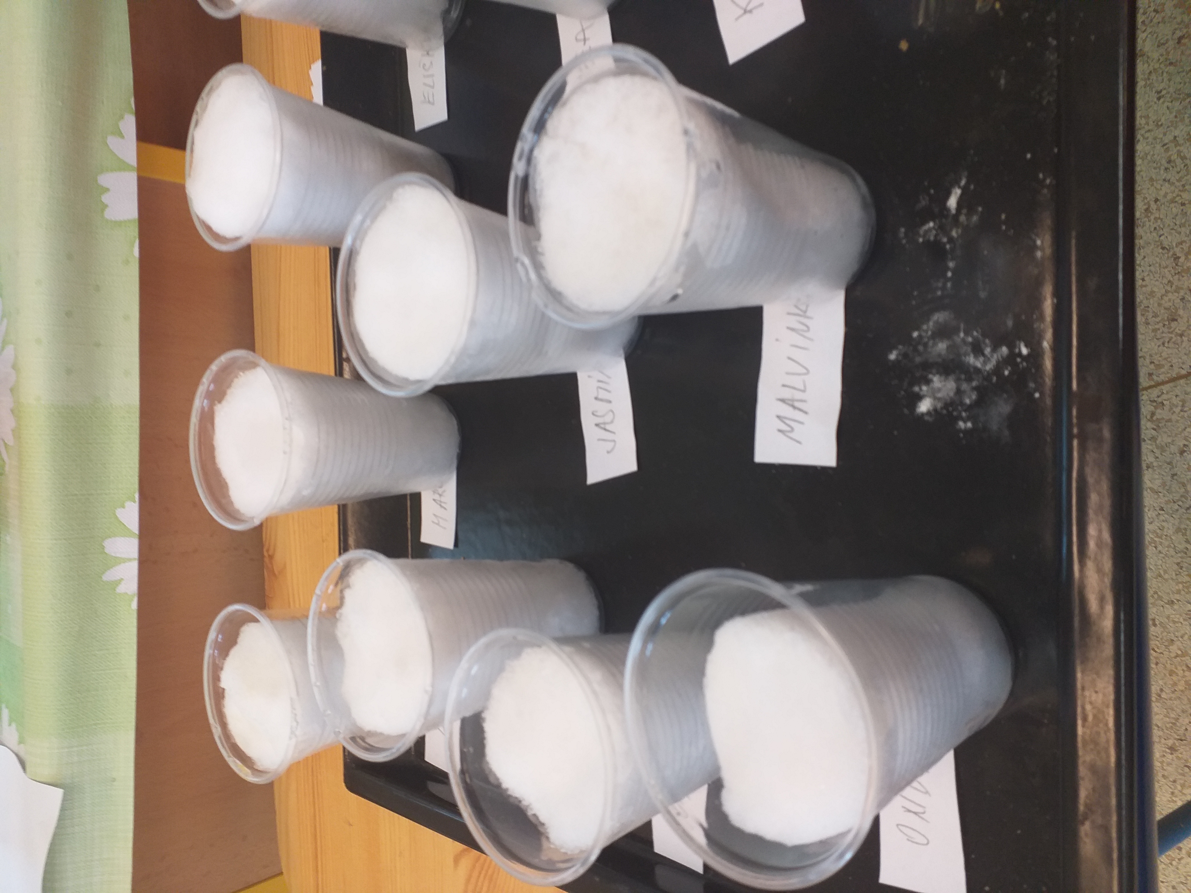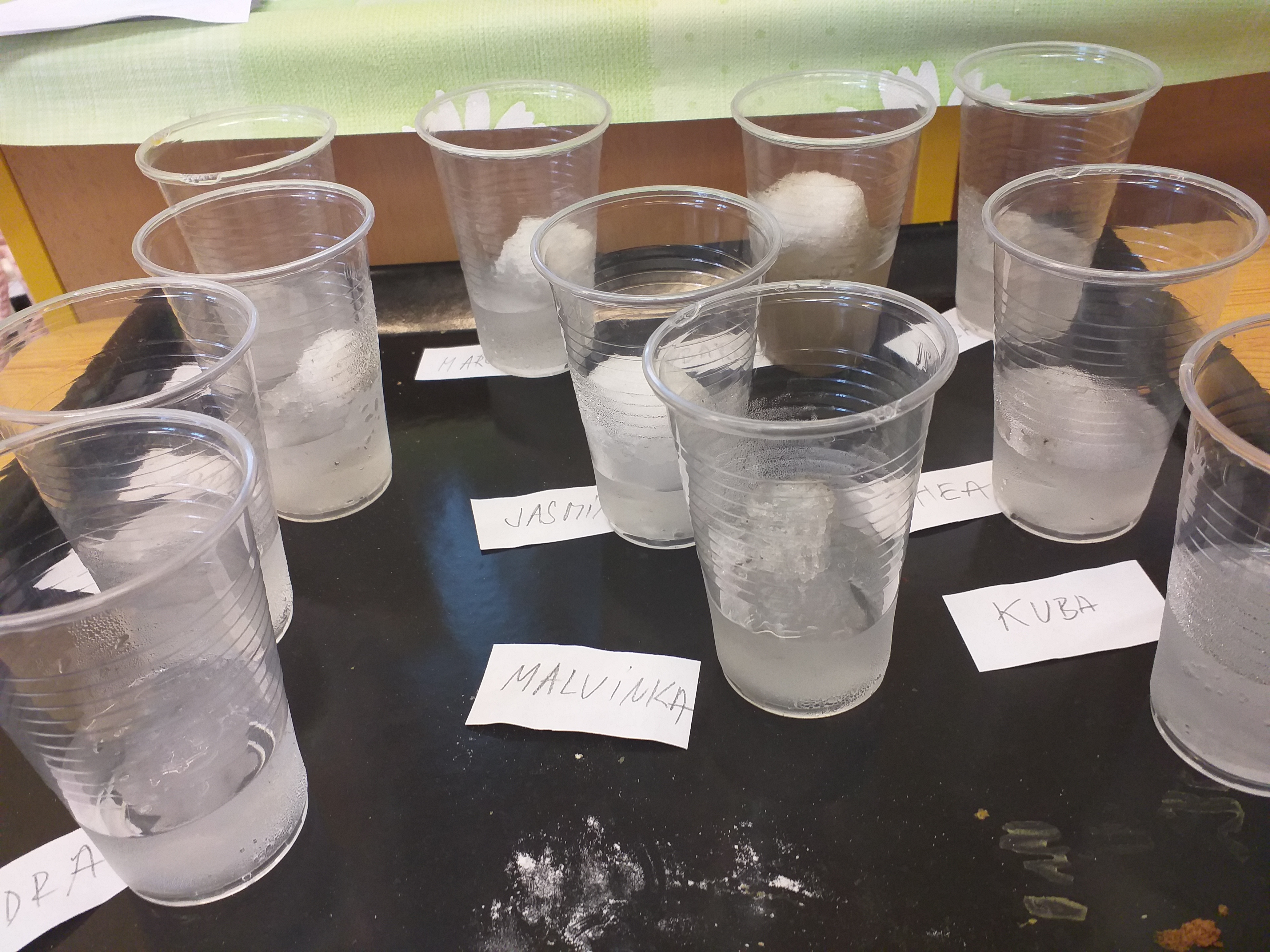 Při pokusech se sněhem jsme vodu z rozpuštěného sněhu využili k výrobě ledových ozdob. Využili jsme nejenom vodu, ale také kelímky od jogurtů.