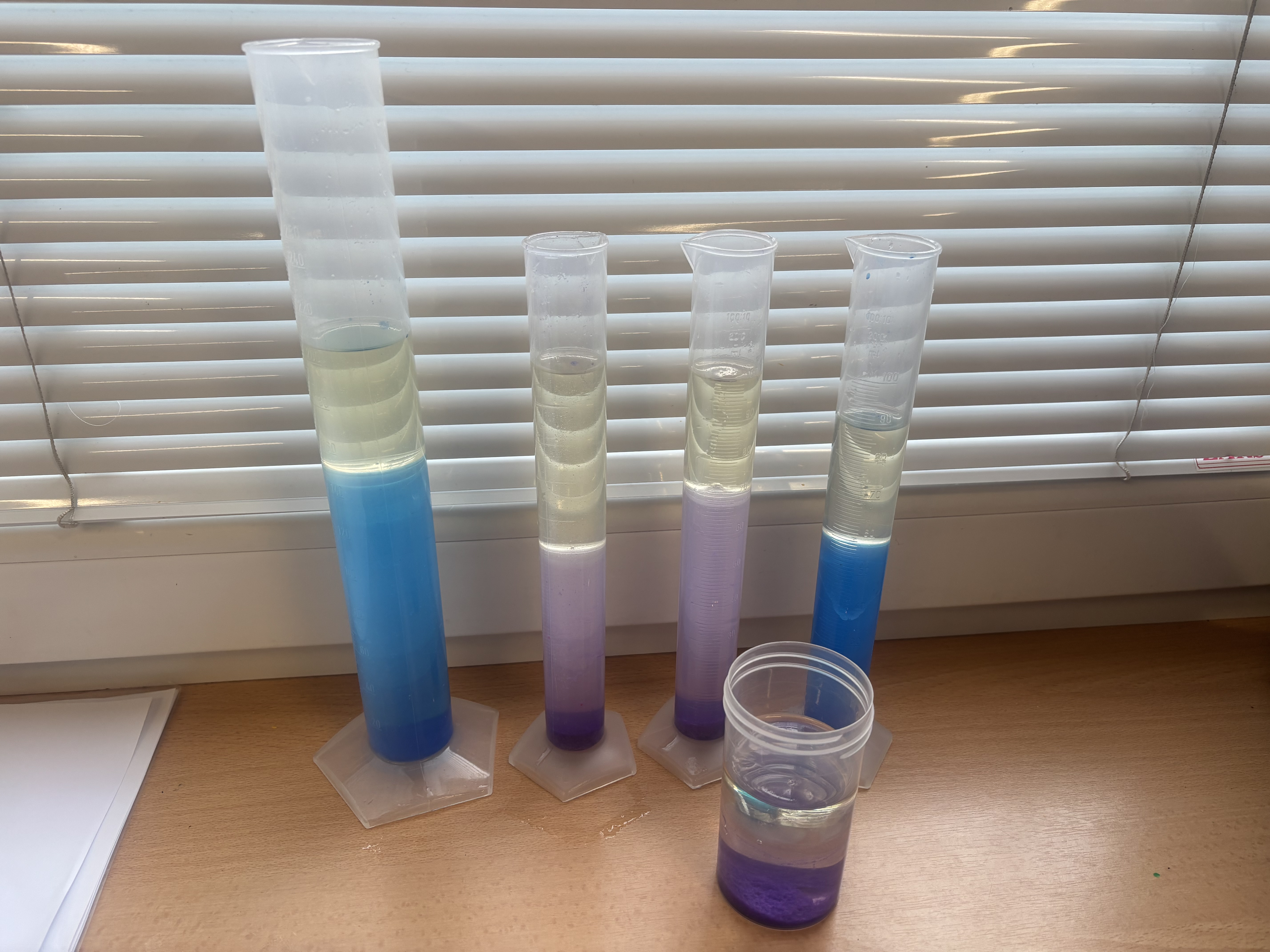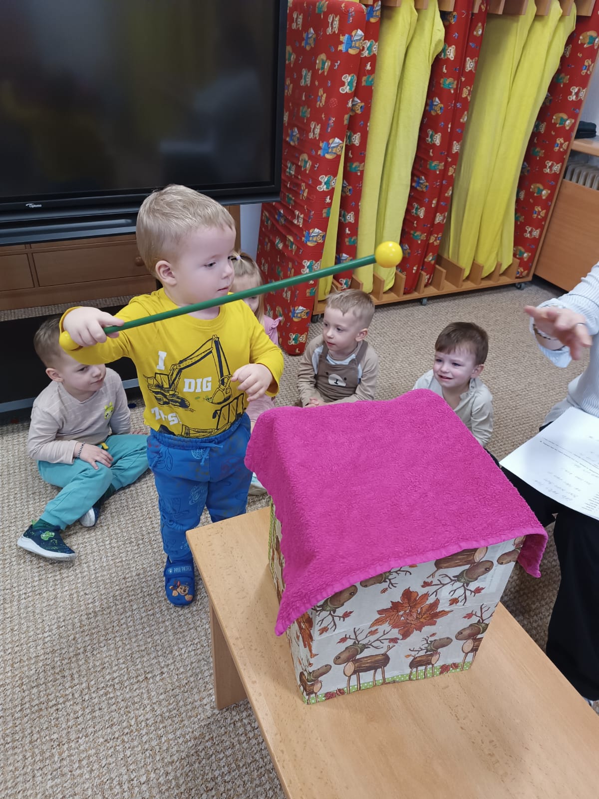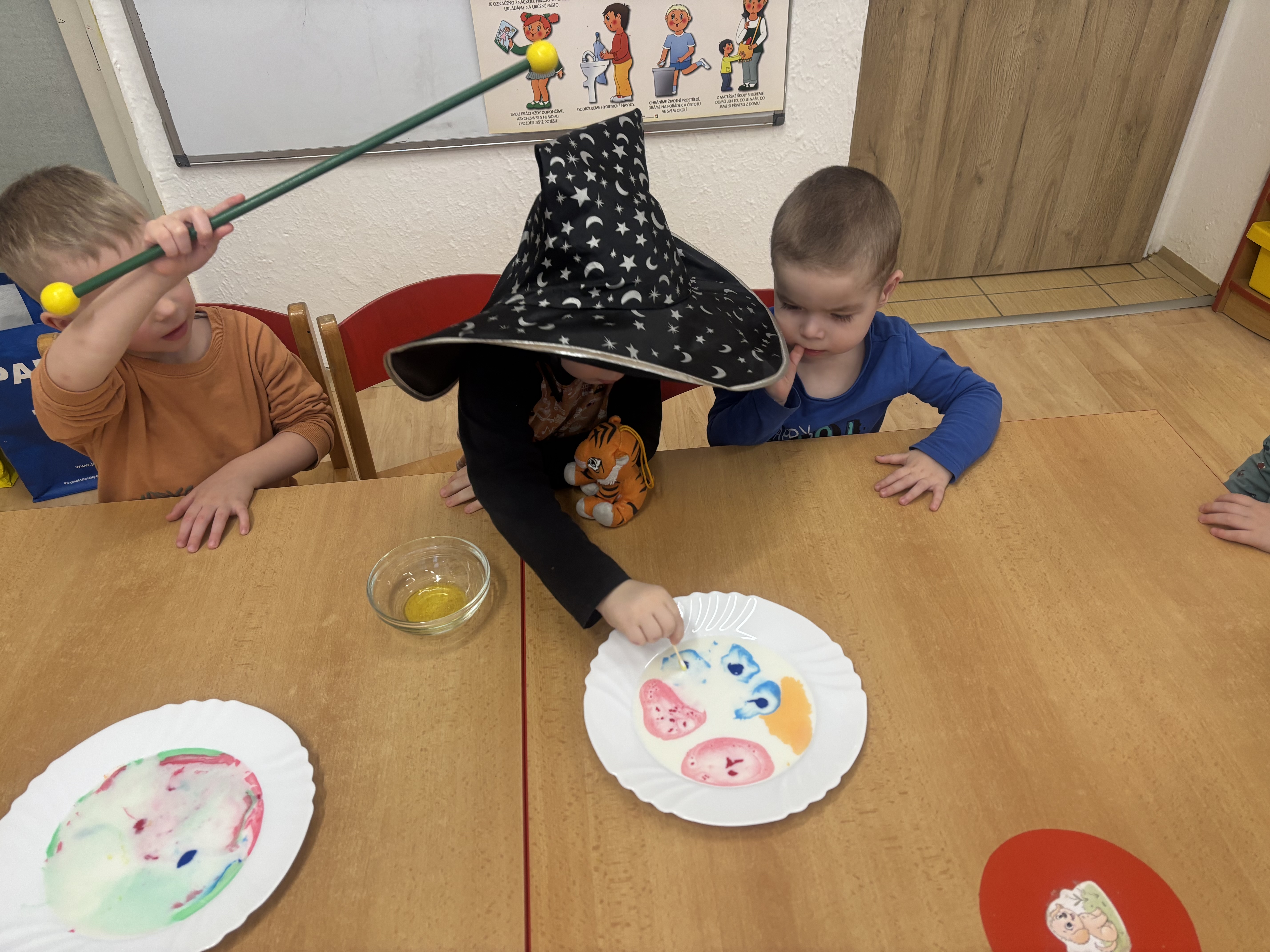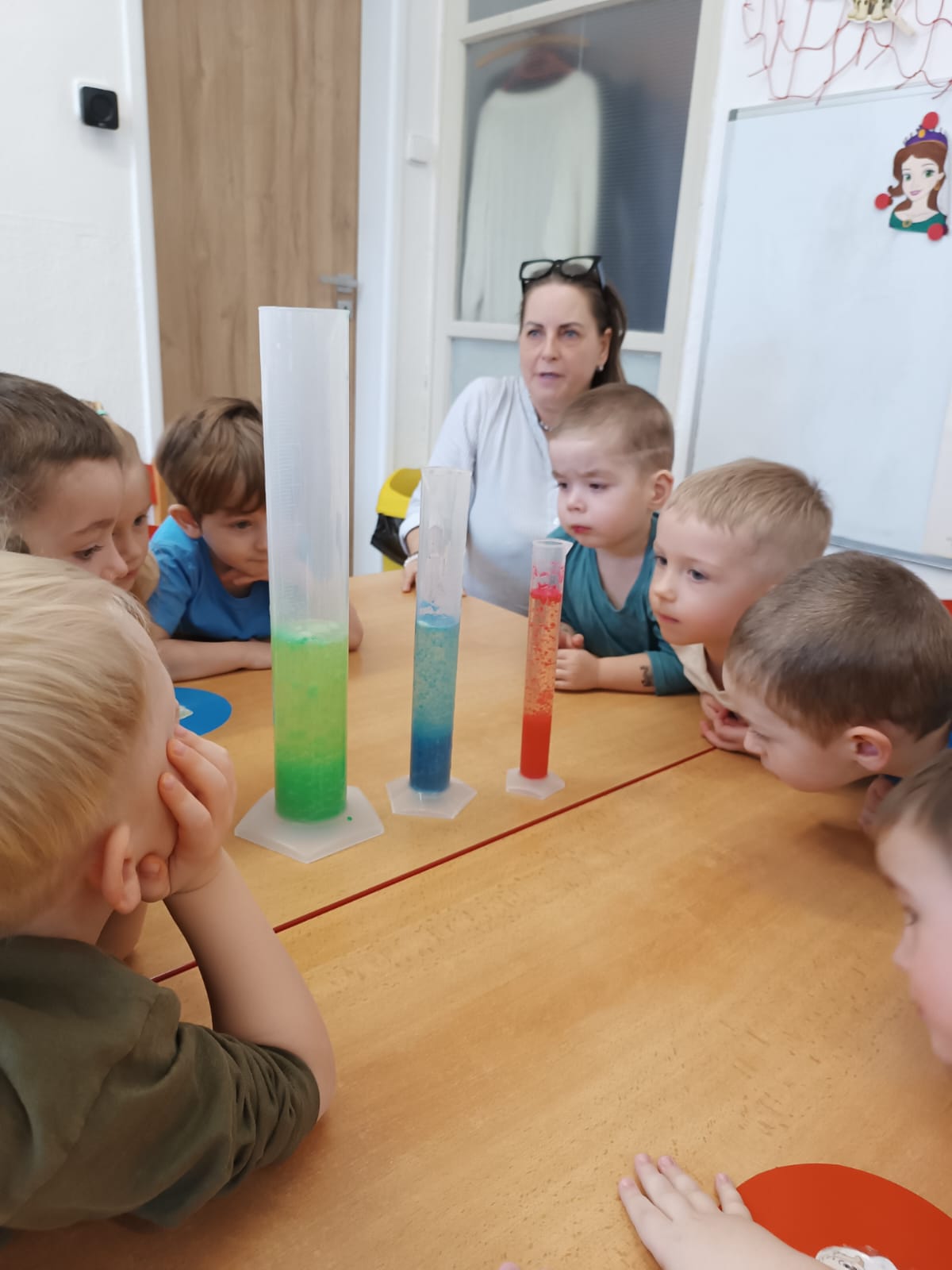 Děti 2-3 leté "kouzlily a čarovaly", byly účastníky pokusů a experimentů, při kterých pozorovaly reakci oxidu uhličitého v šumivé tabletě a vody, kdy bubliny prostupují neobarveným olejem v odměrném válci nahoru. Dále klesání barvy z obarvené ledové kostky v odměrném válci vodou dolů a neobarvený olej zůstávající nad hladinou vody. Zjistily tak, že olej je lehčí, než voda. Pokusy bedlivě sledovaly a i přes svůj věk 2-3 roky jej dokázaly popsat a vyhodnotit. To, který si nejlépe zapamatovaly, co se jim nejvíce líbilo vybraly a zhodnotily tak, že svou značku položily na fotografii toho pokusu, který byl jejich nejoblíbenější.