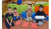 PET víčka využíváme k různým činnostem. Na fotografiích děti skládají PET víčka do řady dle předlohy, zdobí "hrníčky" puntíky dle předlohy, vytváří symbol