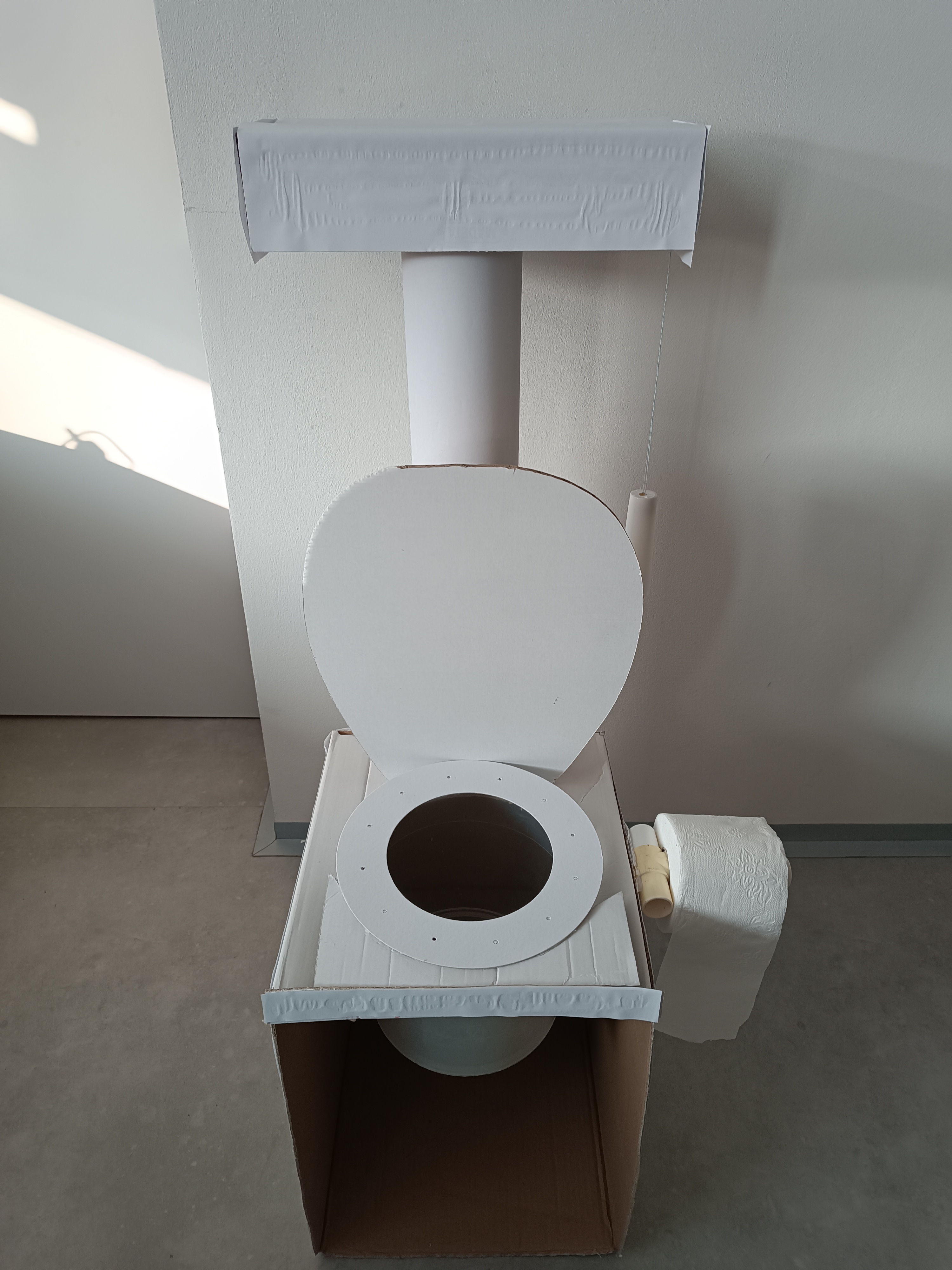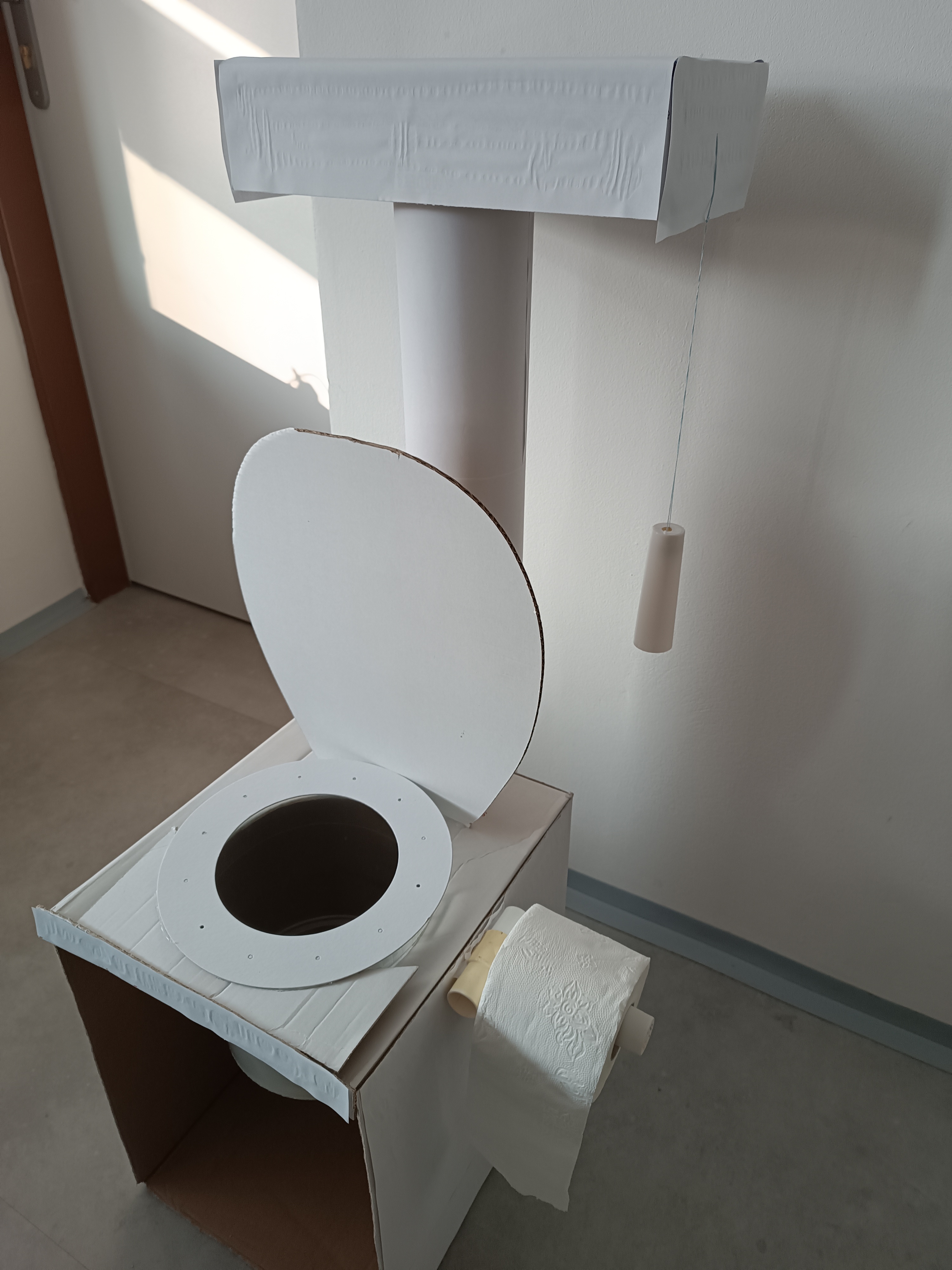 První část pomůcky k novému úkolu. Nechtěli jsme s Družínky jako osvětu k tomu co do záchodu patří a nepatří použít například plakát,ale chtěli jsme něco názorného. Proto jsme z kartonových krabic, kartonové role a plastových částí vyrobili záchod, který pak následně doplníme tím,co splachovat můžeme a co naopak nemůžeme.