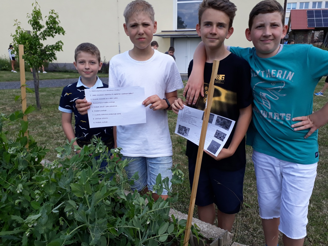 Žáci si dají naklíčit hrášek, zaznamenávají průběh klíčení, hrášek zasejí, zalévají, plejí, pozorují jeho růst a při venkovní výuce vyhledávají o něm informace a doplňují je k otázkám.