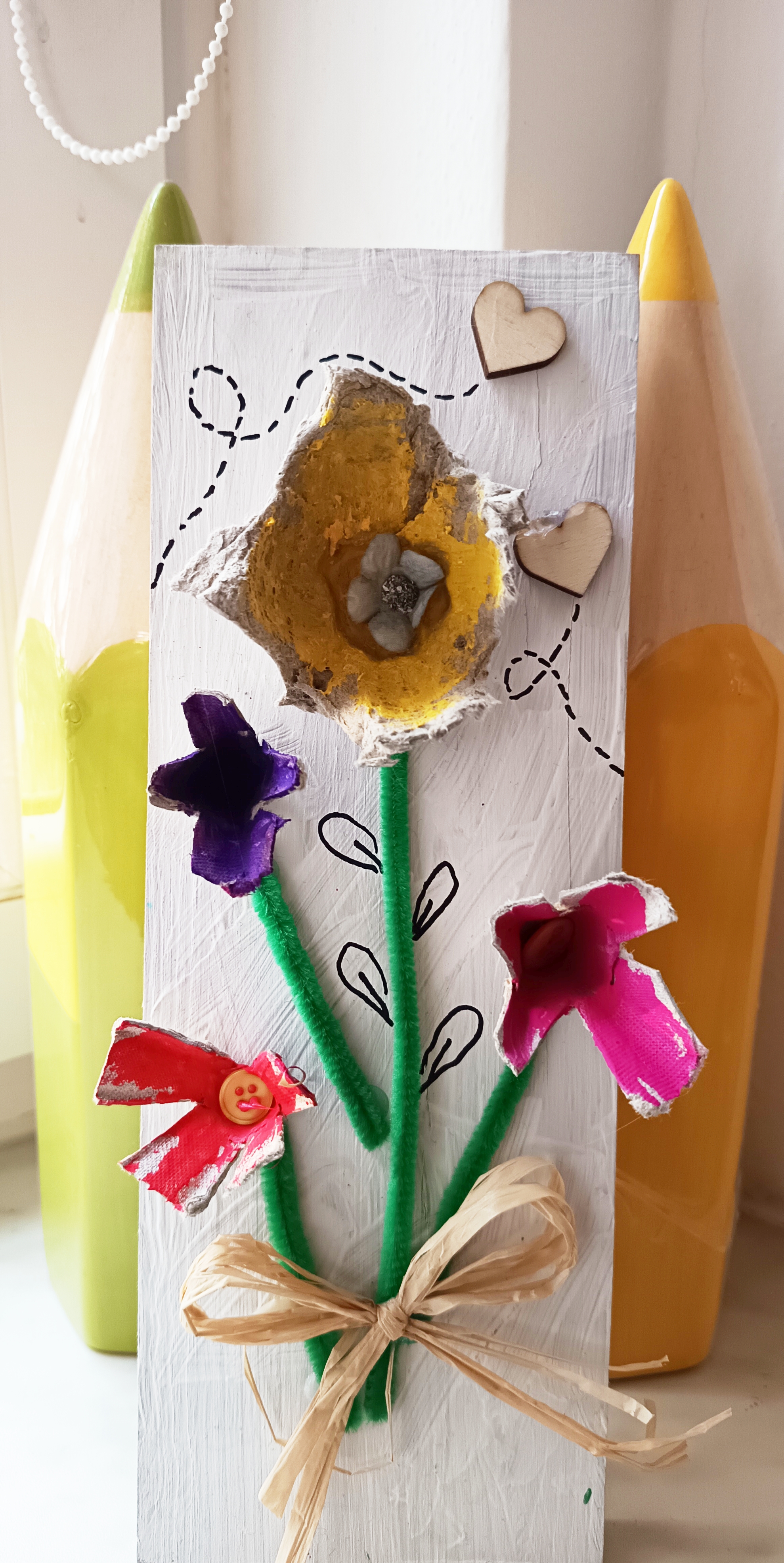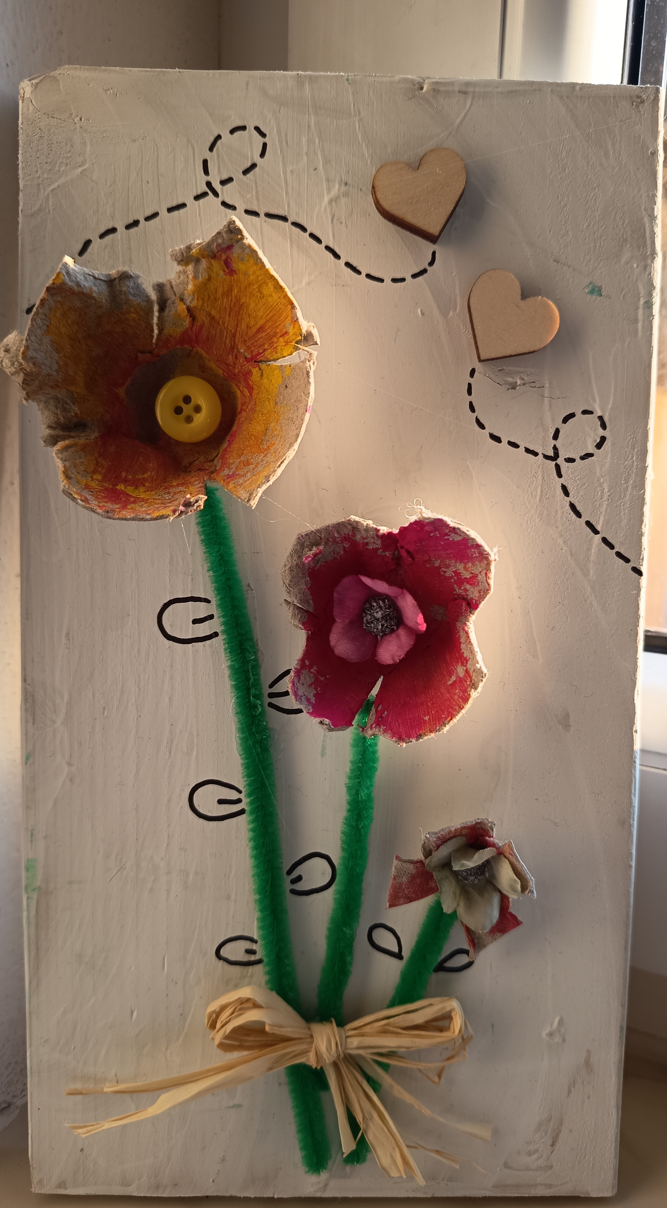 Žáci si ze složek od vajíček vystřihli jednotlivé části, které dotvarovali do podoby květů. Ty následně nabarvili temperami podle vlastní fantazie. Po zaschnutí květy nalepili na dřevěnou desku a doplnili dalšími detaily (např. stonky, listy). Hotové práce posloužily jako jarní dekorace, v květnu tento výrobek obdrží maminky u příležitosti svátku matek.