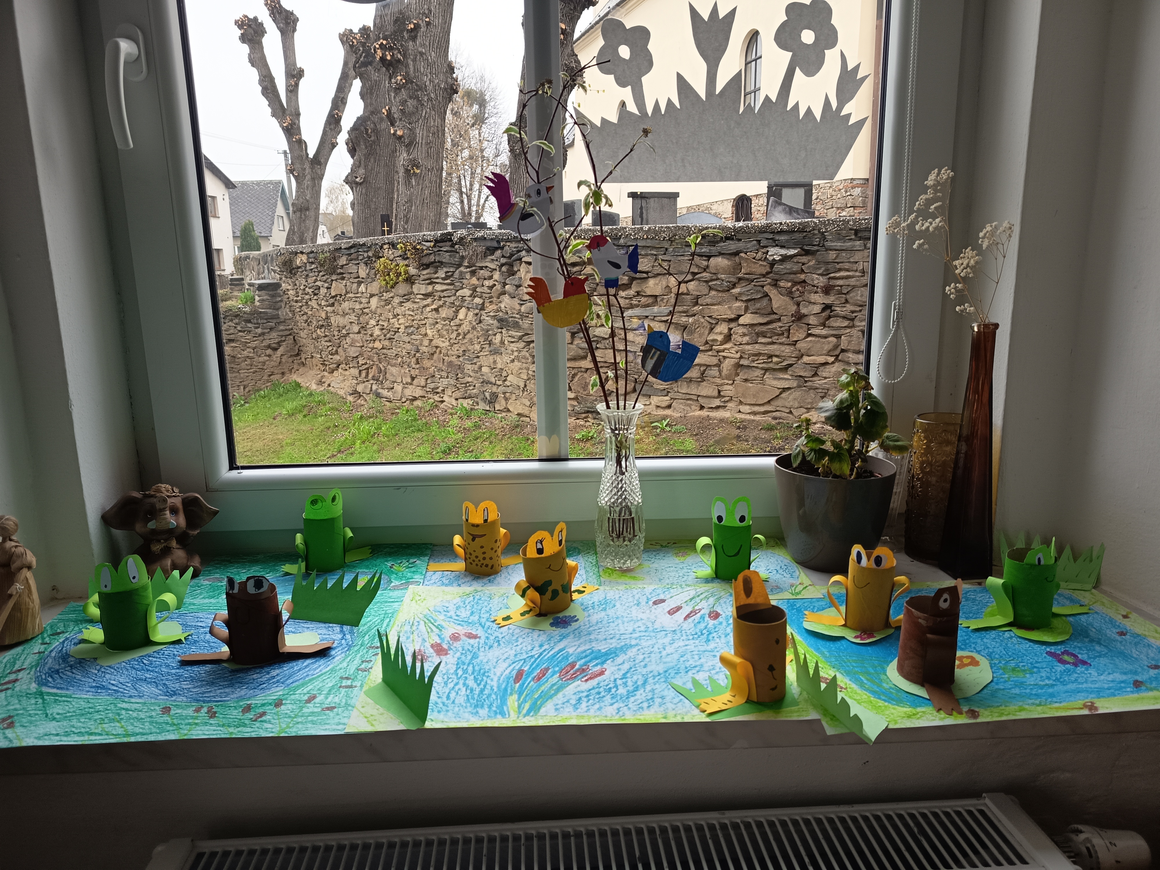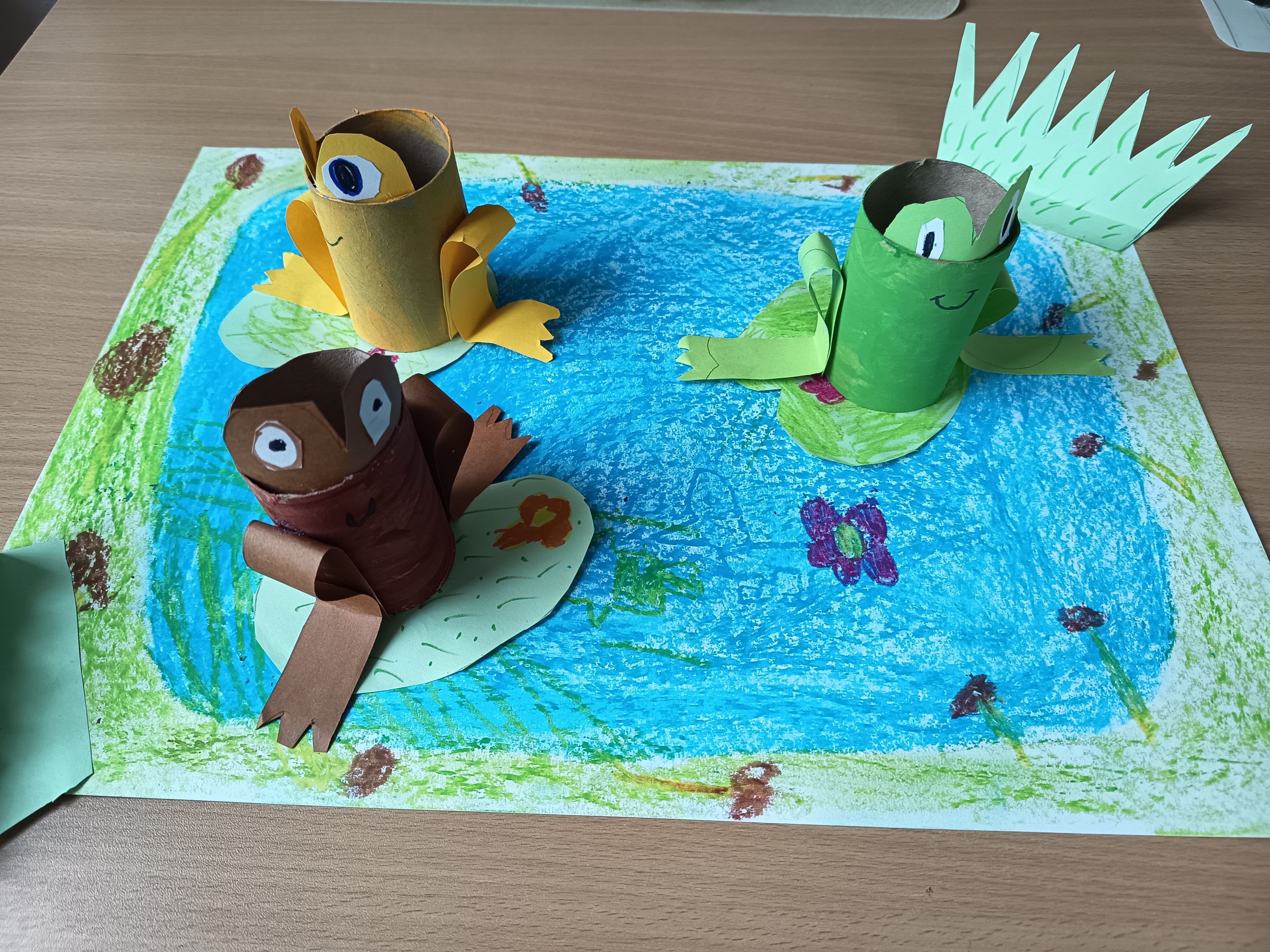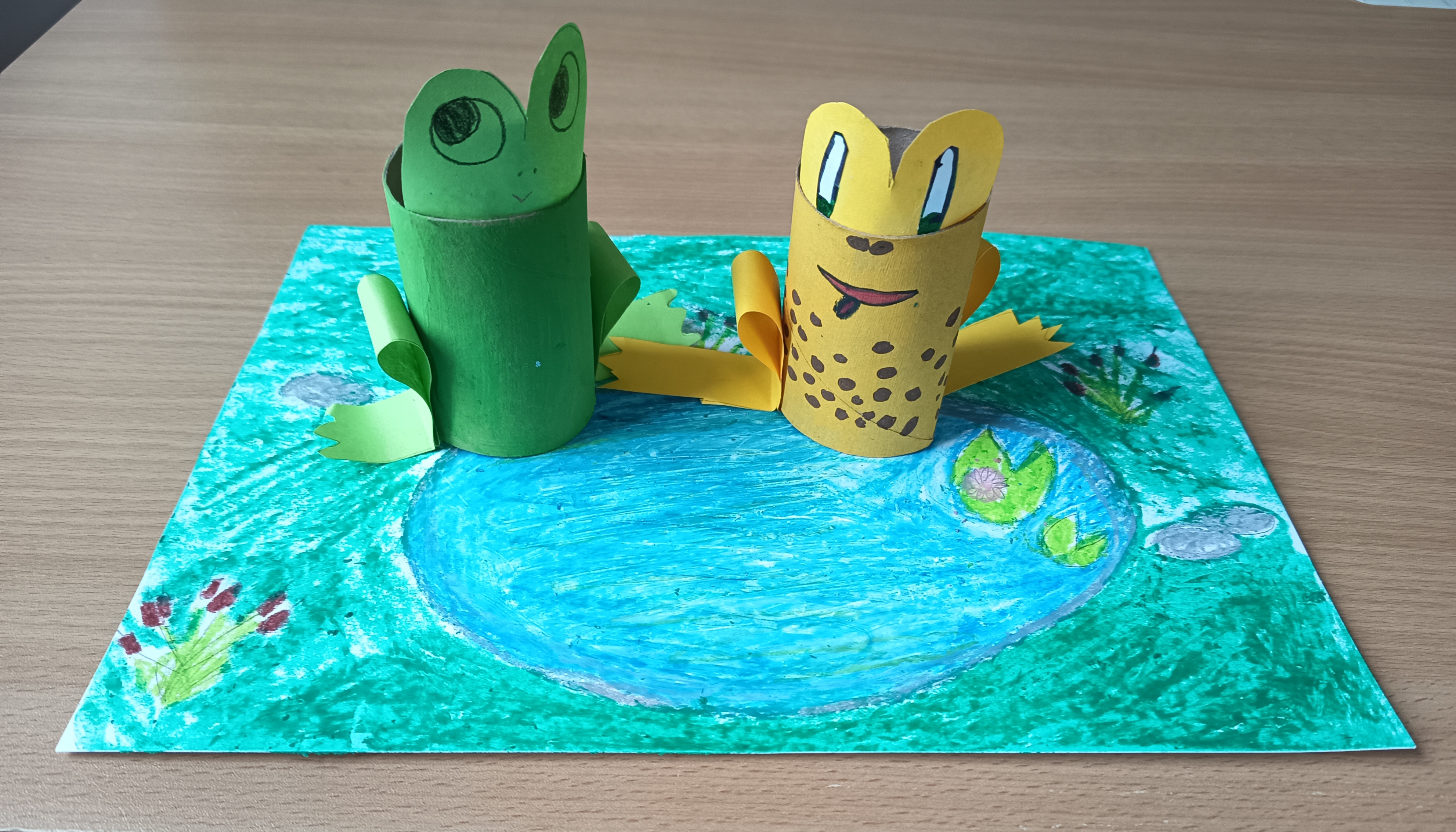 Cílem aktivity bylo podporovat tvořivost, představivost a jemnou motoriku žáků při práci s recyklovaným materiálem a rozvíjet jejich vztah k přírodě. Postup: Žáci využili ruličky od toaletního papíru, které podle potřeby upravili (zkrátili, ohnuli). Poté je nabarvili a dotvořili do podoby žabiček a dalších zvířátek žijících u vody. Pomocí papíru a dalších pomůcek přidali detaily, jako jsou oči, nohy nebo dekorace. Hotové výrobky byly součástí společné tematické výzdoby.