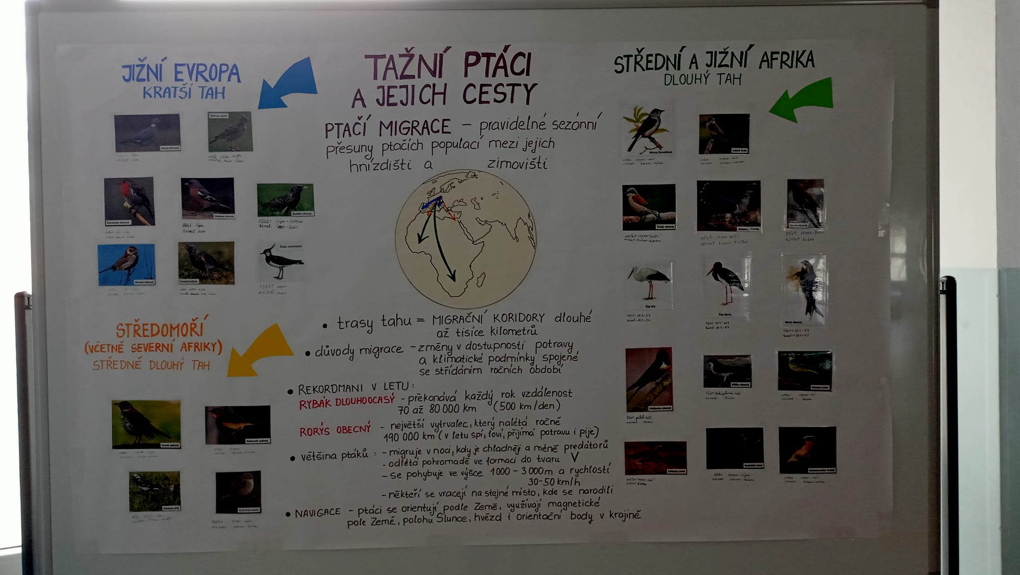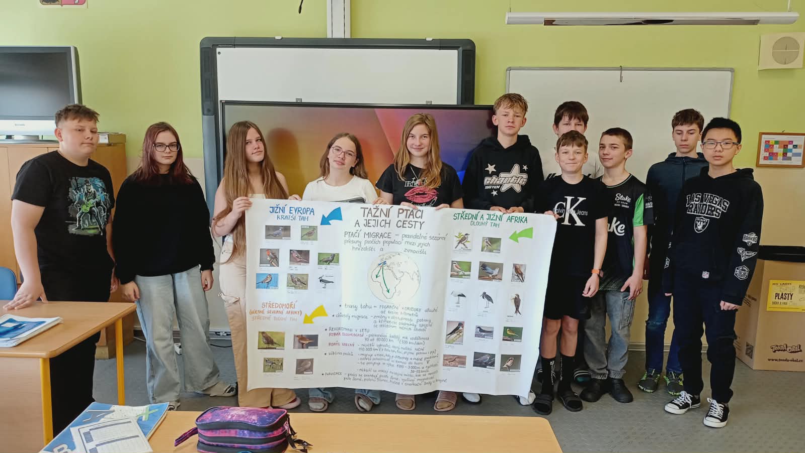 Žáci 7. třídy mapovali cesty tažných ptáků a zjišťovali jejich místa zimování, doby odletu i návratu. Osvojili si práci s textem, zpracování dat i výtvarné schopnosti. Své zjištění zpracovali do velkého plakátu, který bude sloužit jako učební pomůcka pro další ročníky. Zapojili se také do výtvarné soutěže na téma Ptačí svět naší školy.