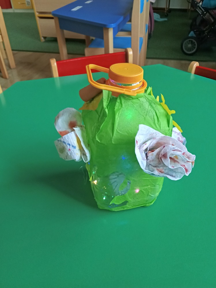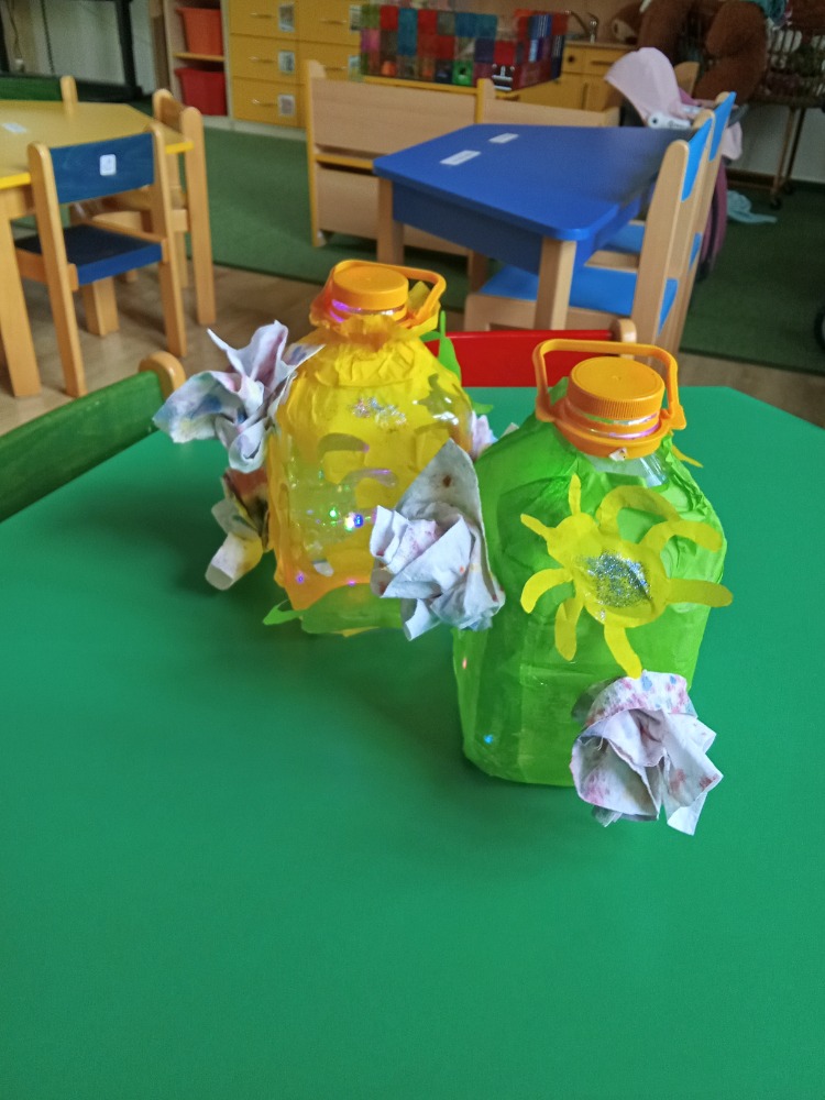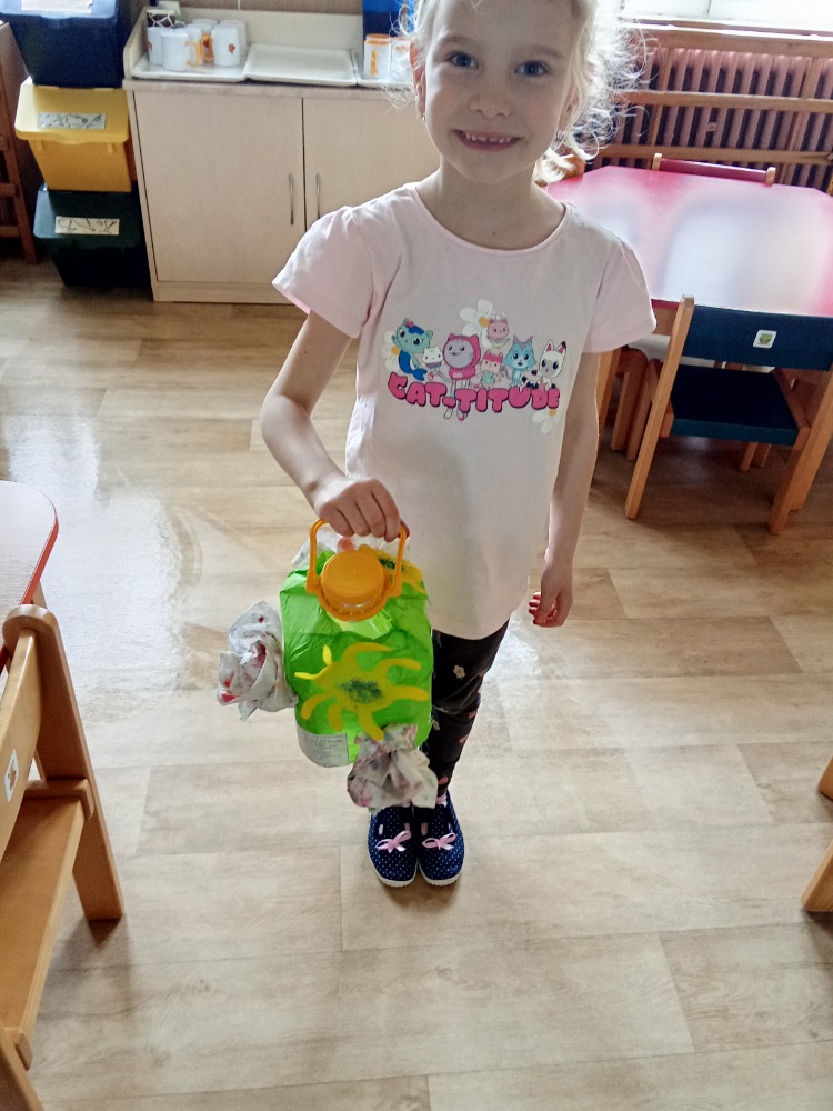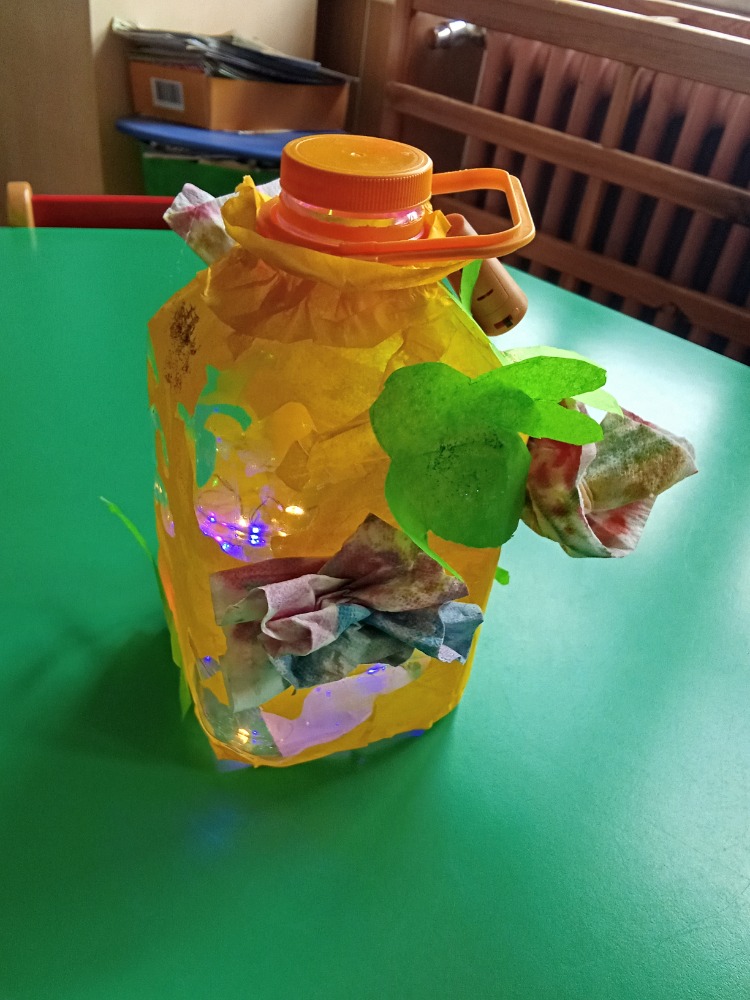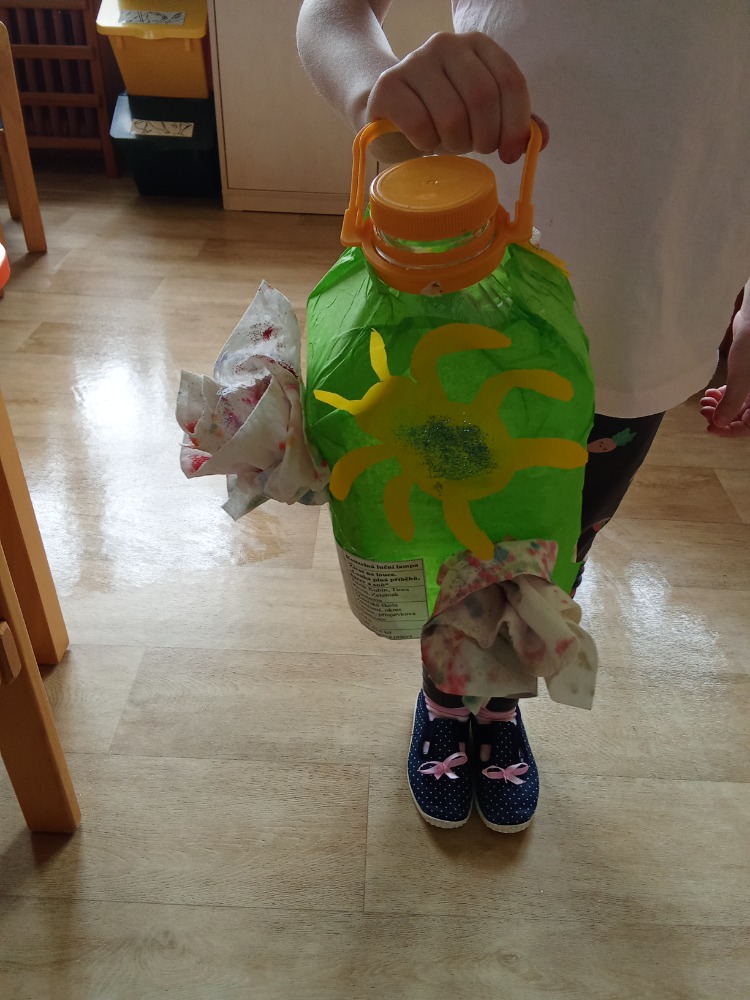 S dětmi jsme si při projektovém dni týkajícím se plánovaného otevření "nové školní zahrady" vyrobily "svatojánské lampy" - využily jsme plastové lahve od sirupů, které nám paní kuchařka schovala (lze využít i průhledné kanystry od čehokoliv). Na zbytky hedvábného papíru děti nakreslily různý hmyz, který žije na louce (pomohly nám digitální technologie i encyklopedie), s pomocí pedagogů bylo vystřiženo a polepeno na plastové lahve. Staré papírové ubrousky, upotřebené již několikrát, děti pipetou pokapaly vodovými barvami. Rozstřihaly na menší kousky a vytvářely různé "fantastické" květy. Květy jsme následně tavnou pistolí (s pomocí dospělého) nalepily na lahev. Vše děti na závěr potřpytily třpytkami z rozbitých vánočních ozdob. Do lampiček jsme umístily vánoční světýlka, která nám zde zůstala od Vánoc. Svatojánské lampy navodí při otevírání zahrady tu správnou atmosféru a děti si je užijí také "na čarodějnice".