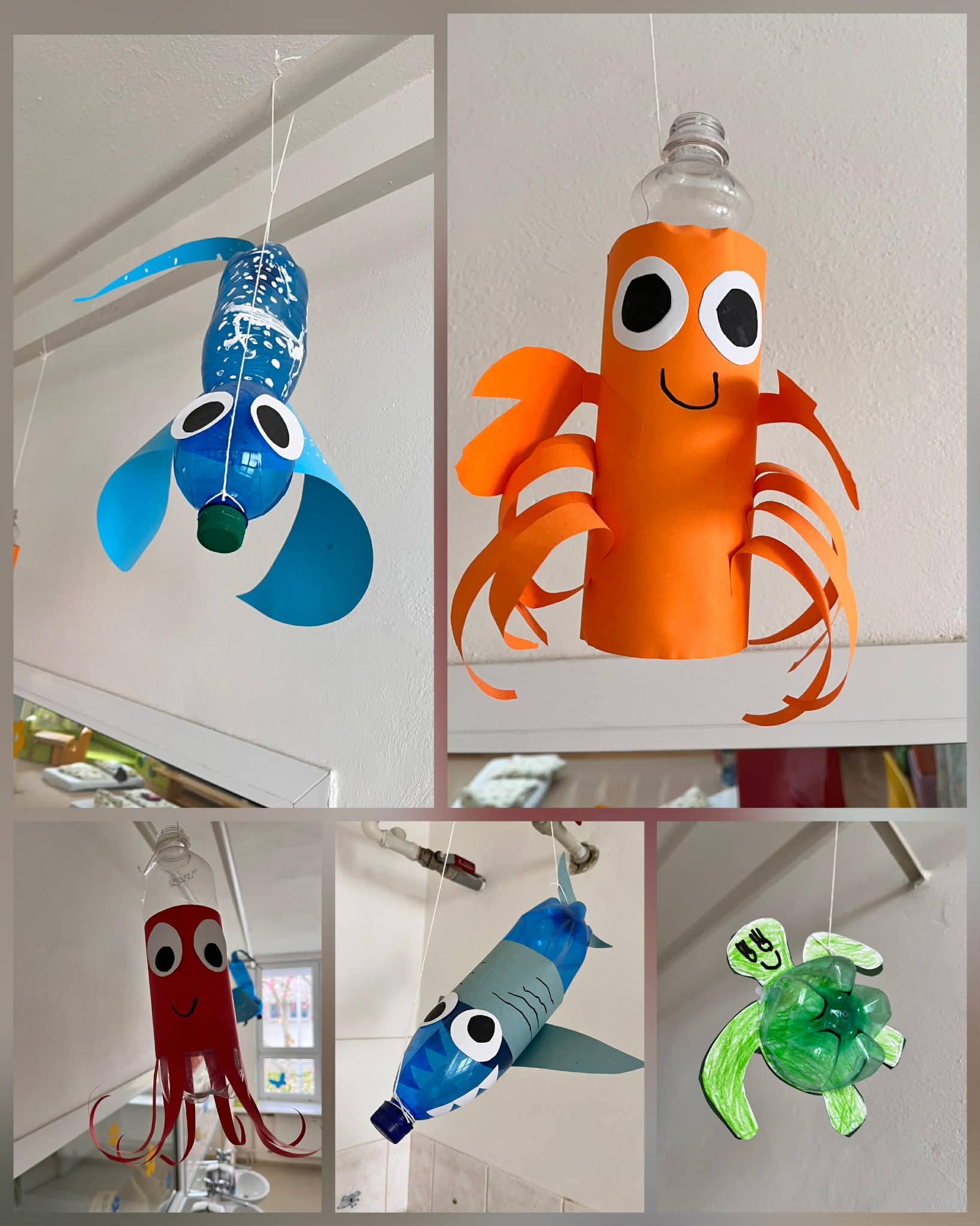 V rámci environmentální výchovy jsme s dětmi realizovali tvořivou aktivitu zaměřenou na výrobu mořských živočichů z odpadového materiálu. Využili jsme především PET lahve, barevné papíry a další dostupné pomůcky. Aktivita byla zároveň propojena s úkolem z EKOABECEDY „Co je dobré vědět o plastech a jejich rozumné spotřebě“, kdy jsme si s dětmi povídali o tom, odkud se plasty berou, jak je správně třídit a proč je důležité jejich používání omezovat. Součástí bylo také sledování krátkých videí na interaktivní tabuli o záchraně velryby Timmy, která dětem přiblížila důsledky znečištění oceánů plastovým odpadem. Na základě zhlédnutého jsme si povídali o tom, jak mohou lidé i děti přispět k ochraně přírody. Děti si nejprve povídaly o životě v moři – poznávaly základní druhy mořských živočichů (ryby, medúzy, chobotnice) a jejich prostředí. Následně si každý vybral, jakého živočicha vytvoří.