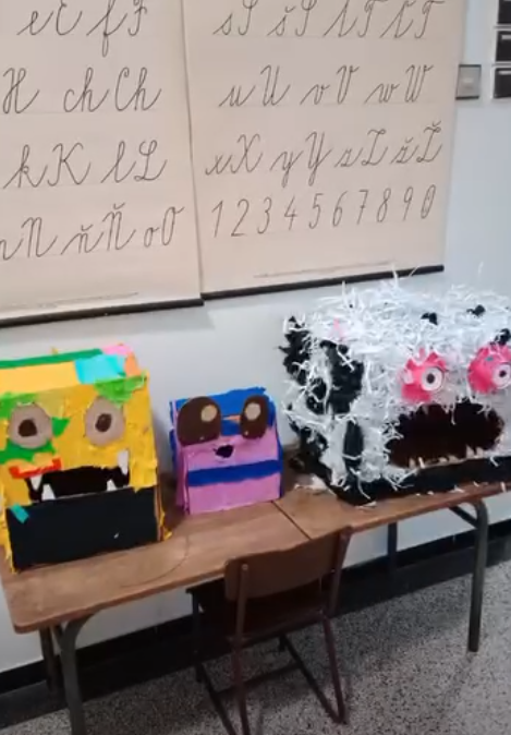 Nejprve jsme si připravili různé velikosti krabic, které se staly základem našich odpadkožroutů. Každá krabice představovala jednoho pomocníka – na tonery, baterky nebo mobily. Poté jsme krabice polepili skartonovaným papírem, aby byly pevnější a hezky upravené. Následně přišla na řadu fantazie a zdobení. Děti využily staré papírové kelímky, ze kterých vznikly nosy, uši nebo další zajímavé části obličejů. Ze zbytků krepového papíru po karnevalu jsme vytvořili barevné vlasy, obočí nebo ozdobné prvky. Na zuby jsme použili plato od vajec, které jsme nastříhali a přilepili do otvorů krabic jako veselé zubaté pusy. Ze zbytků papírů jsme vystřihli oči různých tvarů a velikostí, díky nimž získal každý odpadkožrout svůj vlastní výraz a osobnost. Nakonec jsme všechny výrobky dokončili, popsali, k čemu slouží, a umístili je na určené místo.