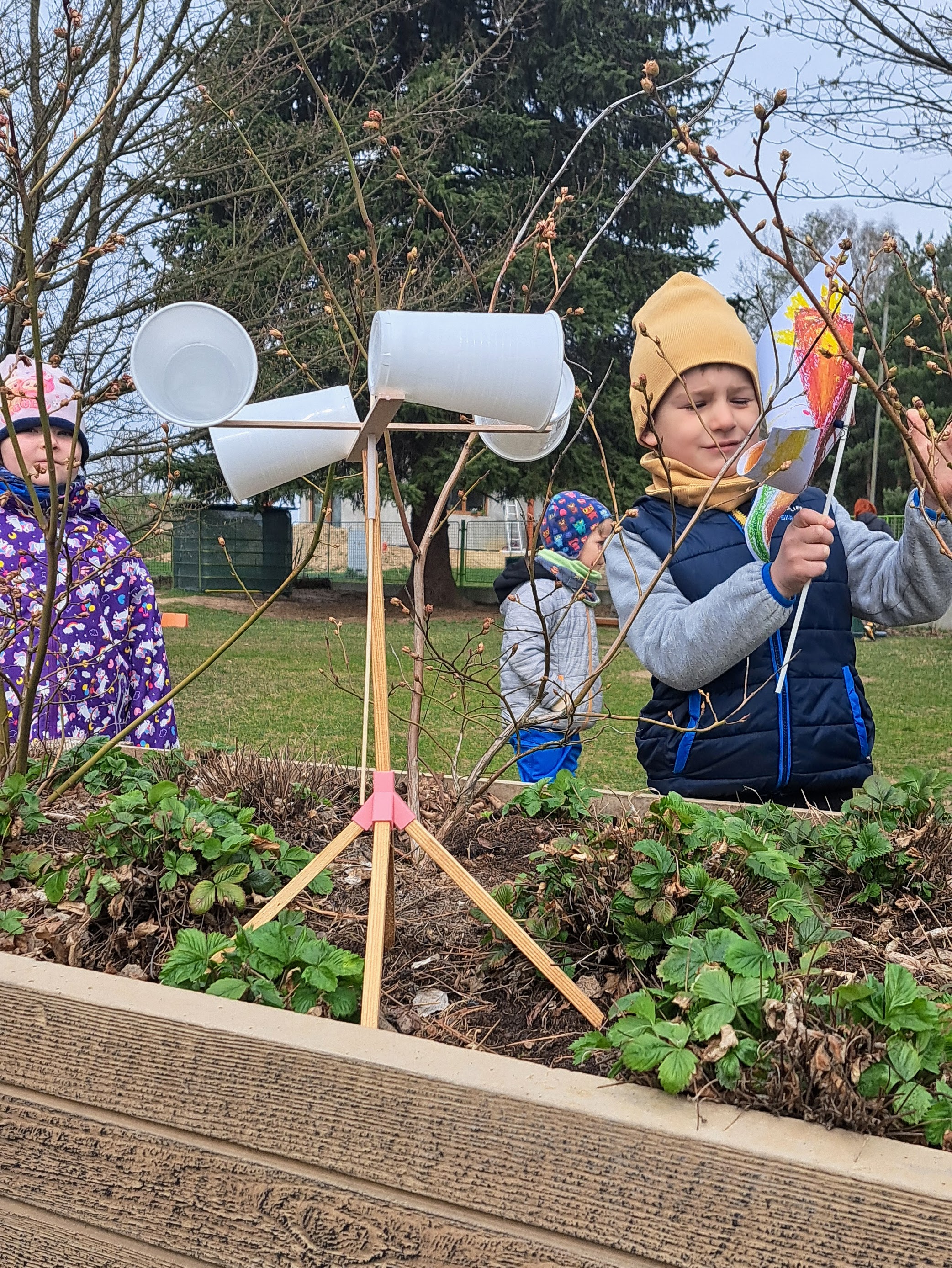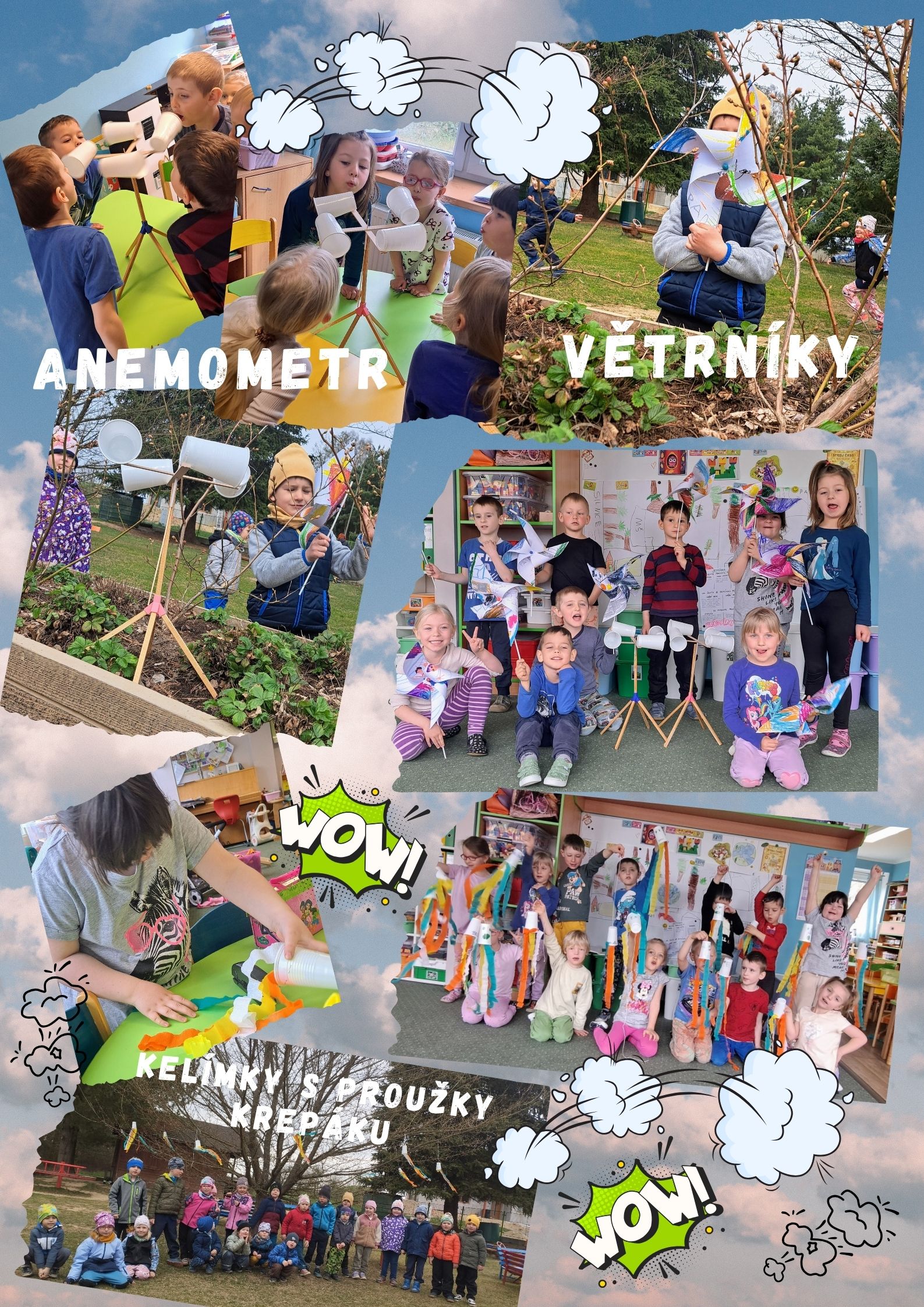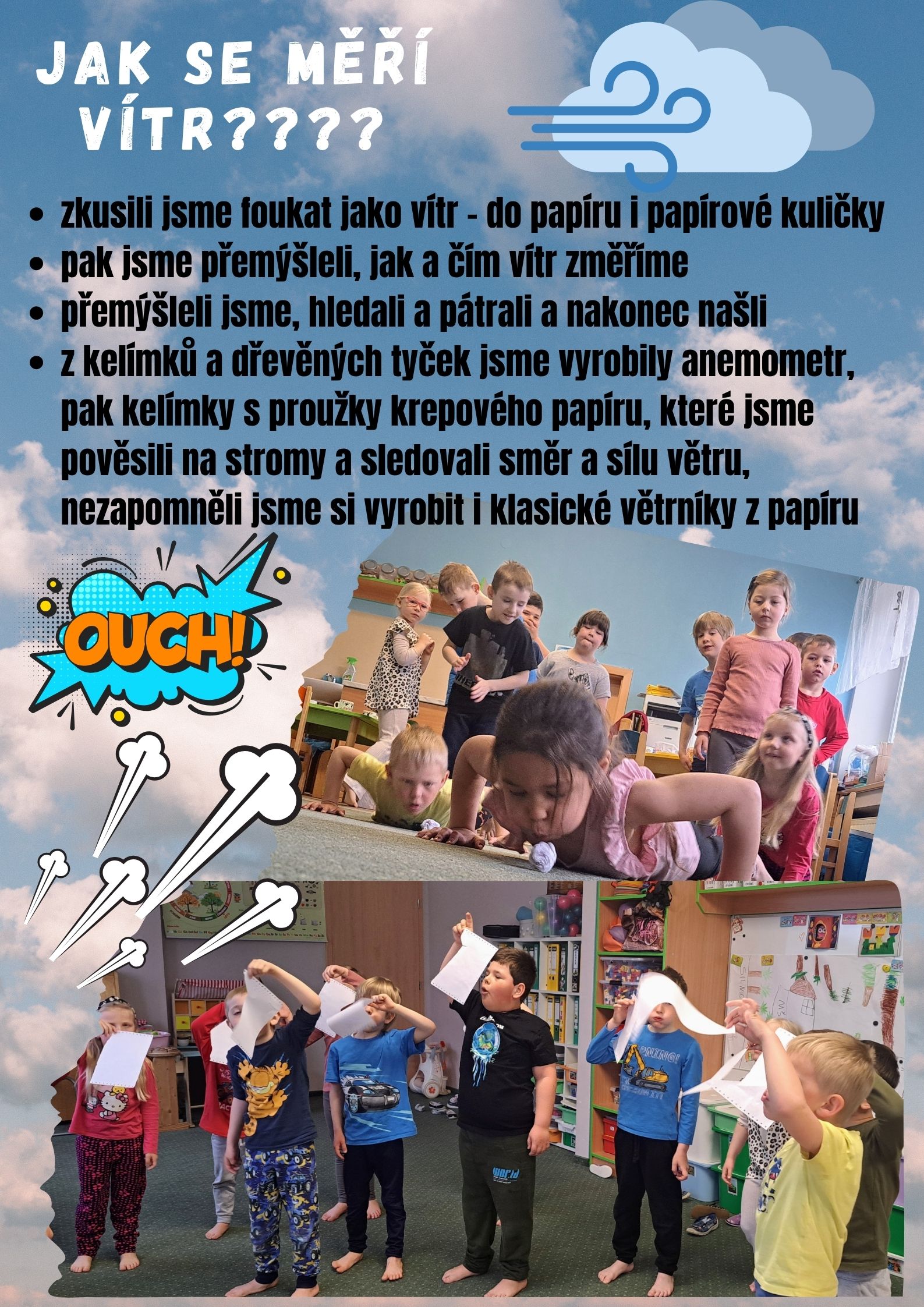 Přemýšleli jsme, jak změřit vítr. Vyzkoušeli jsme větrníky, anemometry a kelímky s proužky krepového papíru.