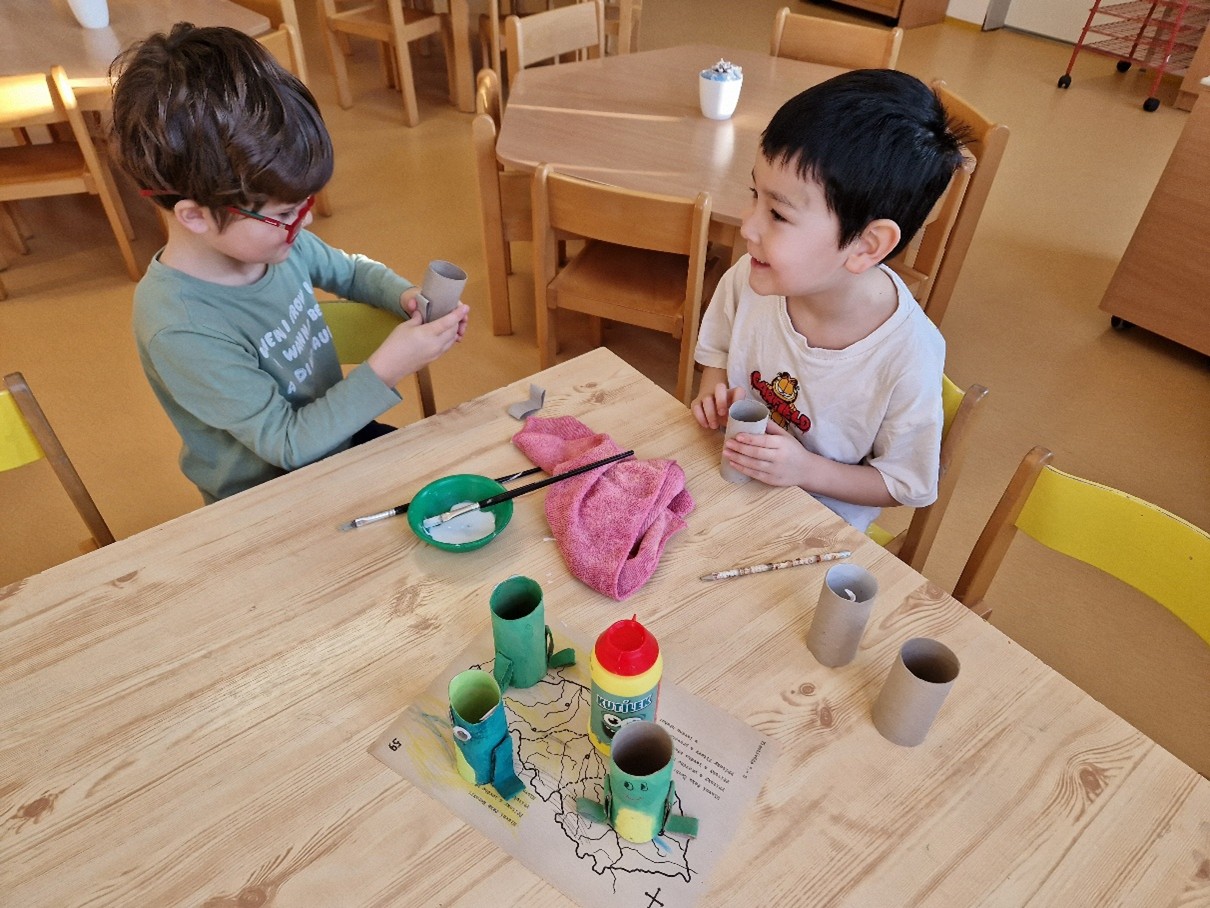 Děti z mateřské školy plnily úkol z Recyklohraní, Ekoabecedu aneb na cestě k odpovědné spotřebě, kde si v rámci tohoto úkolu vyrobily žabičku z ruličky od toaletního papíru. Děti nejdříve přilepily žabičce nohy - viz fotografie (odstřižený kousek z ruličky toaletního papíru) a poté celou ruličku-žabičku namalovaly temperovými barvami na zelenou barvu. Po zaschnutí barvy děti žabičce dolepily oči a měly z vyrobené žabičky radost, obzvlášť proto, že děti jsou ze třídy Žabiček. Cíl aktivity: recyklace odpadního materiálu.