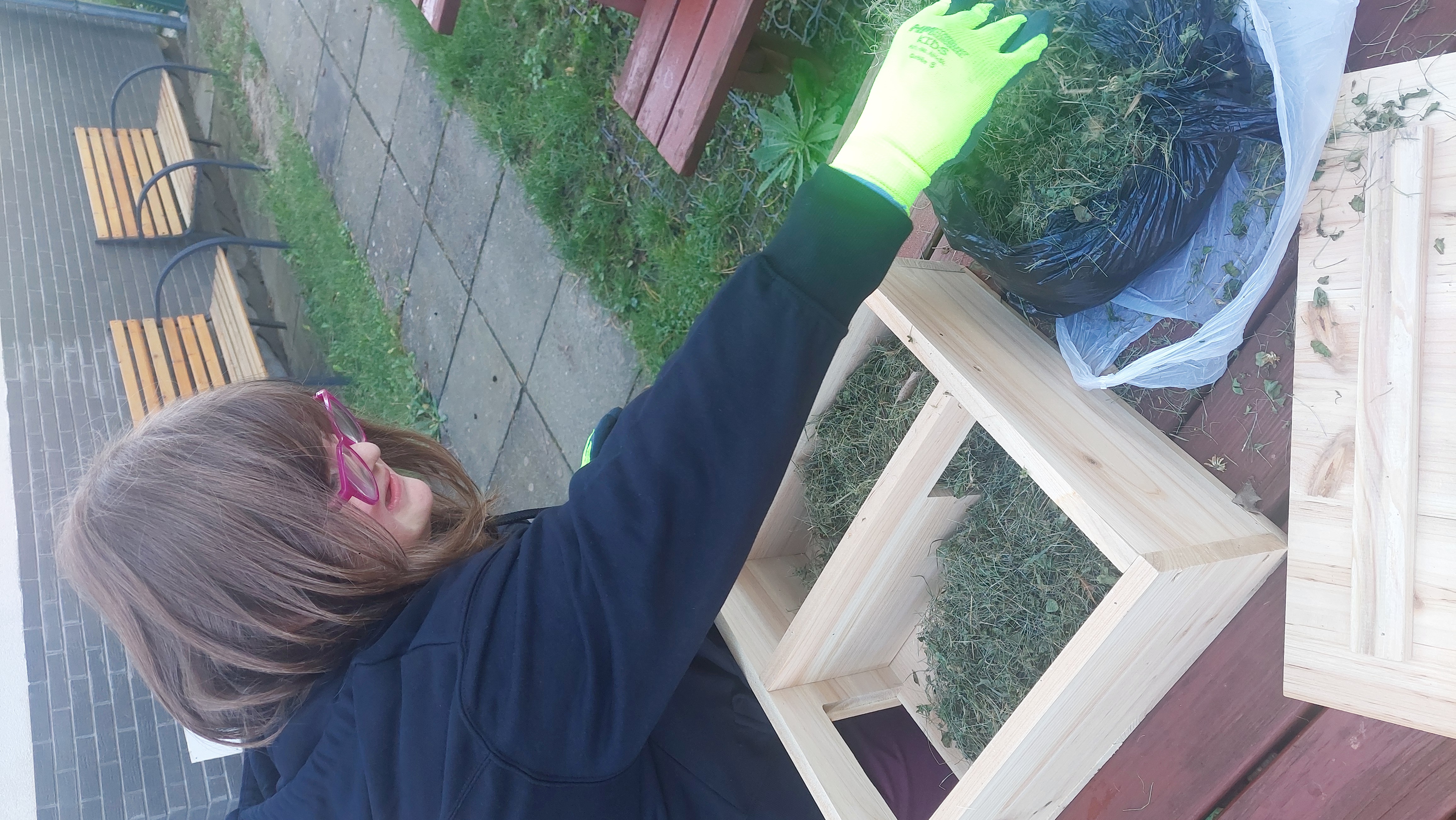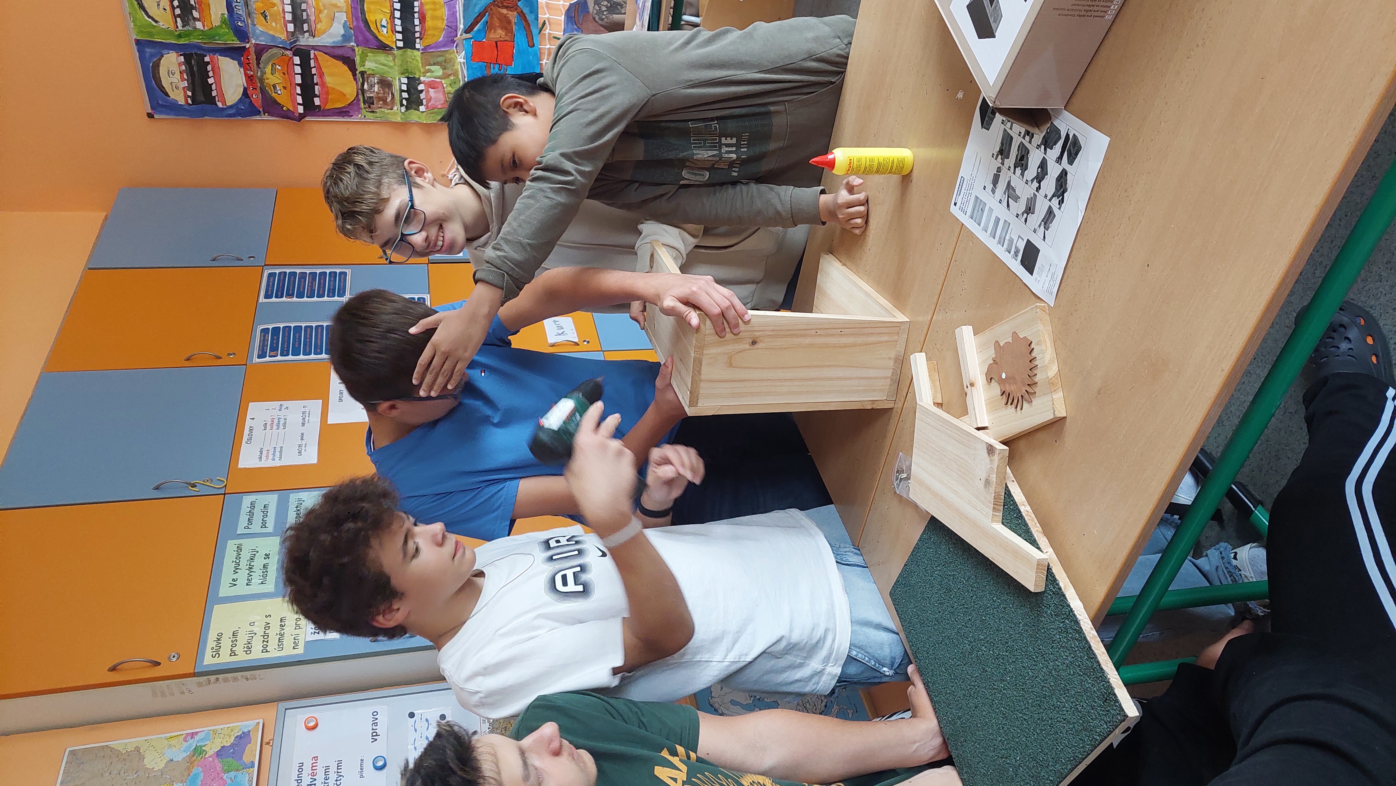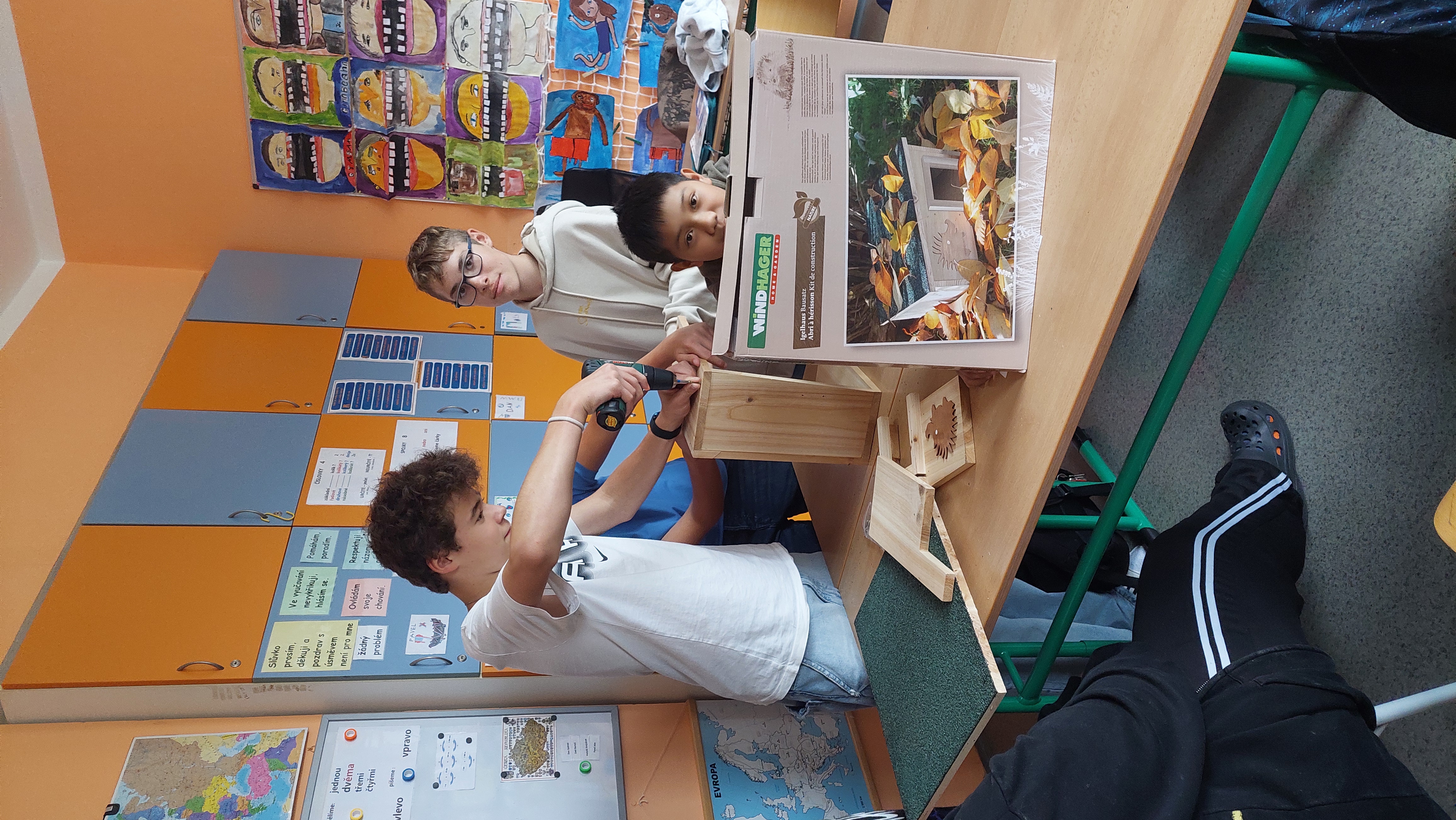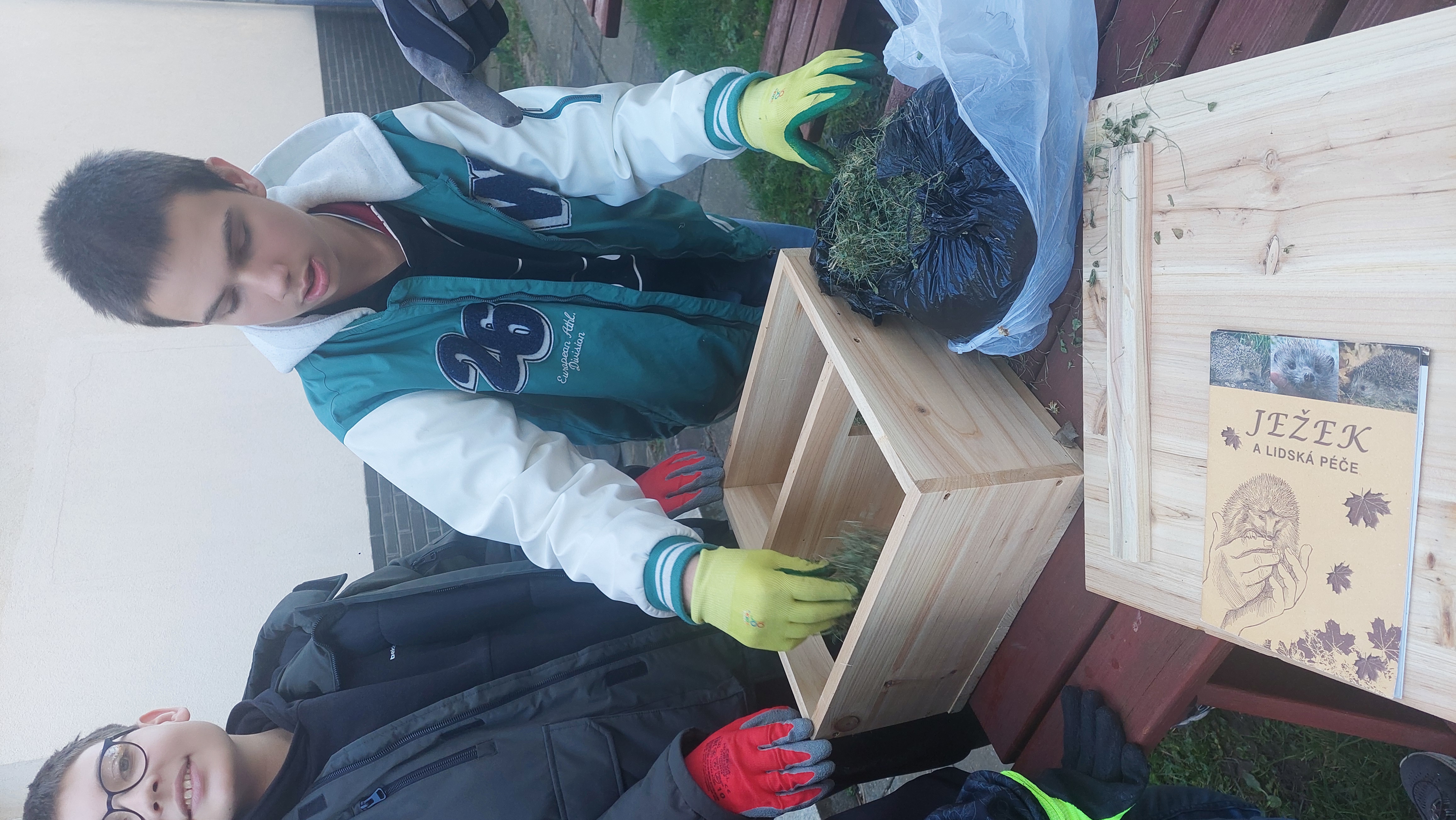 Přivítejte do školní zahrady ježky. Žáci ježčí domeček při Pč složili, vyplnili vhodným nateriálem a společně vybrali místo v zahradě a umístili.