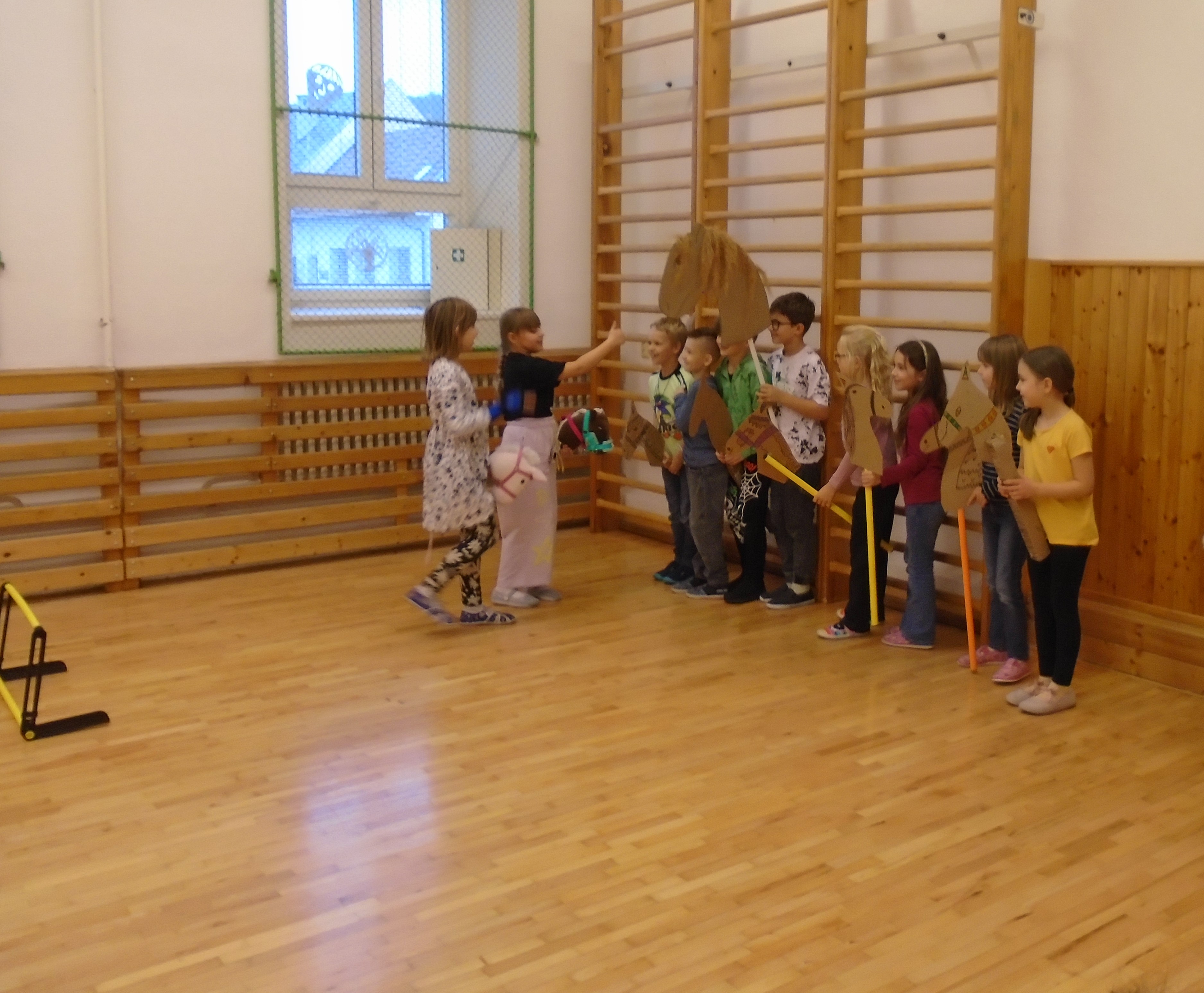 Ve školní družině jsme si vyrobili z kartonových krabic hlavy koníků, které si děti pomalovaly a připevnili jsme je na různé paličky. V tělocvičně jsme uspořádali závody v běhu a přeskocích přes překážky. Vysvětlili jsme si, co je parkur a hobby horsing. Pro děti to byla názorná ukázka, jak využít karton, než skončí v kontejneru. Tuto aktivitu jsme měli v rámci projektového dne ke svatém Martinovi.