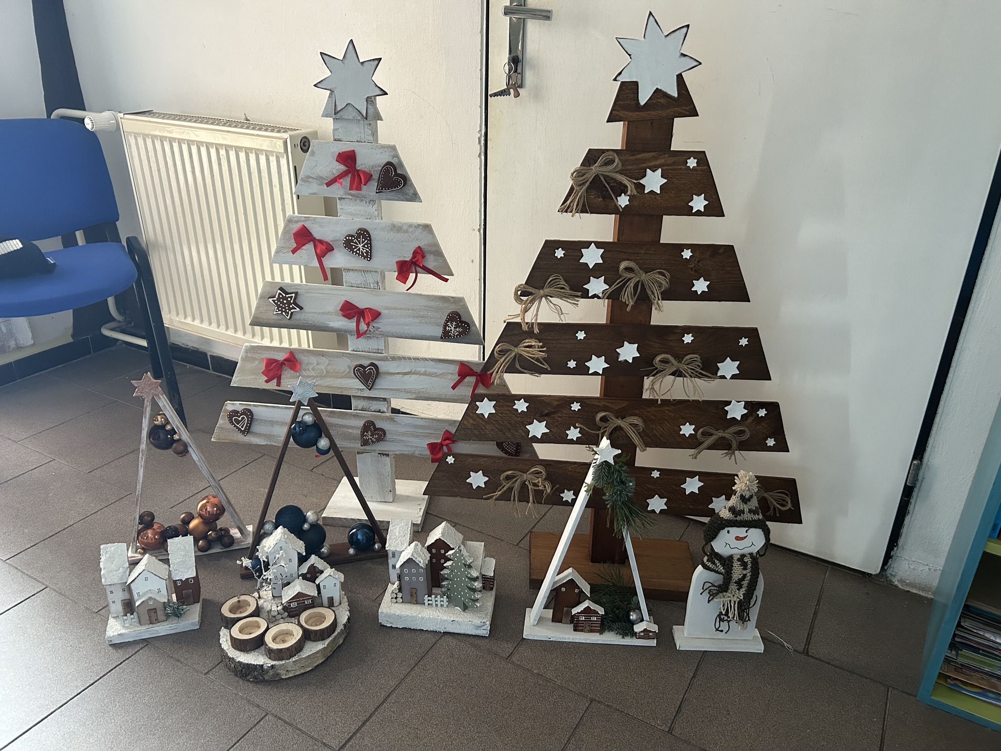 Při vánočním tvoření jsme zužitkovali odpadový materiál - palety, překližku z obložení, odřezky z trámů (obnova střech ve městě). Pak už se jen řezalo, brousilo, natíralo, zdobilo. Starší žáci dělali náročnější práce, mladší žáci brousili, natírali.