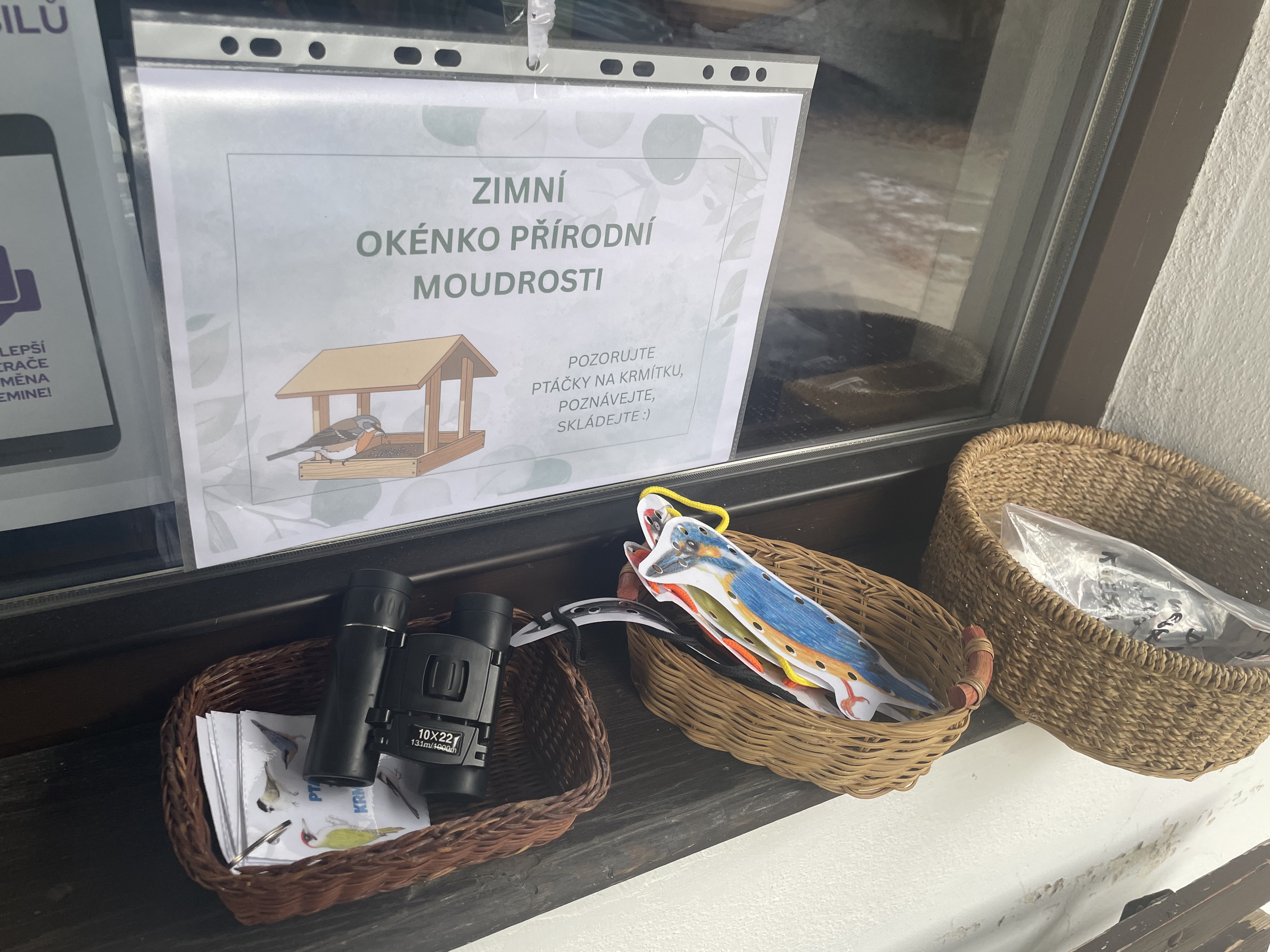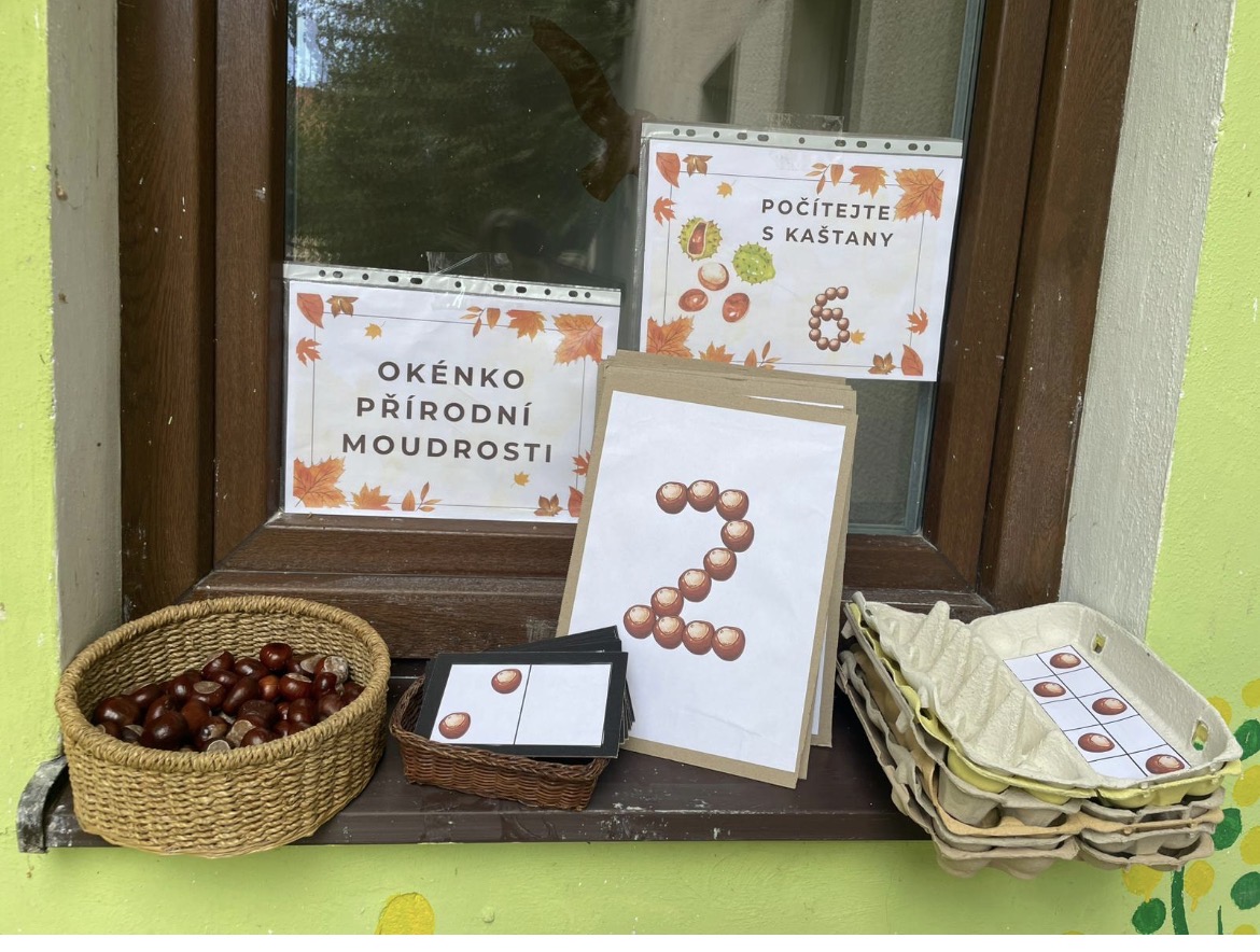 Cílem aktivity je zvýšit citlivost a vnímavost dětí k přírodě, aby byli motivováni ji chránit. Každého čtvrt roku na jedno z oken školy dáváme didaktické pomůcky z přírodních materiálů, na kterých si děti mohou procvičit naučené vědomosti z českého jazyka, matematiky. Inspirujeme se na stránce "učíme venku". Na podzim jsme počítali s kaštany, tvořili jsme mapu ČR z přírodních materiálů (nížiny ze zelených větviček a listí, pohoří z hnědého listí, z hlíny a hory z kamenů, hranice z větviček). Nyní pozorujeme dalekohledem ptáčky na krmítku, při práci s klíčem k určování ptáčků si procvičujeme čtení, hrajeme si s pírky...