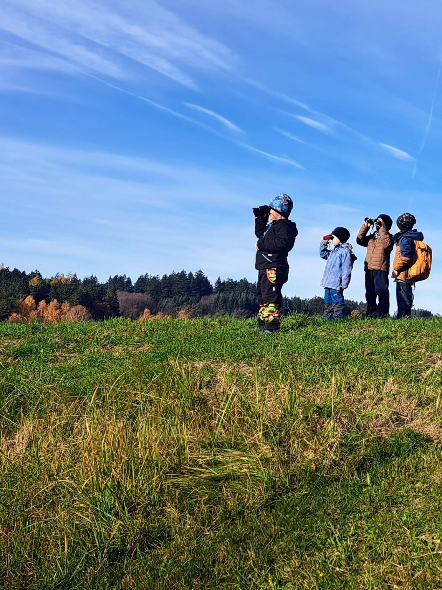 Celodopolední výprava s dalekohledy. Dlouhá procházka do přírody s cílem pozorovat oblohu a vidět migrující ptáky. S sebou, kromě pití a svačiny, neseme také vytištěné a zalaminované obrázky ptáků a jejich stínů. Obrázky rozmístíme v lese, děti rozdělíme na skupiny, které mají za úkol obrázky najít a přiřadit.