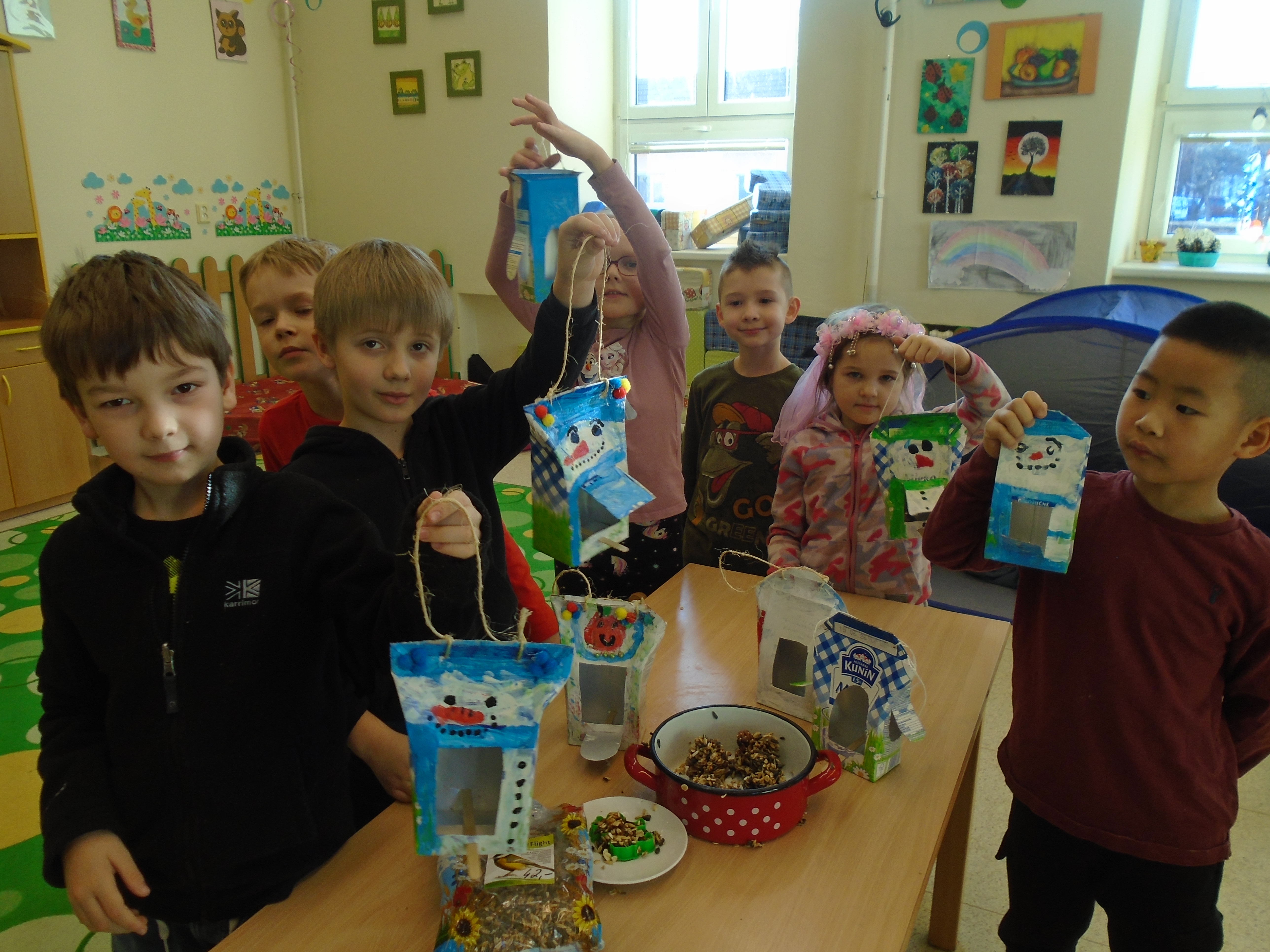 Ve ŠD jsme si vyprávěli o složení, využití a recyklaci nápojových kartonů. Děti si přinesly krabičky od mléka, ze kterých jsme následně vyráběli krmítko pro ptáčky.