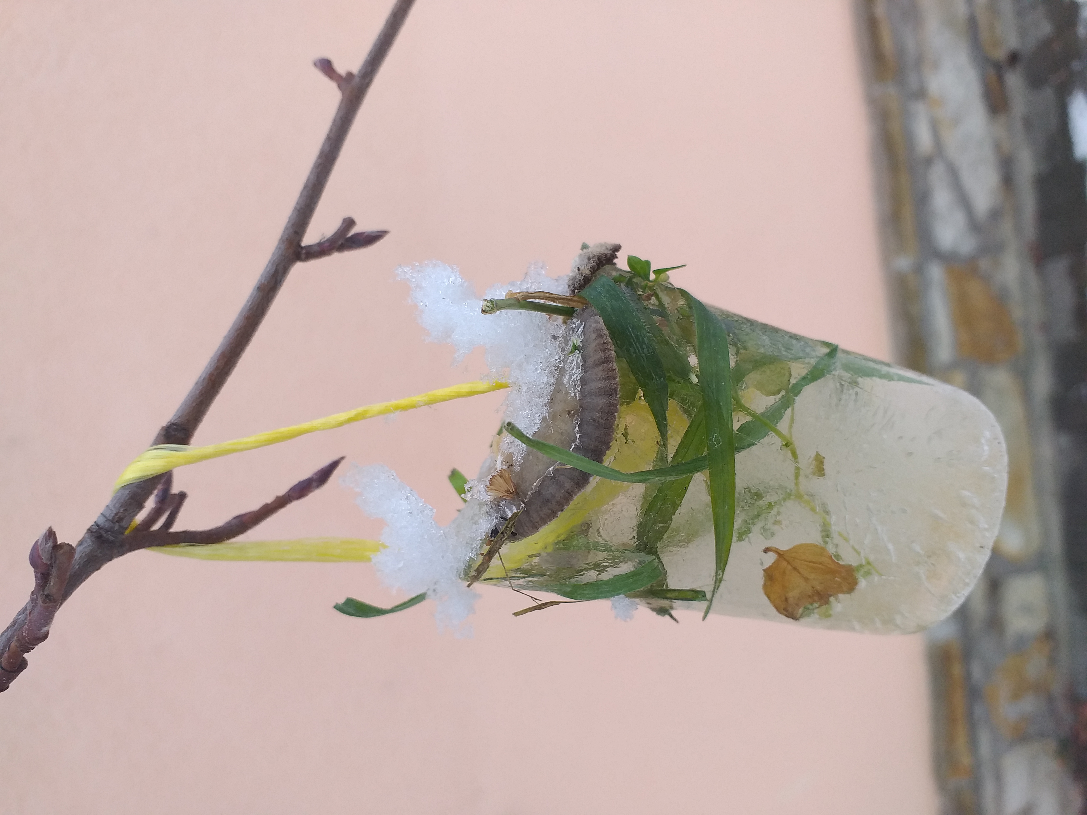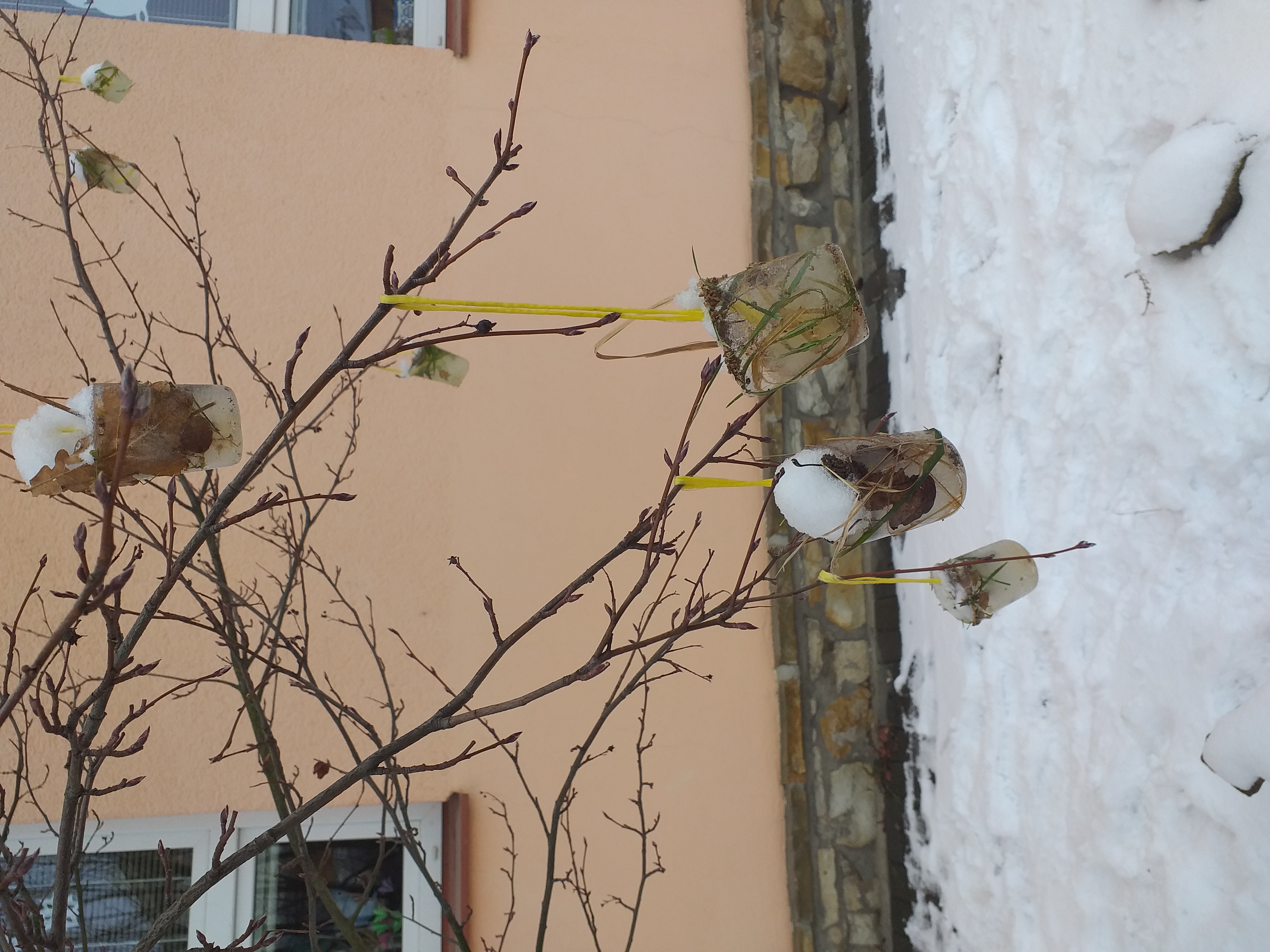 Při pokusech se sněhem jsme vodu z rozpuštěného sněhu využili k výrobě ledových ozdob. Využili jsme nejenom vodu, ale také kelímky od jogurtů.