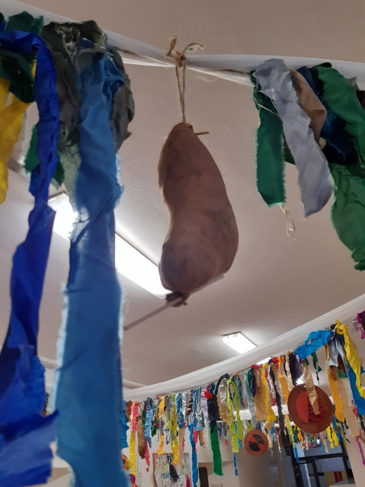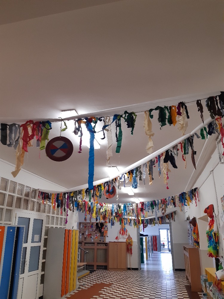V rámci projektu Recyklovaný masopust žáci využili staré látky, trička a silonové punčocháče k výrobě masopustní výzdoby. Z recyklovaného textilu vytvořili dekorace, které pak instalovali na chodbě školy. Aktivita podpořila tvořivost žáků a vedla k praktickému uplatnění principů udržitelnosti.