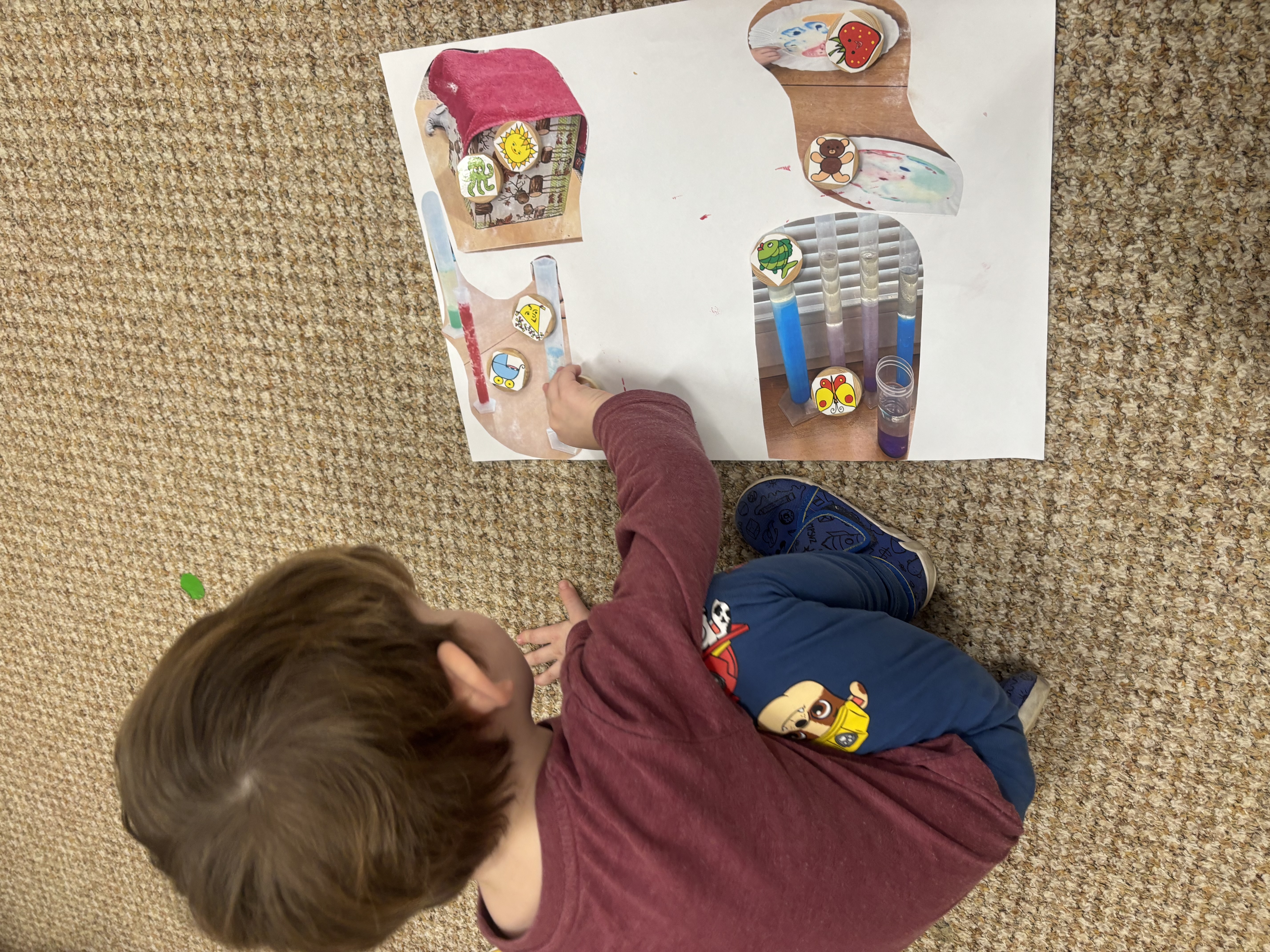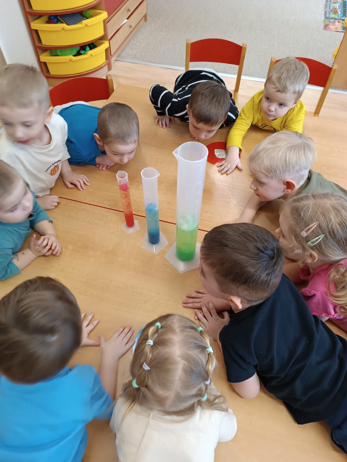 Děti 2-3 leté "kouzlily a čarovaly", byly účastníky pokusů a experimentů, při kterých pozorovaly reakci oxidu uhličitého v šumivé tabletě a vody, kdy bubliny prostupují neobarveným olejem v odměrném válci nahoru. Dále klesání barvy z obarvené ledové kostky v odměrném válci vodou dolů a neobarvený olej zůstávající nad hladinou vody. Zjistily tak, že olej je lehčí, než voda. Pokusy bedlivě sledovaly a i přes svůj věk 2-3 roky jej dokázaly popsat a vyhodnotit. To, který si nejlépe zapamatovaly, co se jim nejvíce líbilo vybraly a zhodnotily tak, že svou značku položily na fotografii toho pokusu, který byl jejich nejoblíbenější.