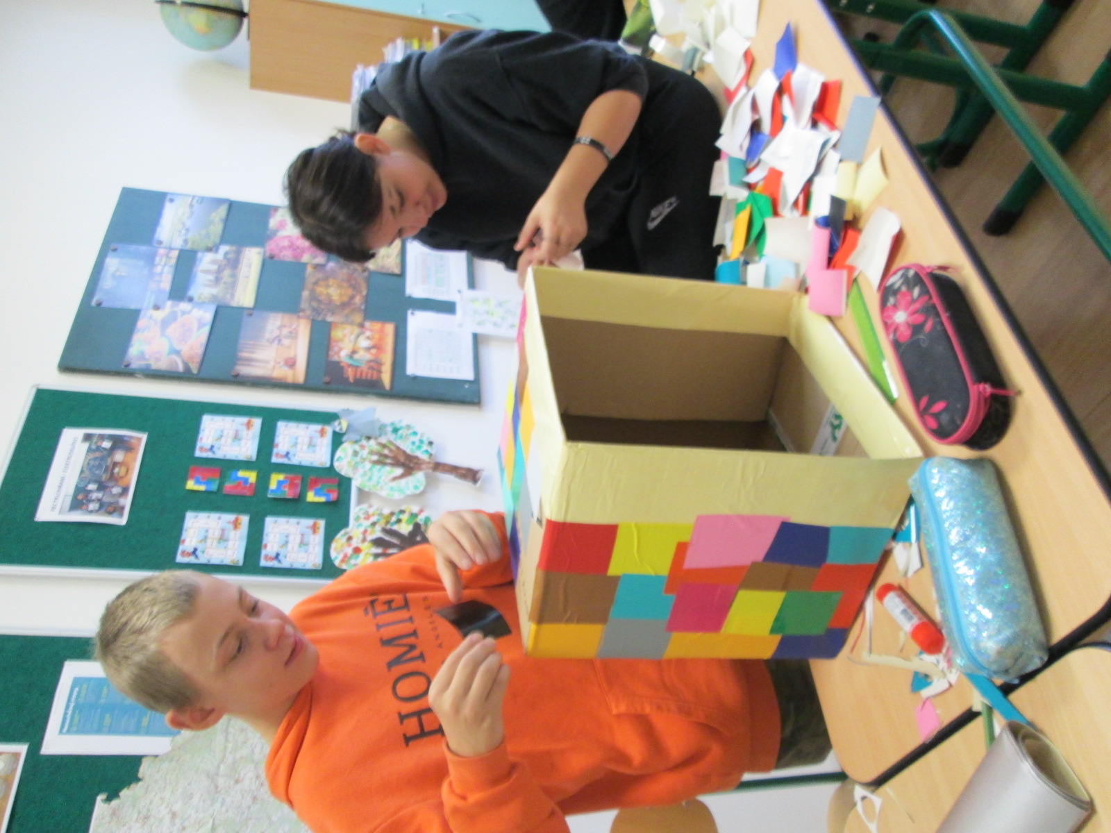 Z reklamní agentury jsme dostali odřezky samolepících tapet. Žáci z nich vystřihovali menší kousky a těmi polepovali krabice. Polepené krabice jsme pak umístili ve třídách a školní družině, kde je využíváme ke třídění odpadového papíru.